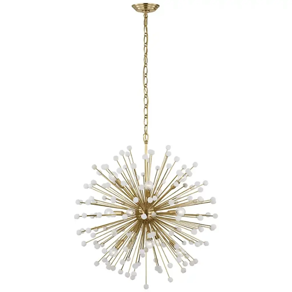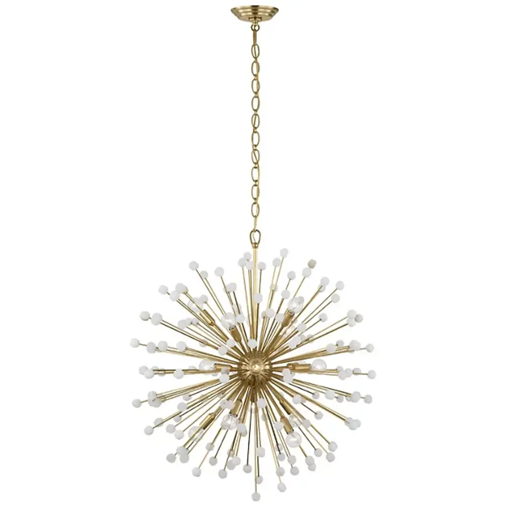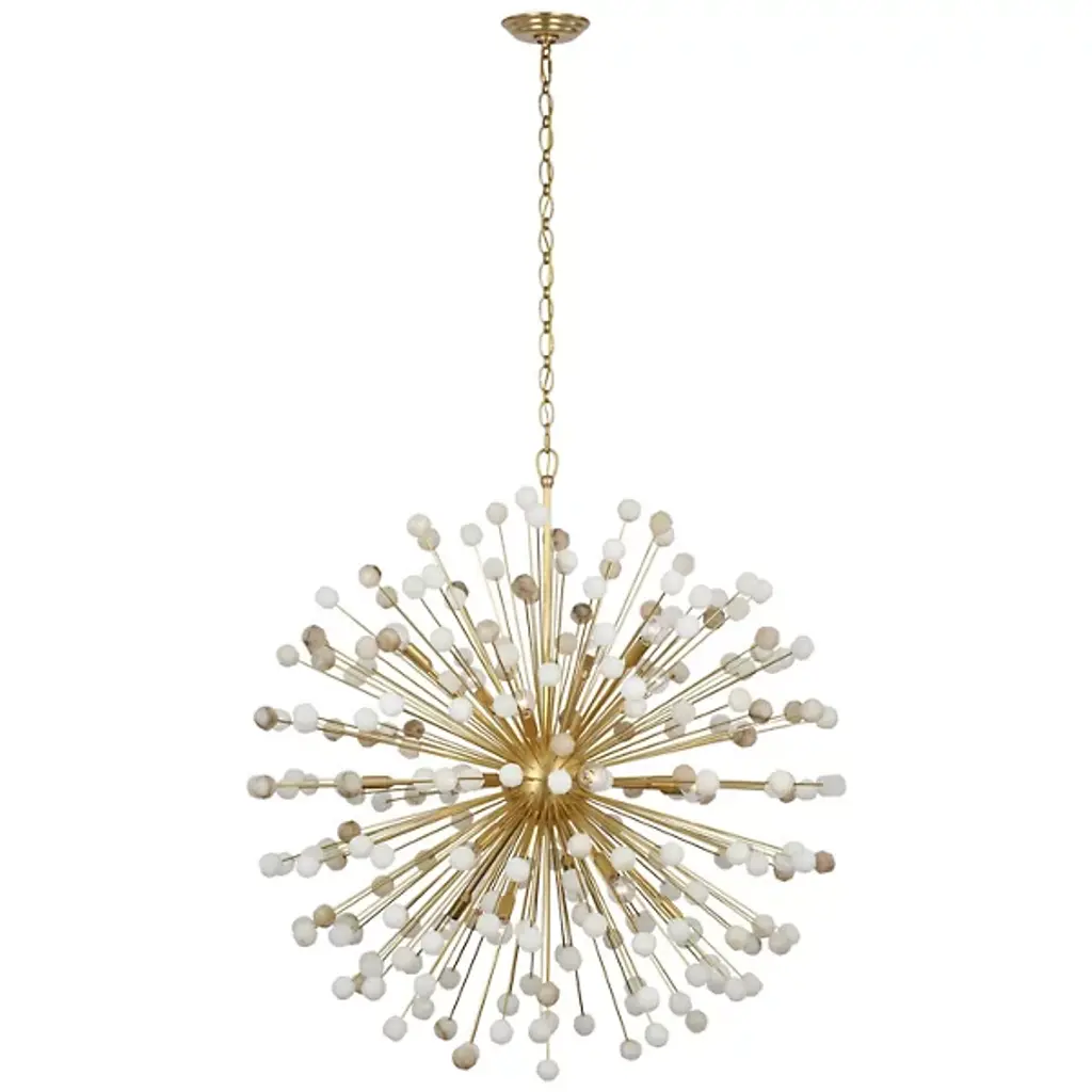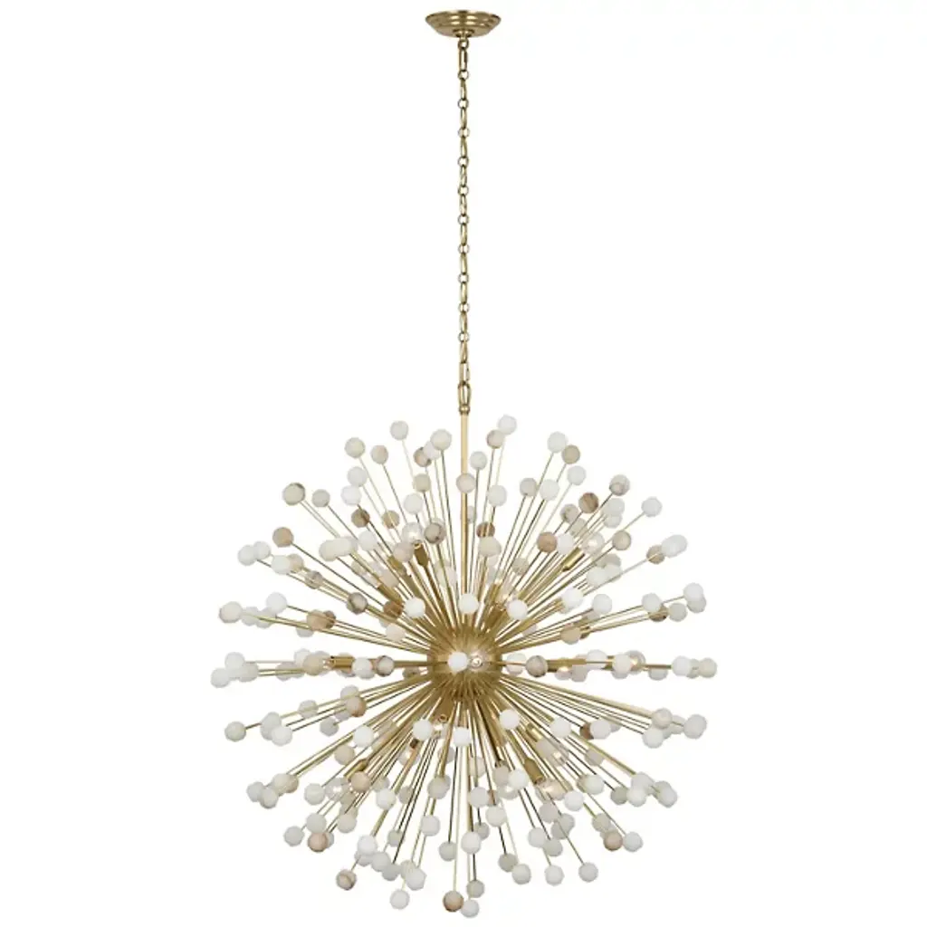 The Lys Chandelier from Visual Comfort Signature orchestrates a spectacular burst of radiance through its dynamic Sputnik design. Multiple arms radiate from the central sphere, each extending outward like frozen fireworks. The brass and alabaster composition by Suzanne Kasler delivers a theatrical display where each crystalline point of light multiplies across the space. This celestial-inspired fixture elevates spaces through its precise geometric arrangement and artful distribution of light.