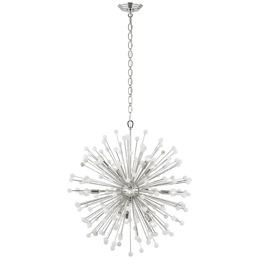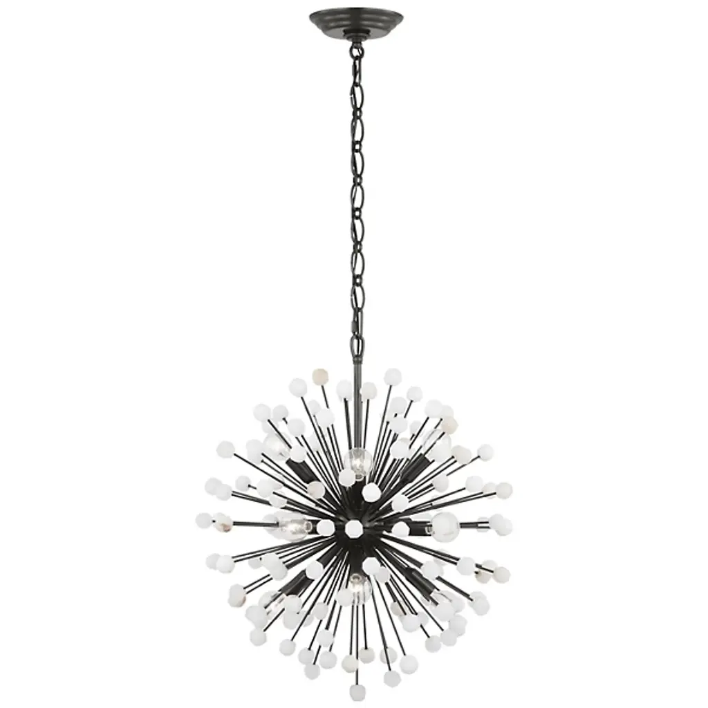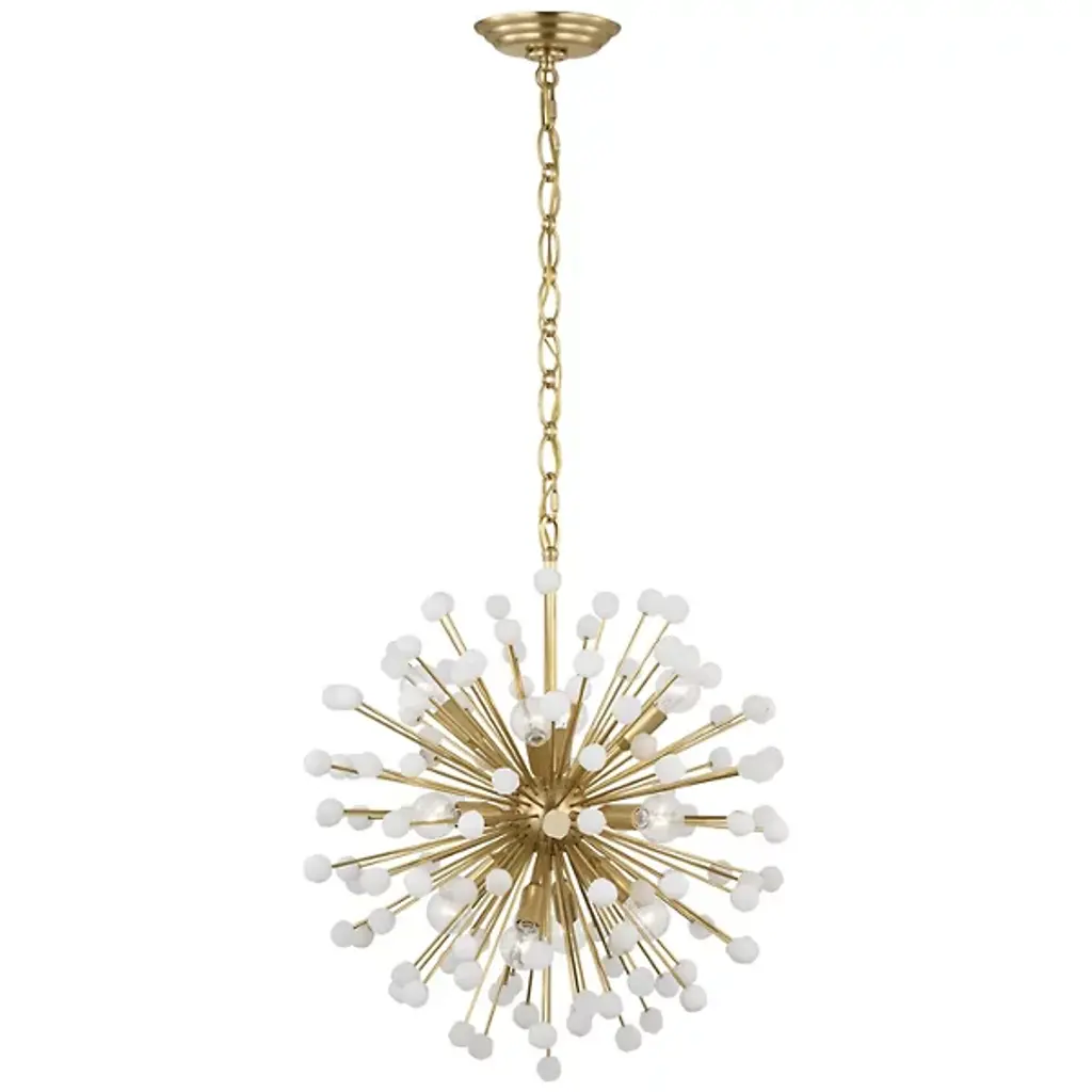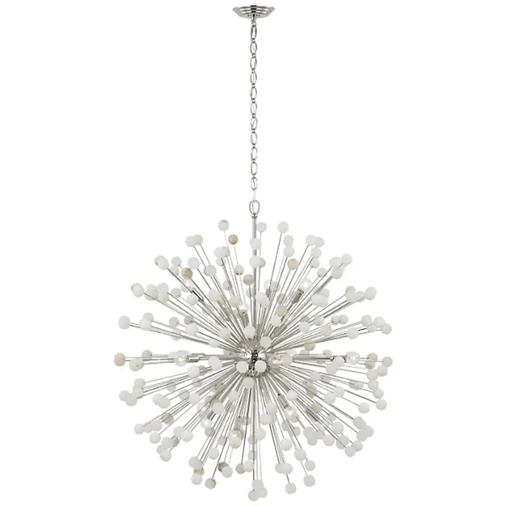 The Lys Chandelier from Visual Comfort Signature orchestrates a spectacular burst of radiance through its dynamic Sputnik design. Multiple arms radiate from the central sphere, each extending outward like frozen fireworks. The brass and alabaster composition by Suzanne Kasler delivers a theatrical display where each crystalline point of light multiplies across the space. This celestial-inspired fixture elevates spaces through its precise geometric arrangement and artful distribution of light.