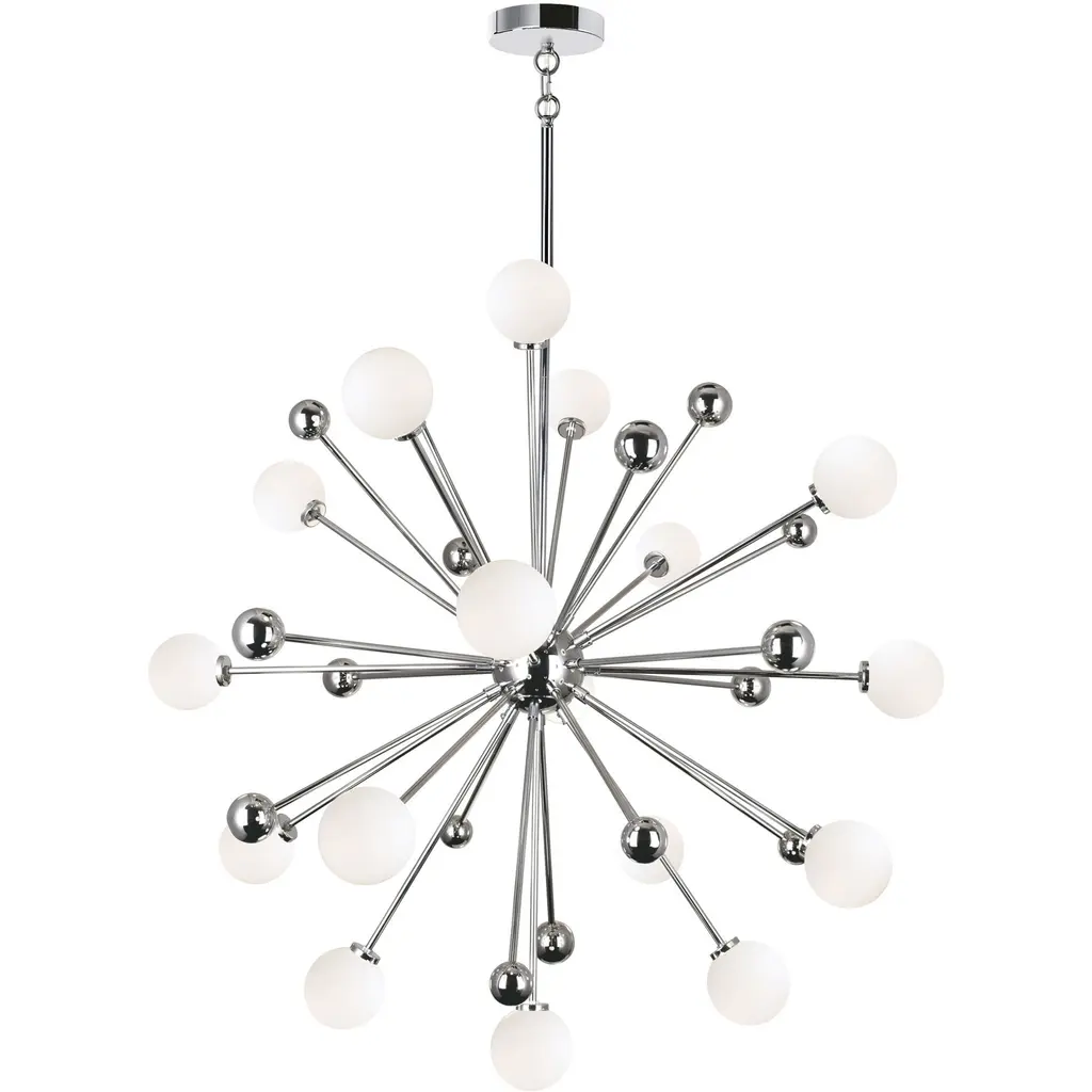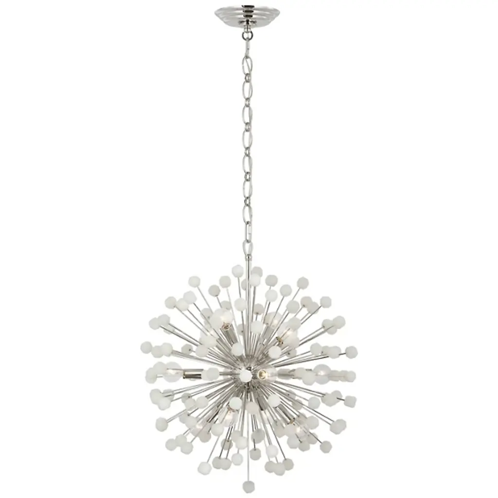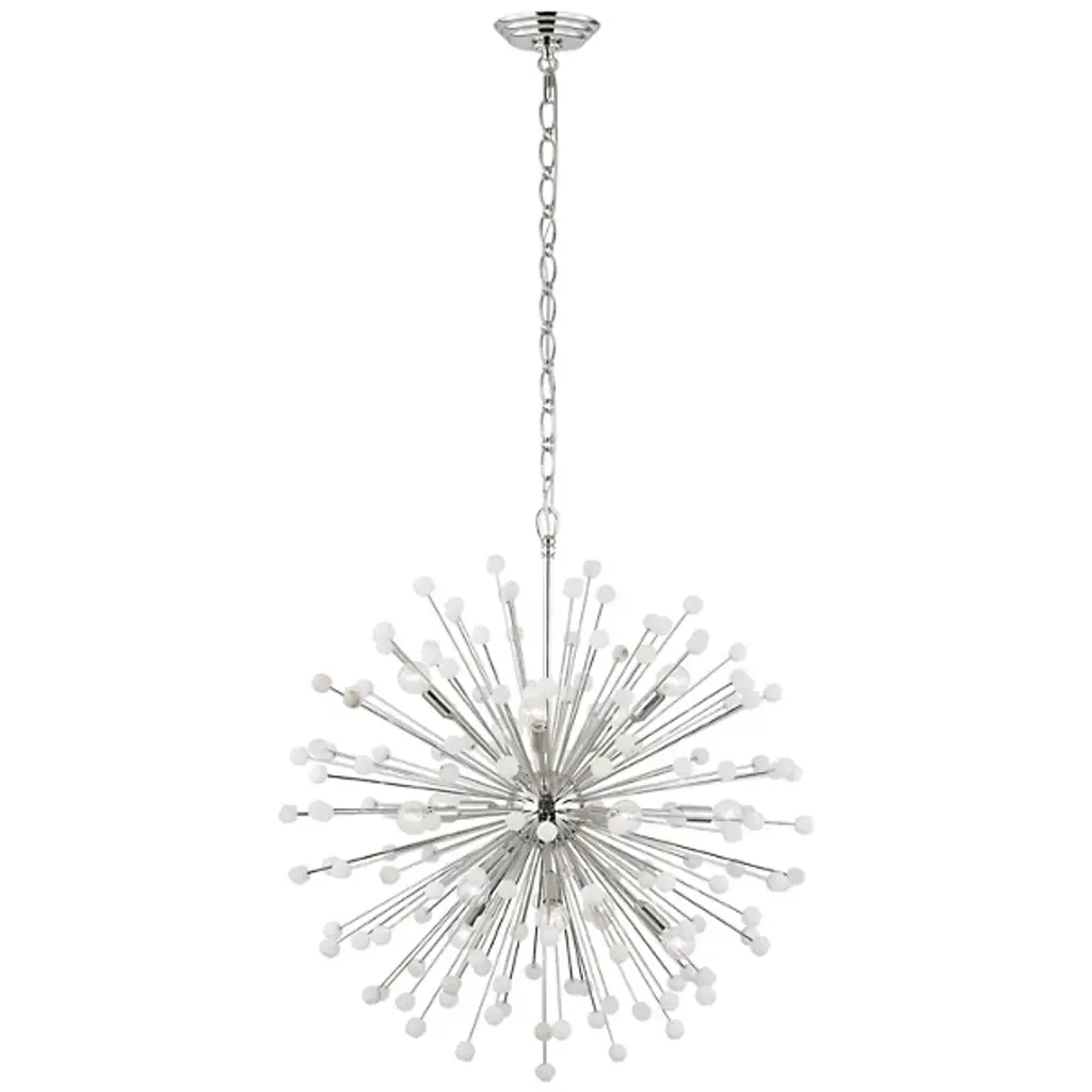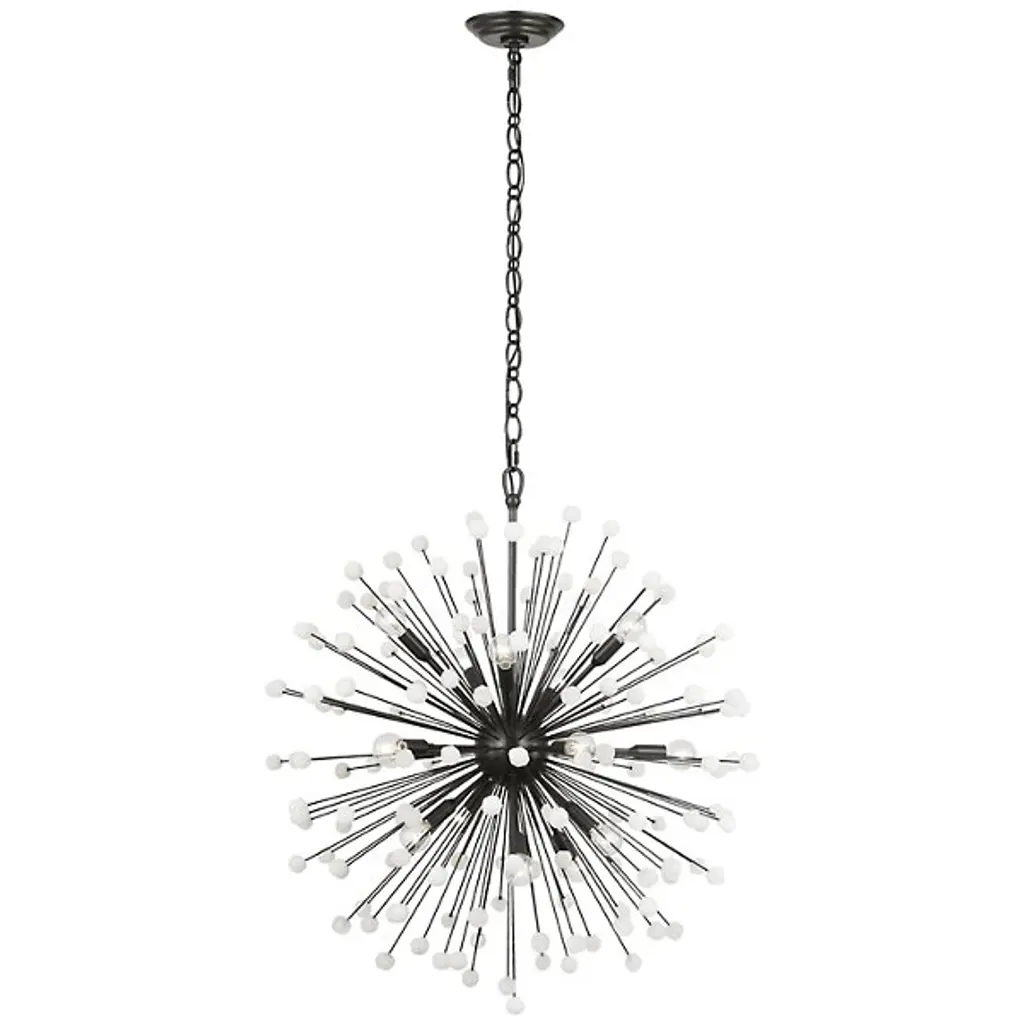 The Lys Chandelier from Visual Comfort Signature orchestrates a spectacular burst of radiance through its dynamic Sputnik design. Multiple arms radiate from the central sphere, each extending outward like frozen fireworks. The brass and alabaster composition by Suzanne Kasler delivers a theatrical display where each crystalline point of light multiplies across the space. This celestial-inspired fixture elevates spaces through its precise geometric arrangement and artful distribution of light.