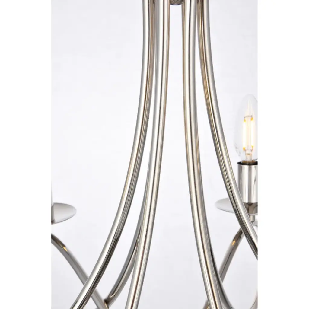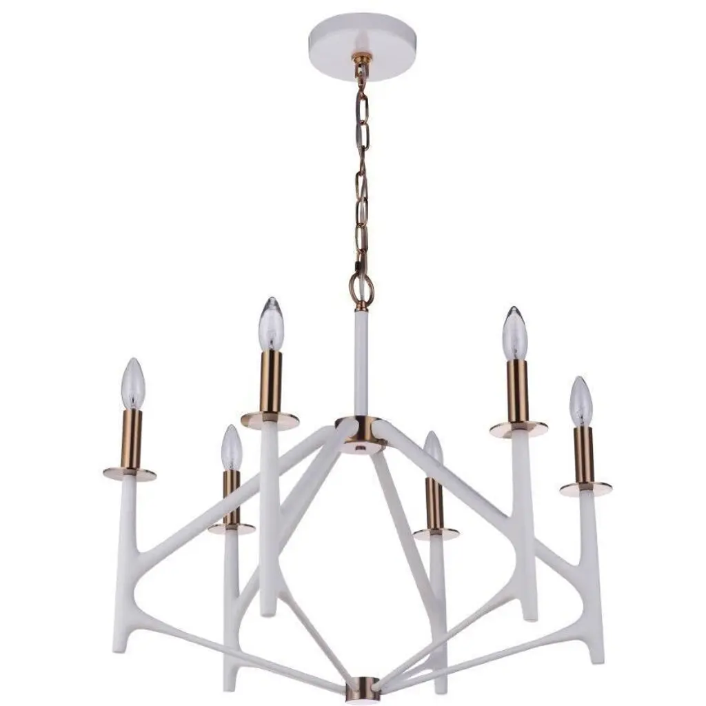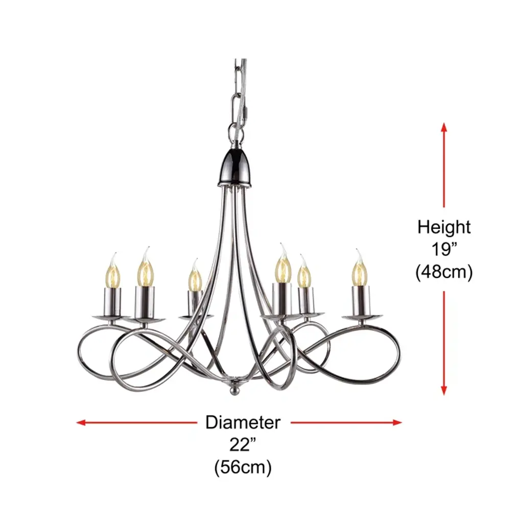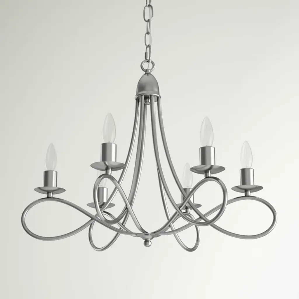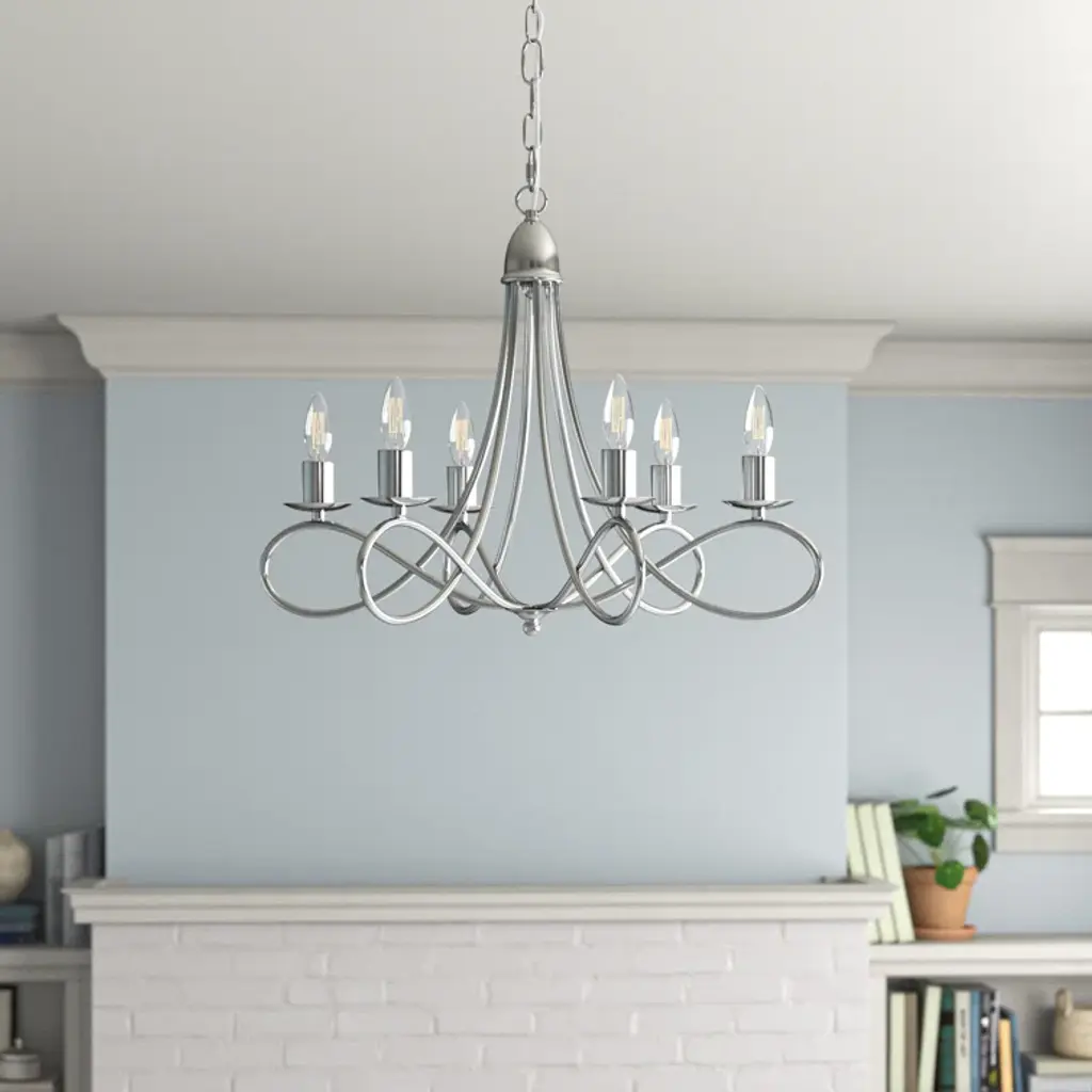 This 6-light chandelier combines traditional design with modern functionality, making it a standout piece in any room. Constructed from metal, it features six swooping arms that elegantly cradle sconces, casting a warm, ambient glow. The adjustable chain lets you customize the height to suit your space, and it's compatible with sloped ceilings for added versatility. Install it with a dimmer switch for a tailored brightness level experience. We recommend using B10 bulbs (sold separately) to enhance its timeless appeal.
