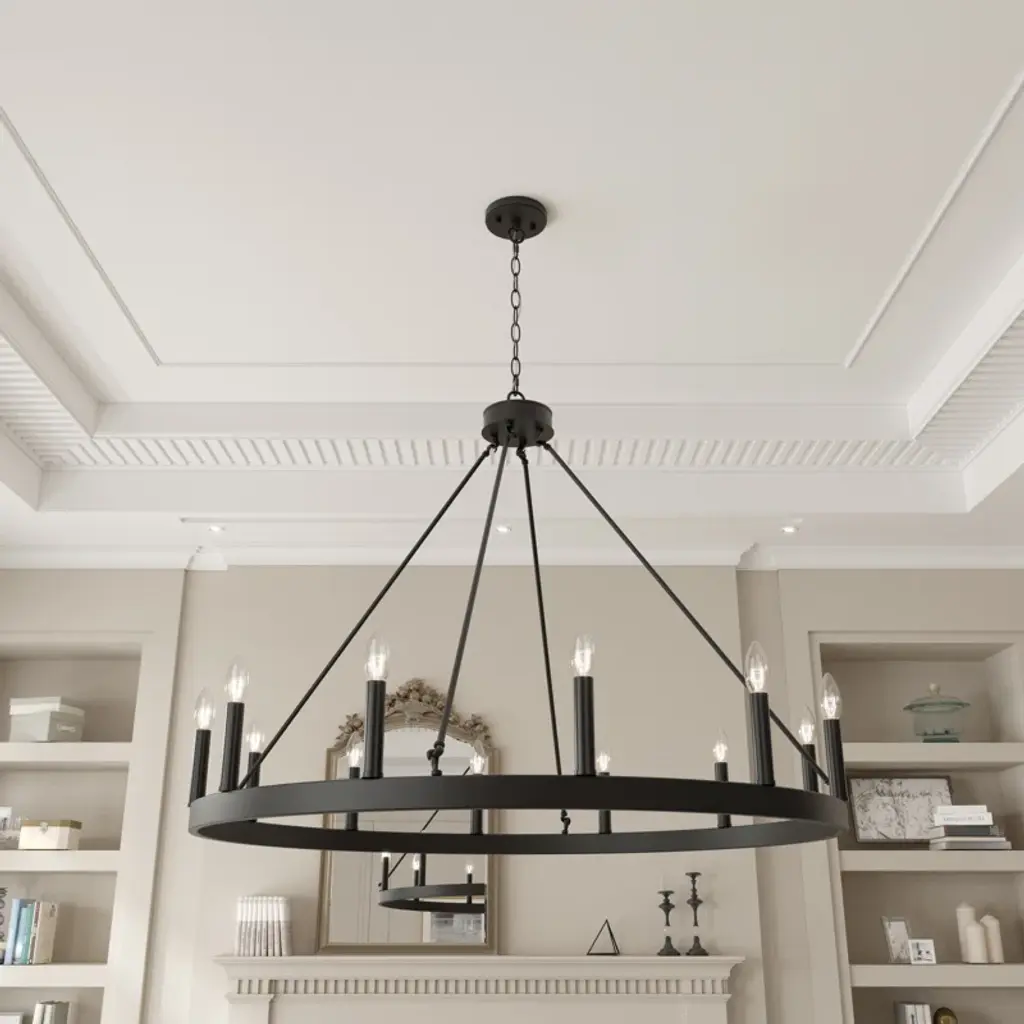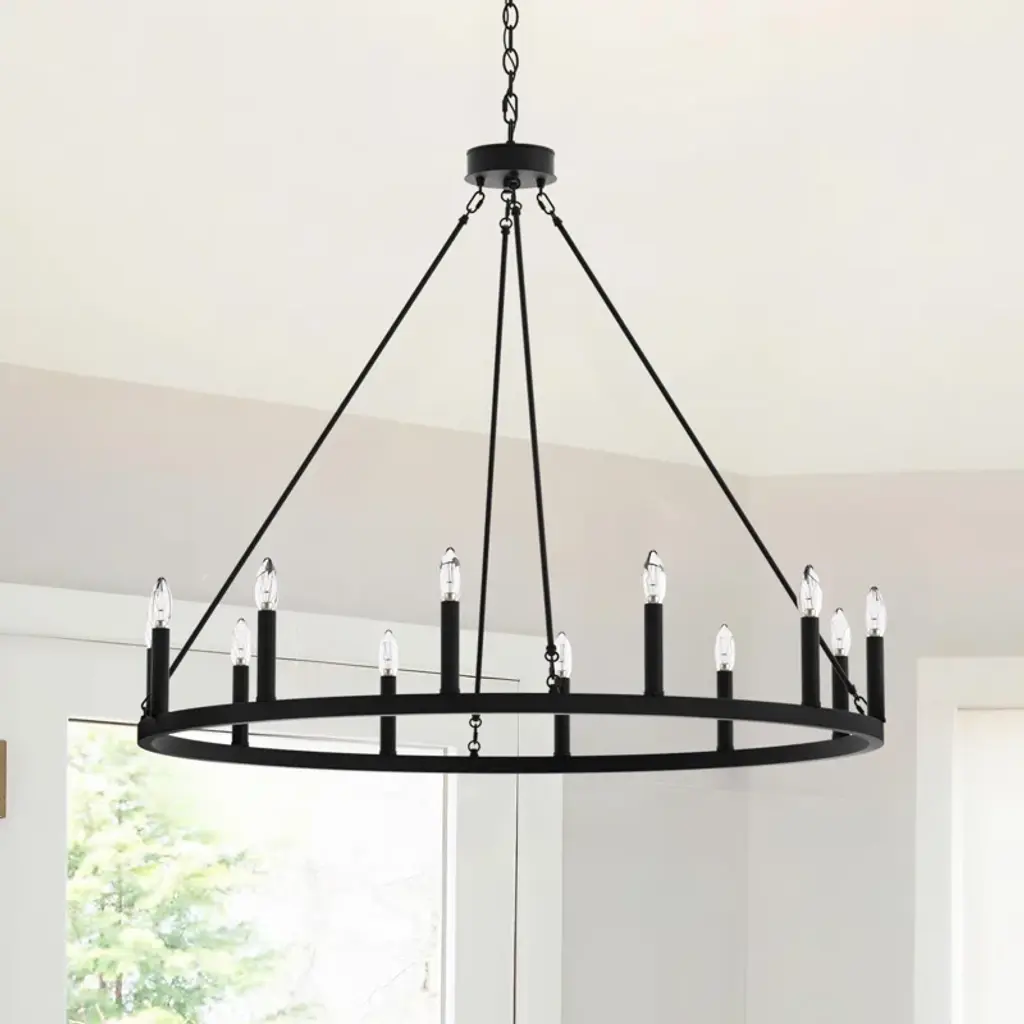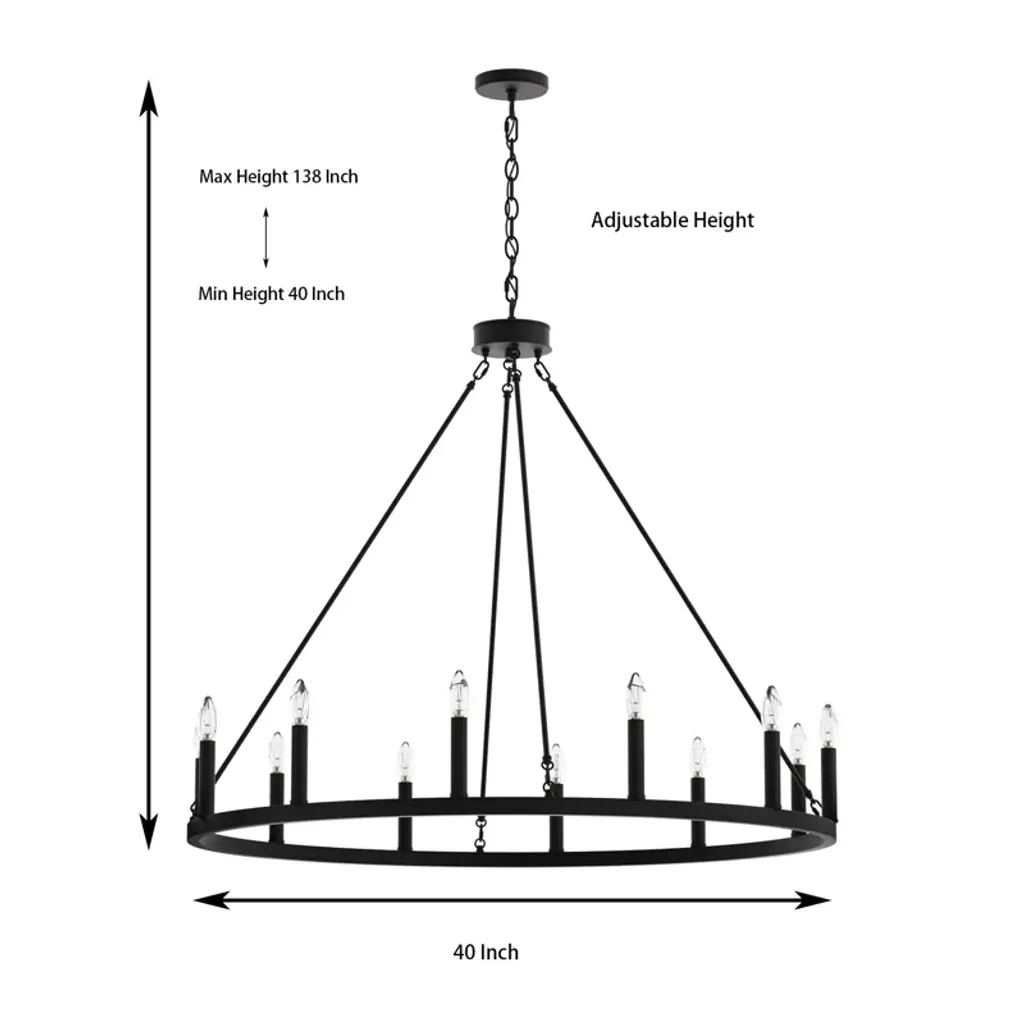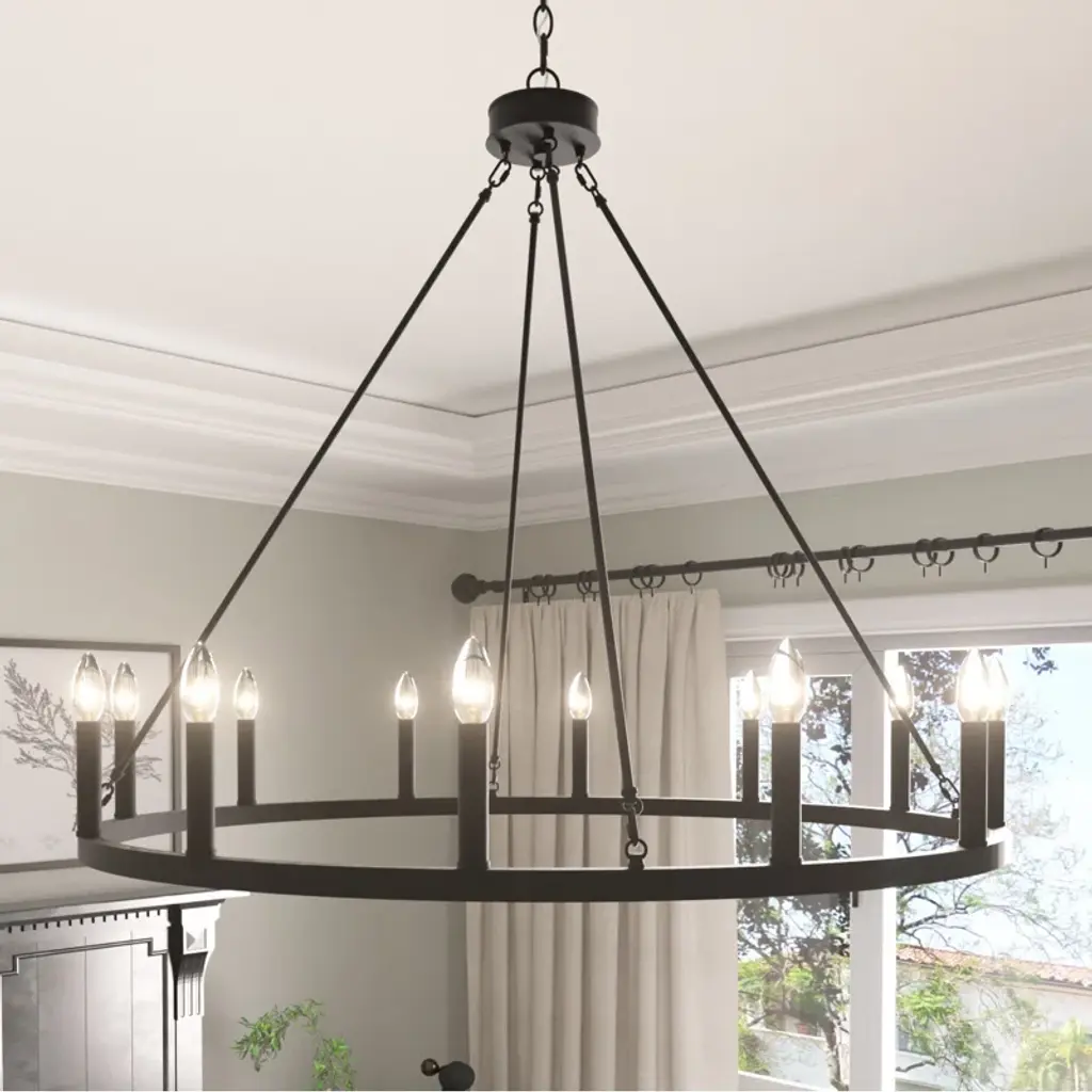 This Madalyn 12-light candle-style wagon wheel chandelier evokes a rustic, farmhouse aesthetic in your large living space. We love that it is height adjustable (from 40” to 138”) and sloped ceiling compatible as that gives you versatile options for placement. The round backplate, chain, and ring - which measures 40” wide - are crafted from metal in your choice of finish. And, the 12 candle-style holders (candelabra bulbs sold separately) are exposed, so they give off a boost of brightness and light. This chandelier comes with a two-year manufacturer’s warranty.