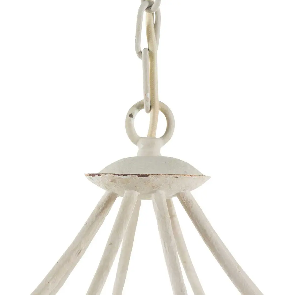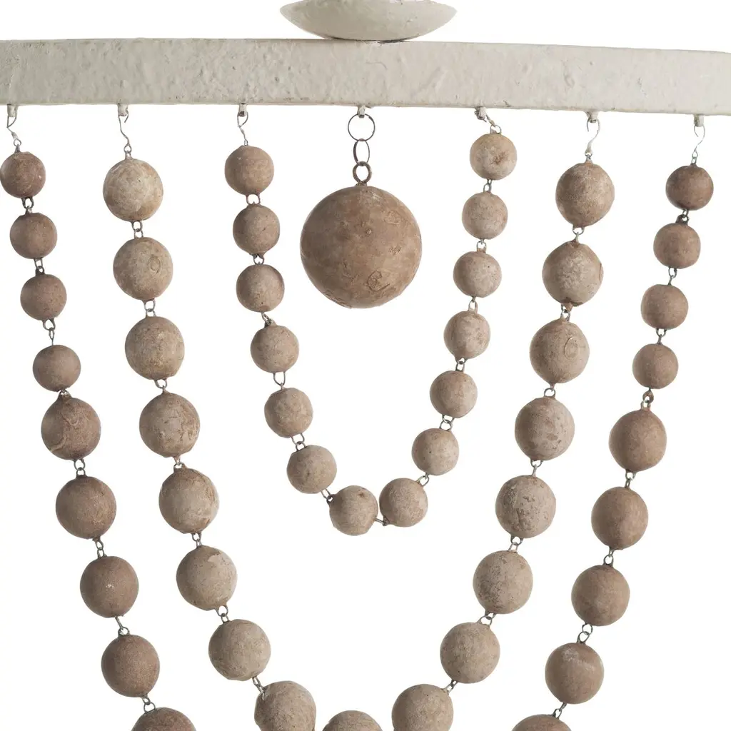 Swags of pine beads in various sizes offer a tonal and textural contrast to the white plaster finish of this chandelier's iron frame. The result is informal elegance well suited to an entry, a dining room, or a bedroom.