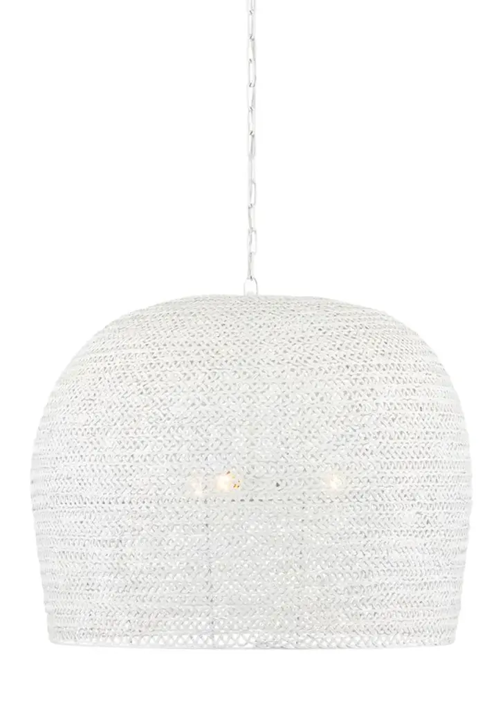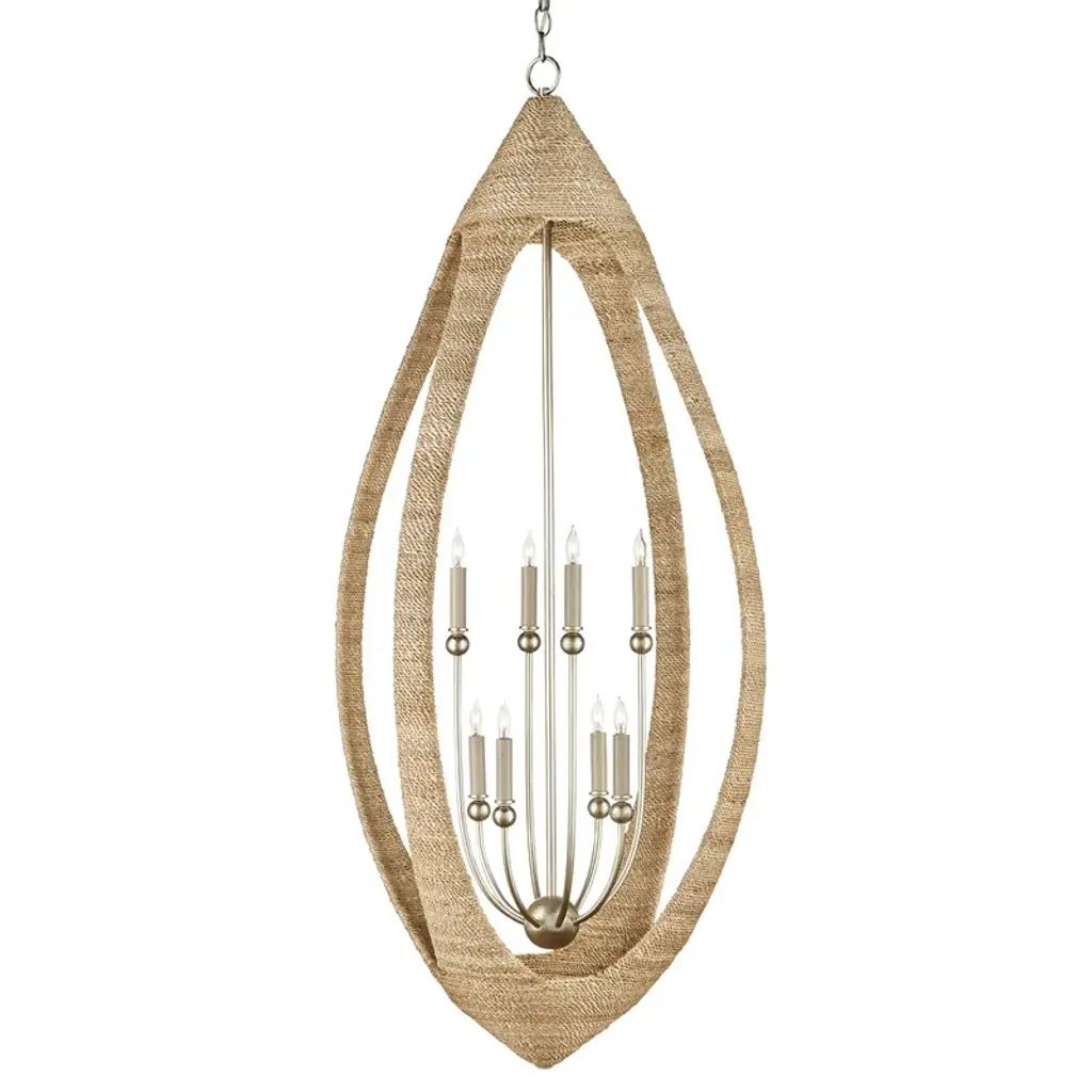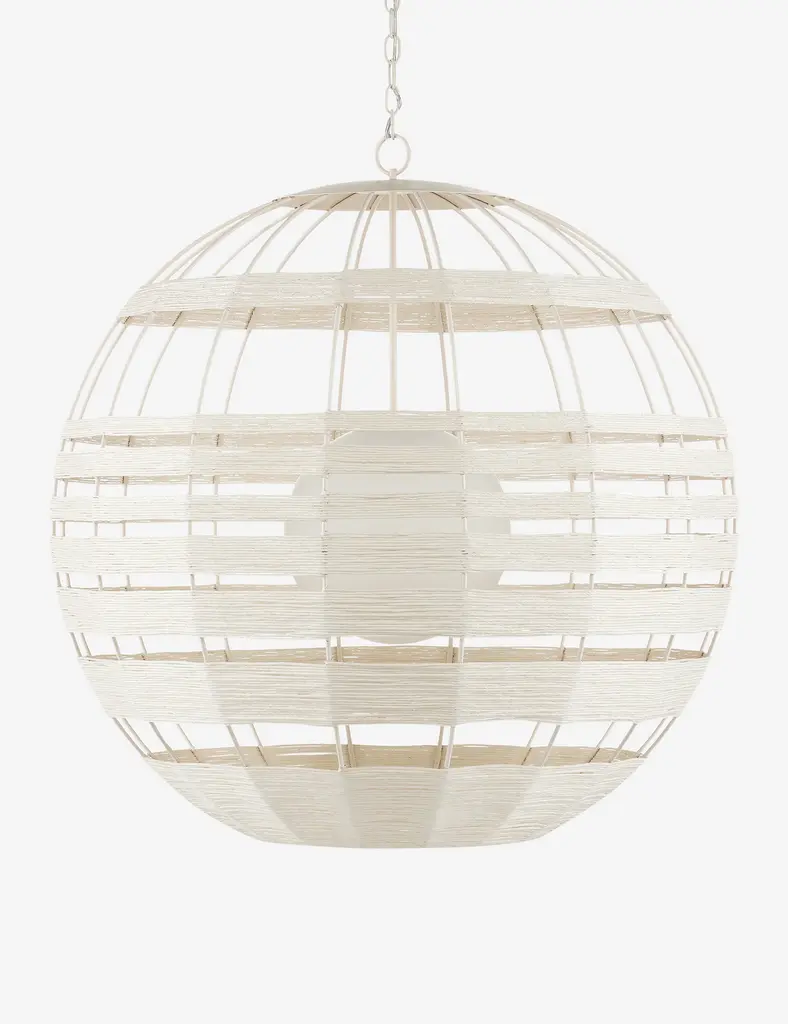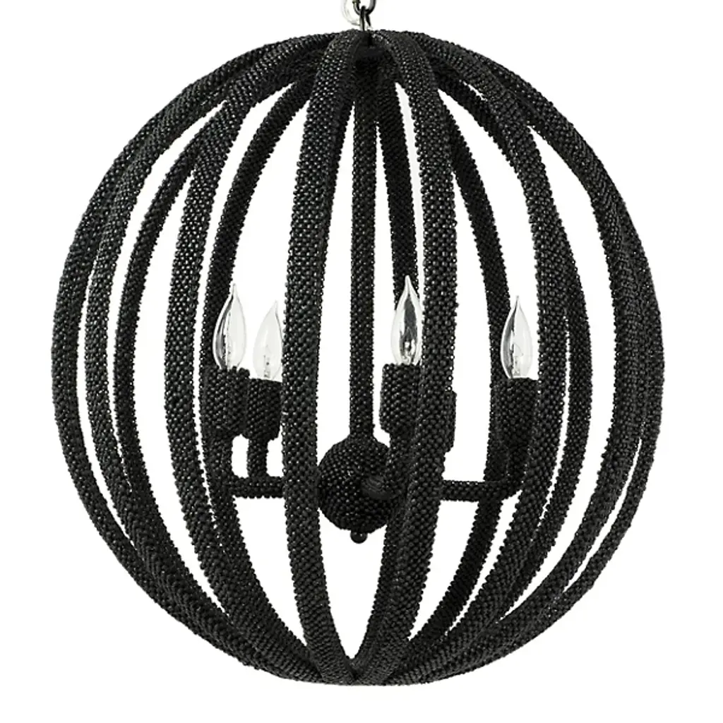 Add elegance to interiors with the expressive, coastal stylings of the Madera Coco Chandelier from Palecek. A classical chandelier design enhanced with the rustic surface detail of tightly-woven coconut shell beads, it descends from a low-profile disc canopy along a fine chain. A candelabra lamping array with short socket housings is set inside a spherical metal frame with curving vertical accents, extending a mix of expressive warmth amid the shadowy accents cast by the bars.