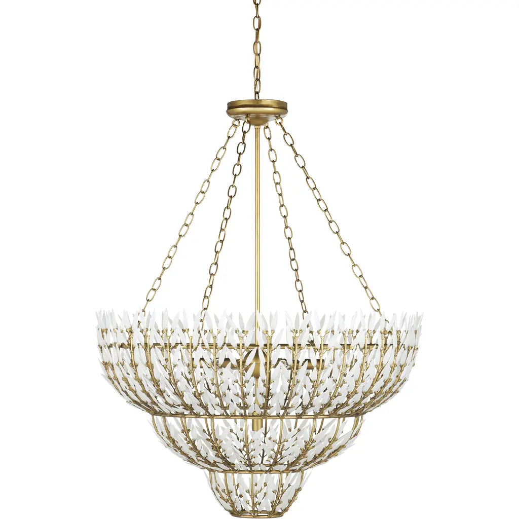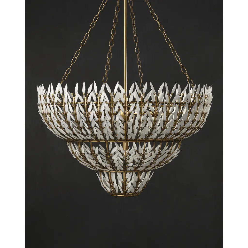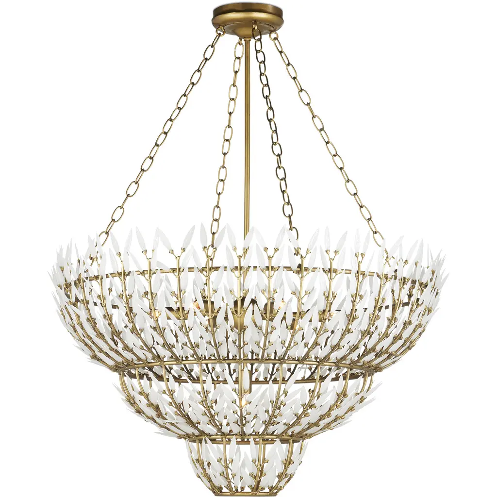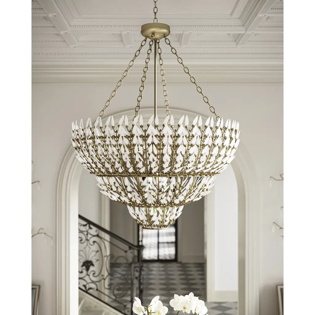 The Magnum Opus Large Chandelier is a clean-lined version of a vintage design, meticulously conceived to bring elegance to any space. The rows of glass leaves attached to the three-tier metal stems effervesce when light strikes them to create a stunning sculptural fixture. The white glass also beautifully contrasts the metal in a brass finish, the cool/warm contrast bringing the gold chandelier a heightened level of texture. The beautiful white glass leaves also surround the seven bulbs on this fixture to infuse a space with a lovely glow. Adjustable from 48.5" to 116.5" with use of included chain/rod kit/cable. If your space calls for a longer drop, additional chain/rods/cable is available for purchase.