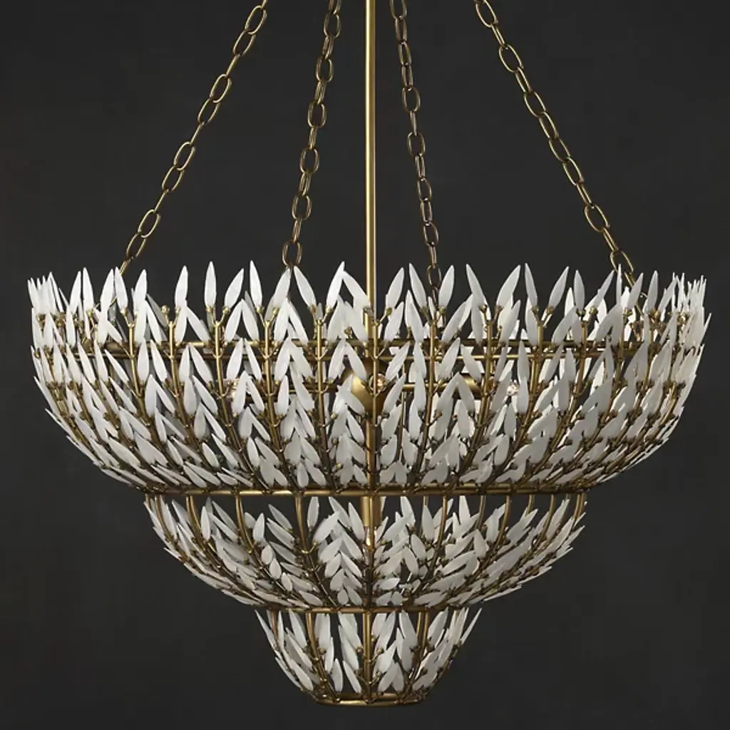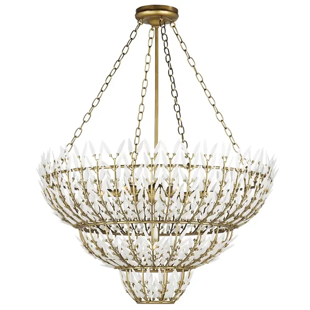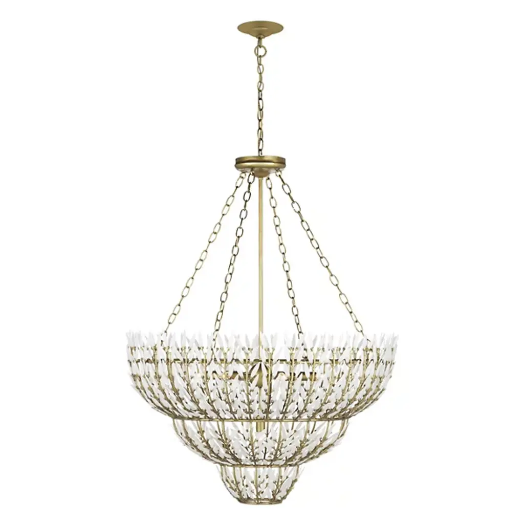 Tom Caldwell crafted a modern take on a vintage design, giving birth to the Magnum Opus Chandelier. With utmost attention to detail, rows of glass leaves gracefully adorn the three-tier metal stems, creating a captivating and sculptural fixture that exudes brilliance when illuminated. The elegant white glass beautifully contrasts the brass-finished metal, infusing the chandelier with a delightful cool/warm texture. Additionally, the charming white glass leaves envelop the seven bulbs, filling any space with a lovely and radiant glow.