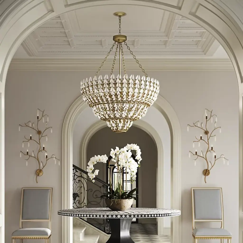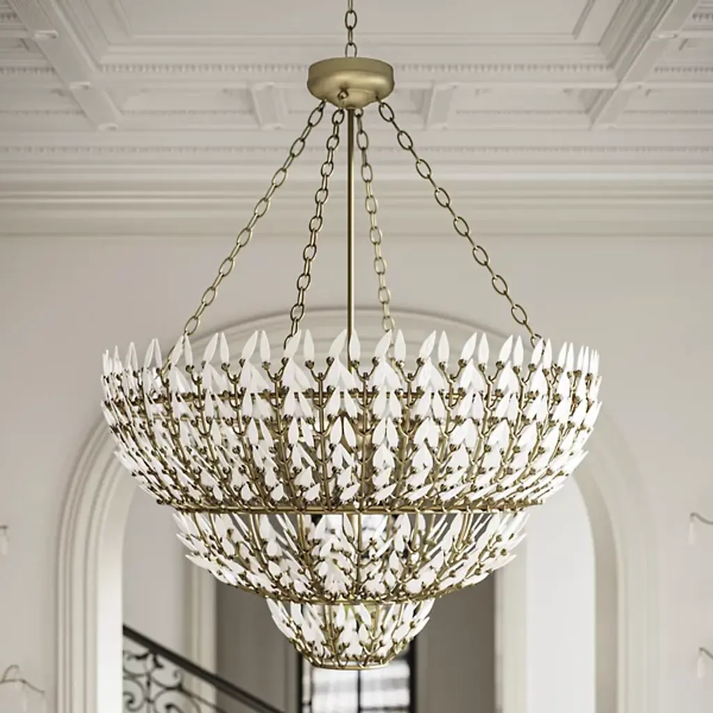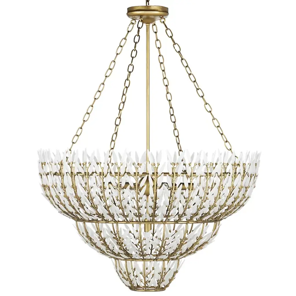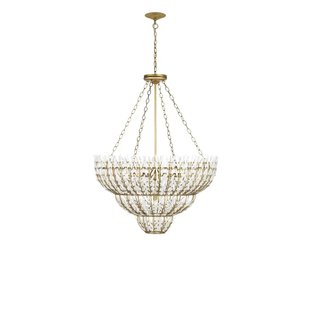 Tom Caldwell crafted a modern take on a vintage design, giving birth to the Magnum Opus Chandelier. With utmost attention to detail, rows of glass leaves gracefully adorn the three-tier metal stems, creating a captivating and sculptural fixture that exudes brilliance when illuminated. The elegant white glass beautifully contrasts the brass-finished metal, infusing the chandelier with a delightful cool/warm texture. Additionally, the charming white glass leaves envelop the seven bulbs, filling any space with a lovely and radiant glow.