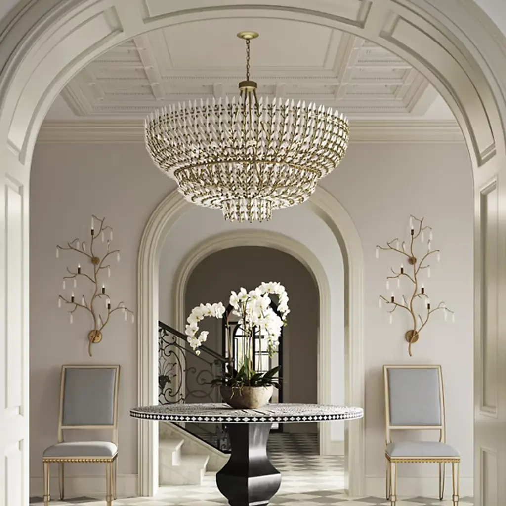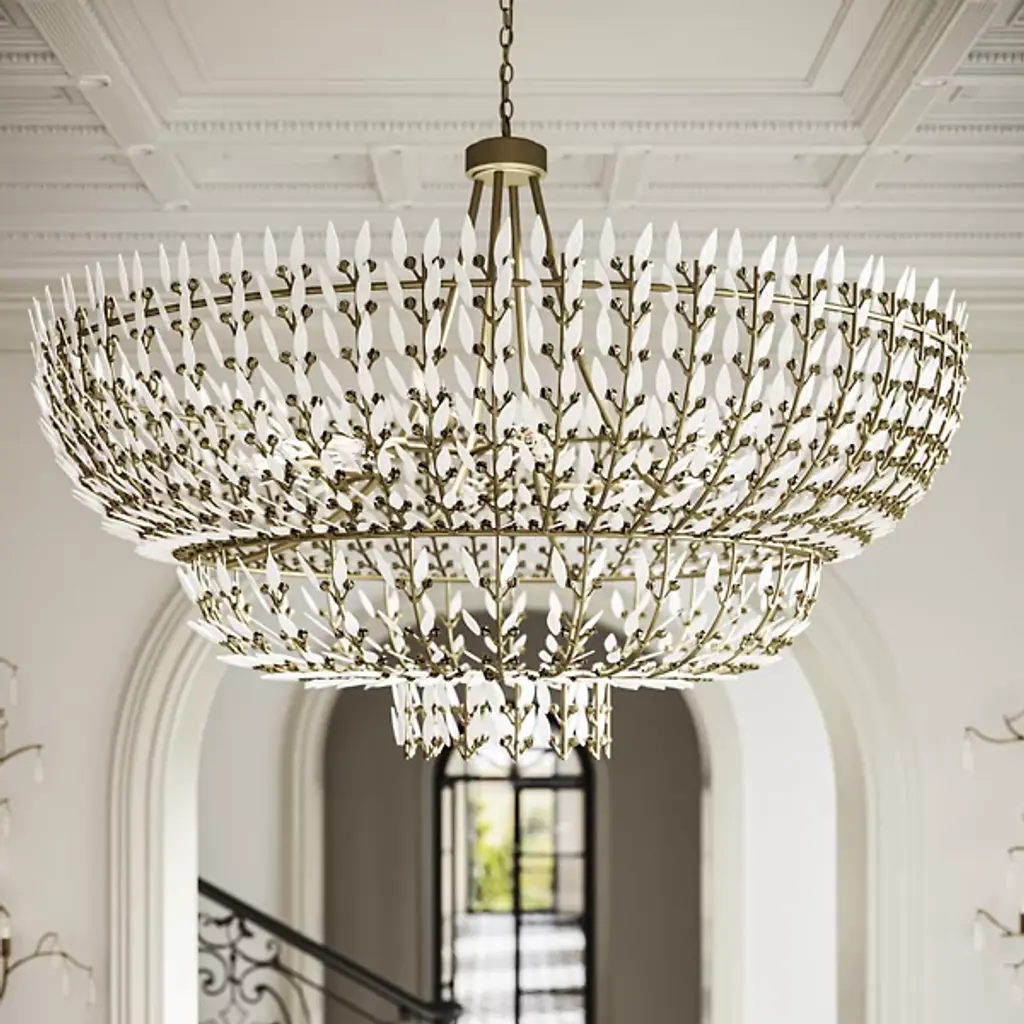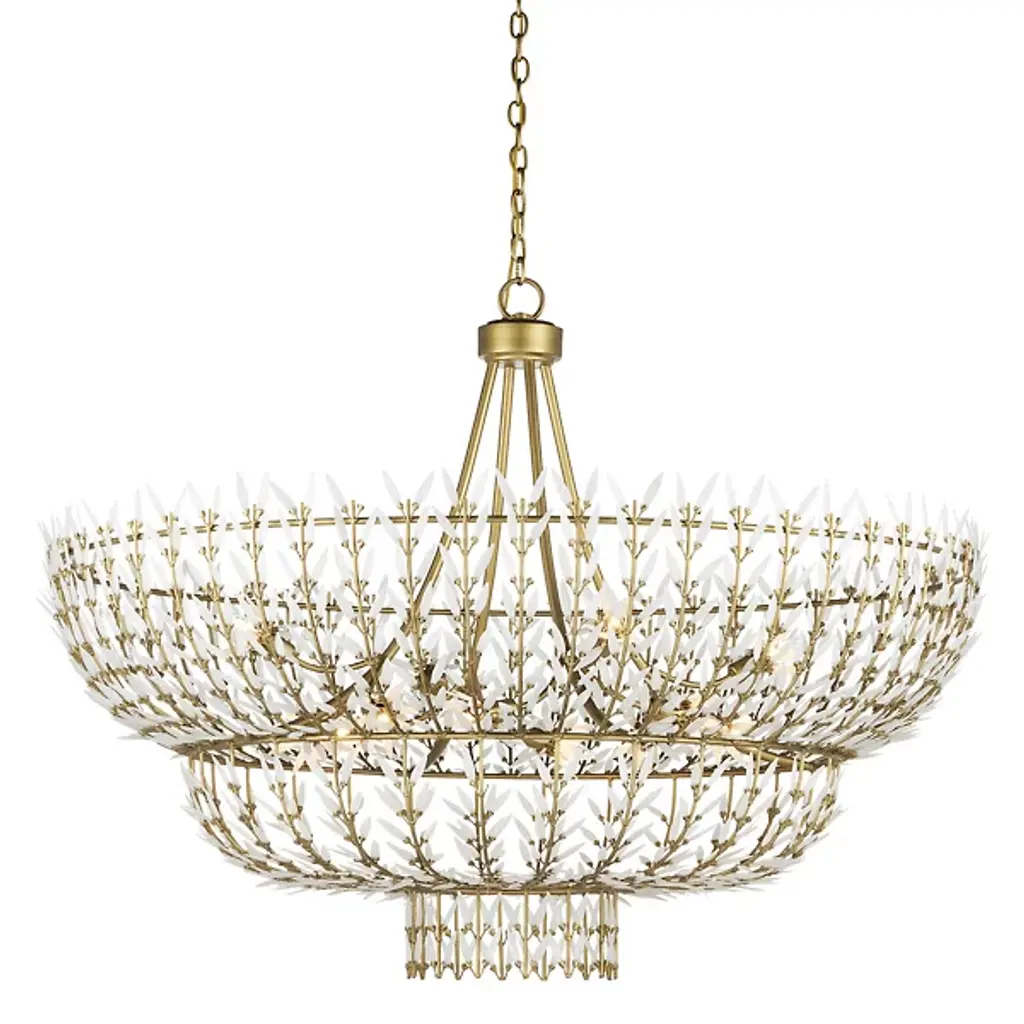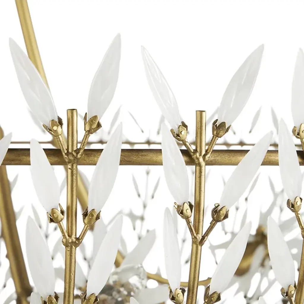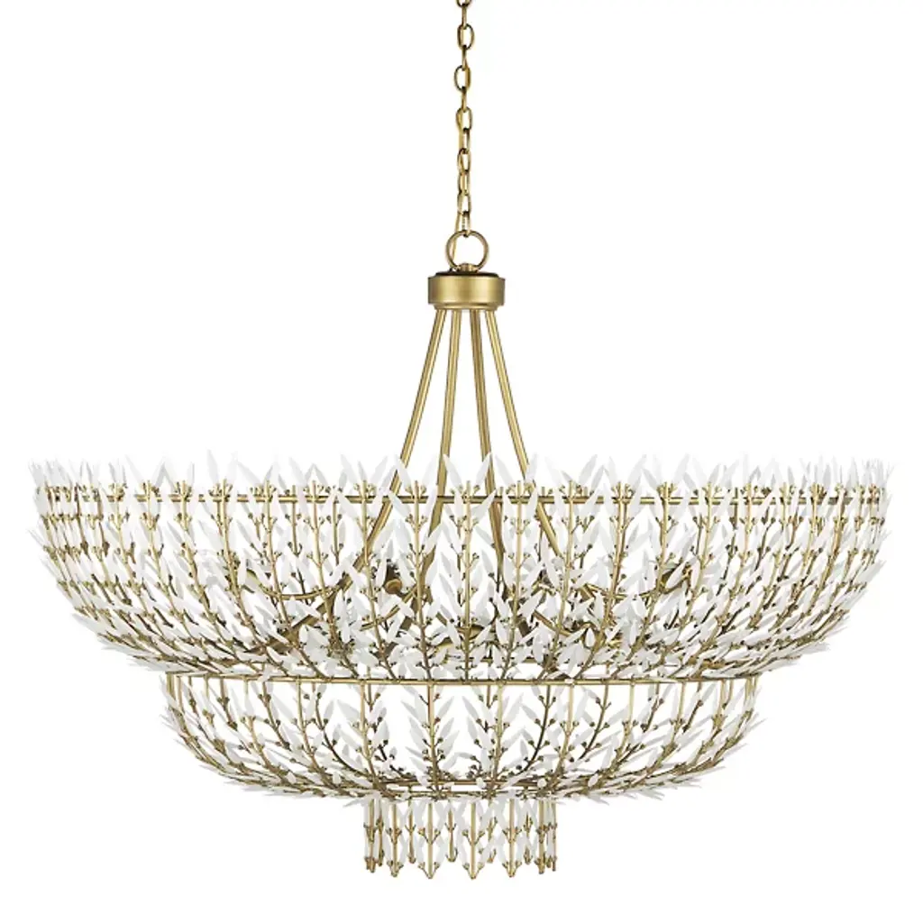 Tom Caldwell embraced the challenge of crafting a refined rendition of a vintage design, skillfully giving birth to the Magnum Opus Large Chandelier from Currey & Company. The three-tier arcing metal stems adorned with rows of glass leaves radiate with an effervescent glow, fashioning a striking sculptural masterpiece. The combination of white glass and brass-finished metal achieves a captivating cool/warm contrast, elevating the gold chandelier's texture. Moreover, the exquisite white glass leaves gracefully enfold the seven bulbs, adding further depth and nuance to this grandly scaled 54-inch diameter chandelier.