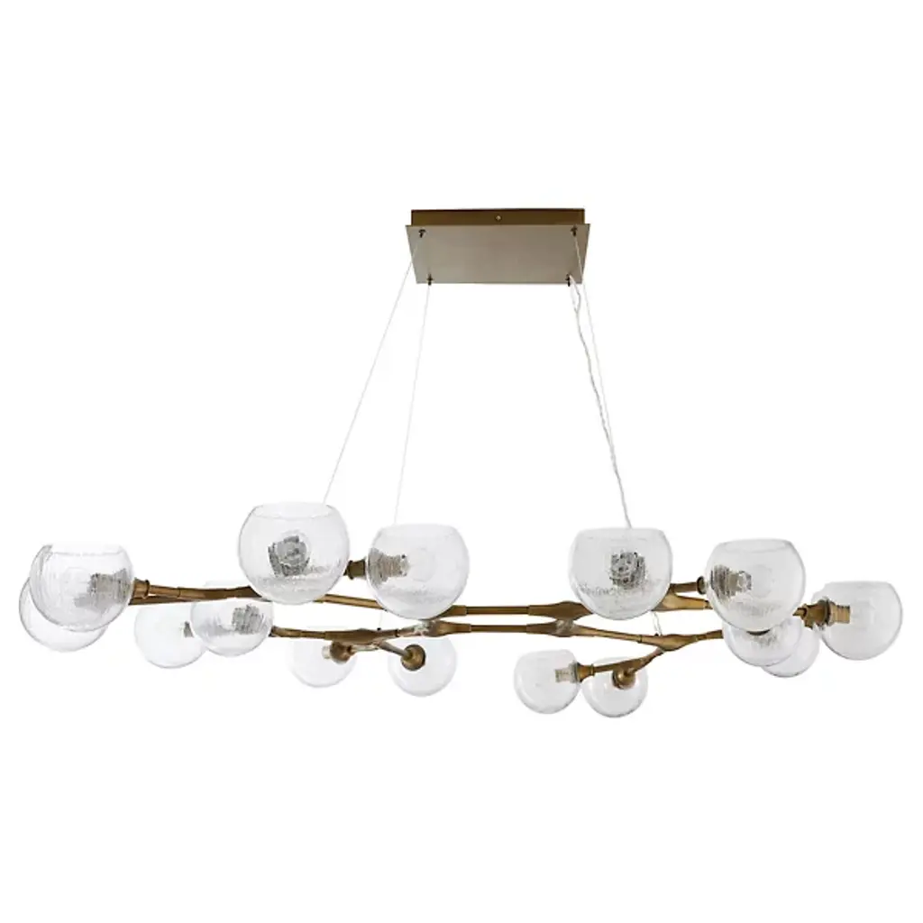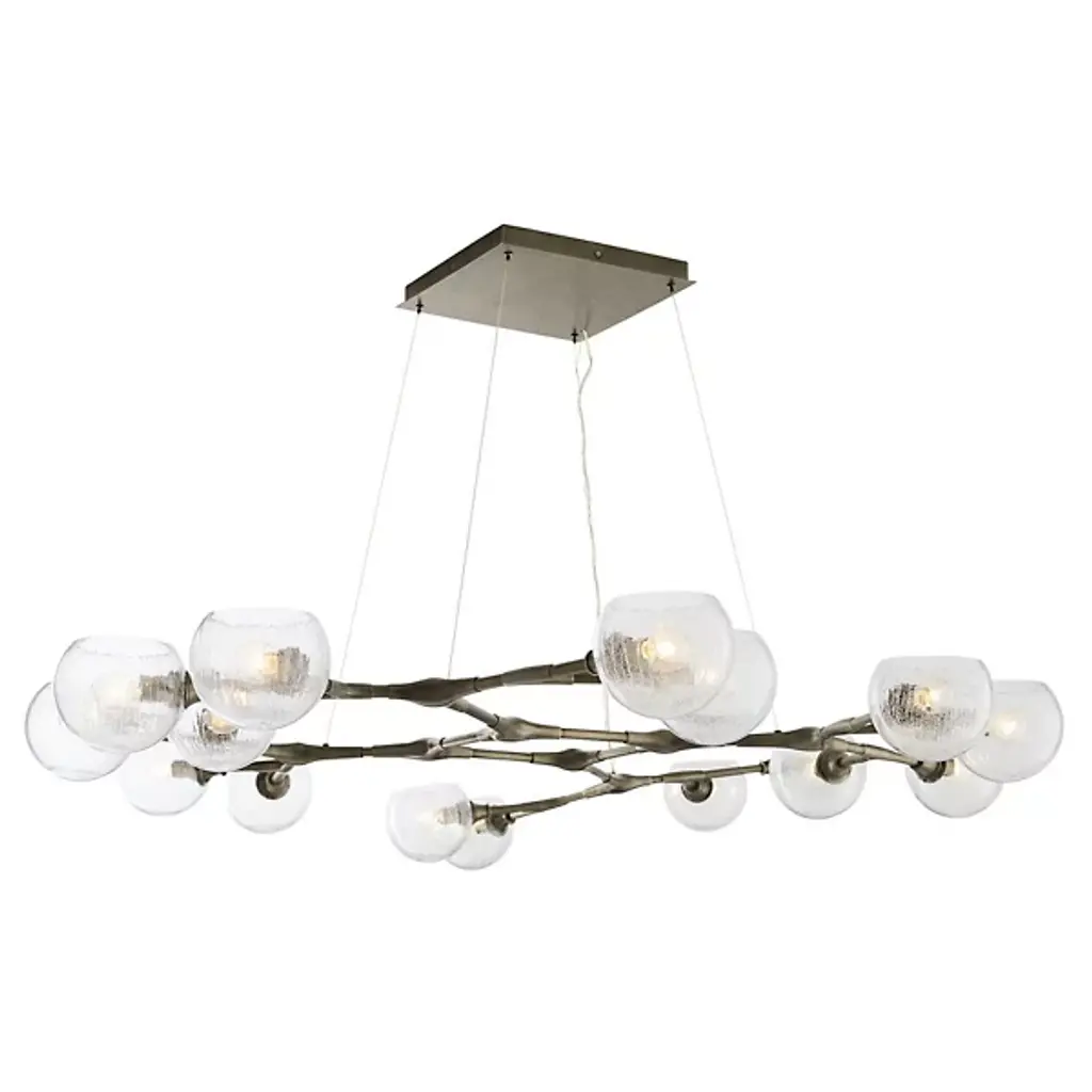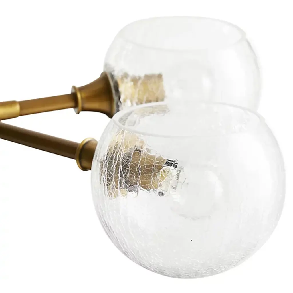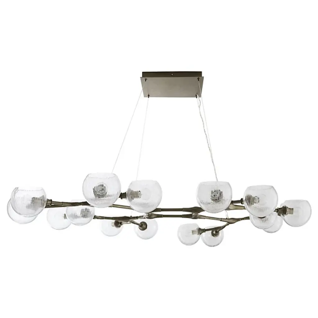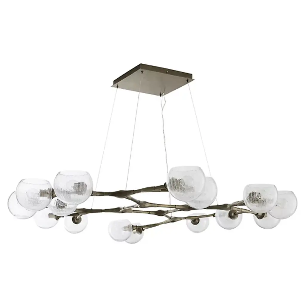 Like a floating sculpture. The Mahowald Fixed Chandelier by Arteriors is a modern design with whimsical nature-inspired influences. Steel pipe joints form branches while clear crackled glass globes evoke blossoms. With open transparent shades that suffuse brightness throughout an area, it's perfect for adding a layer of ambient lighting to living or dining spaces. This unique ceiling fixture is suspended from a platform mount with slender cables to achieve a breathtaking effect.