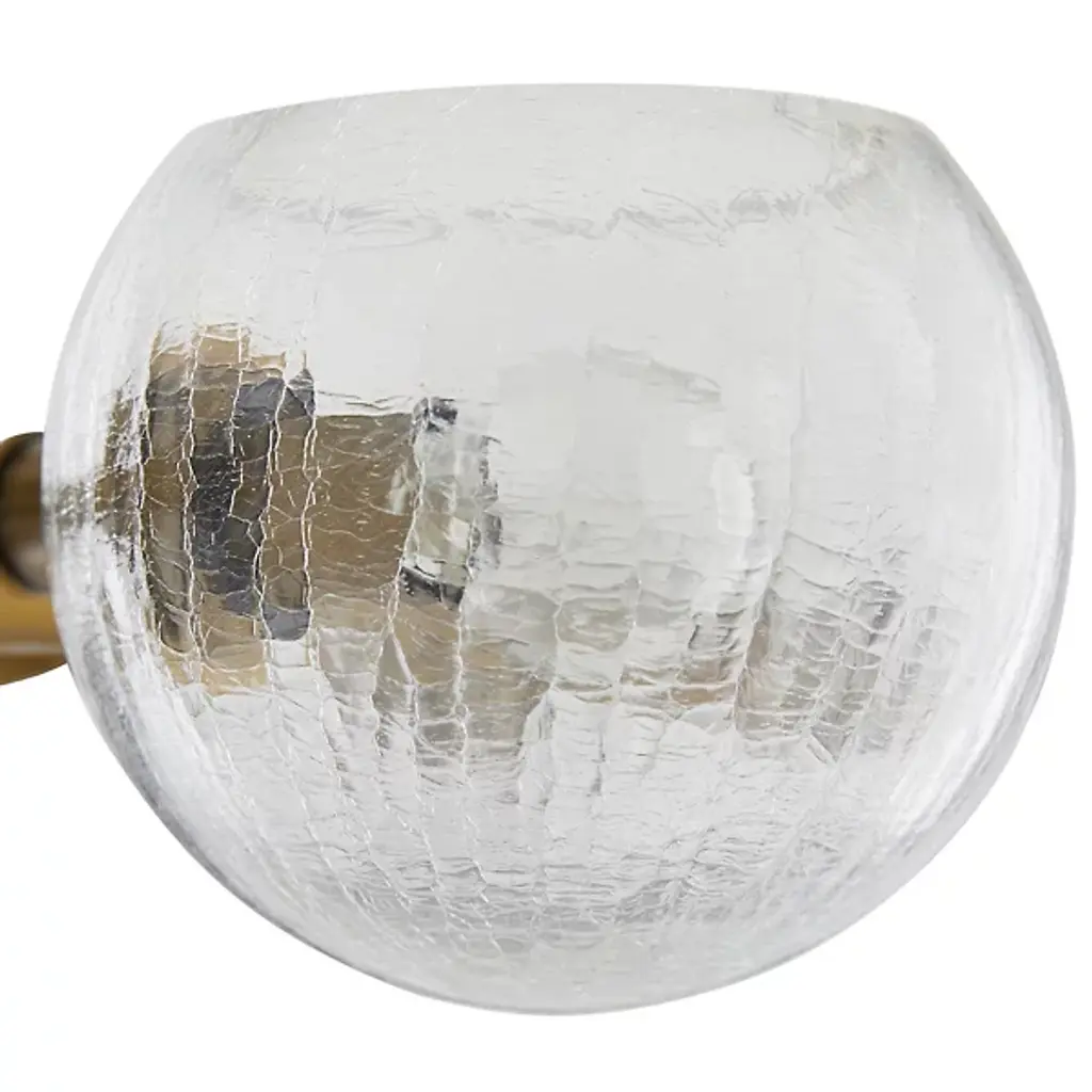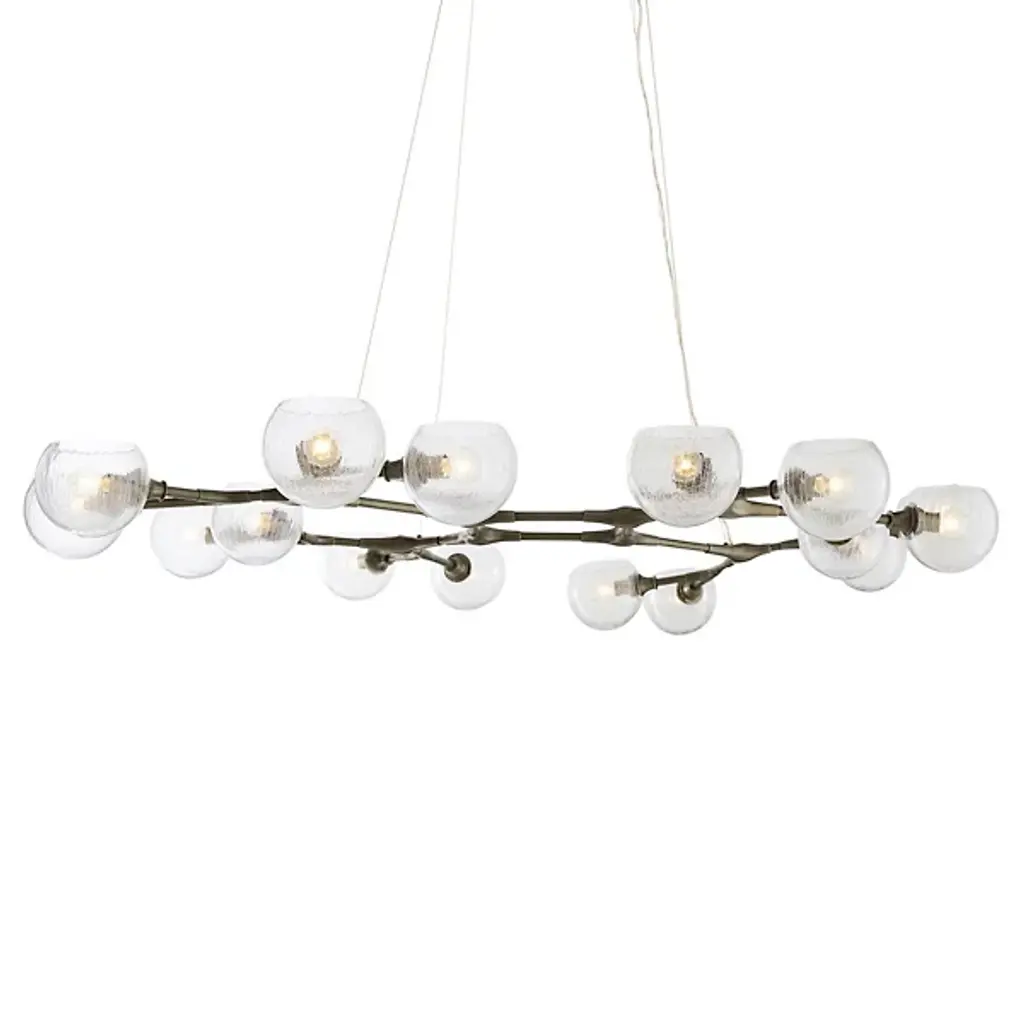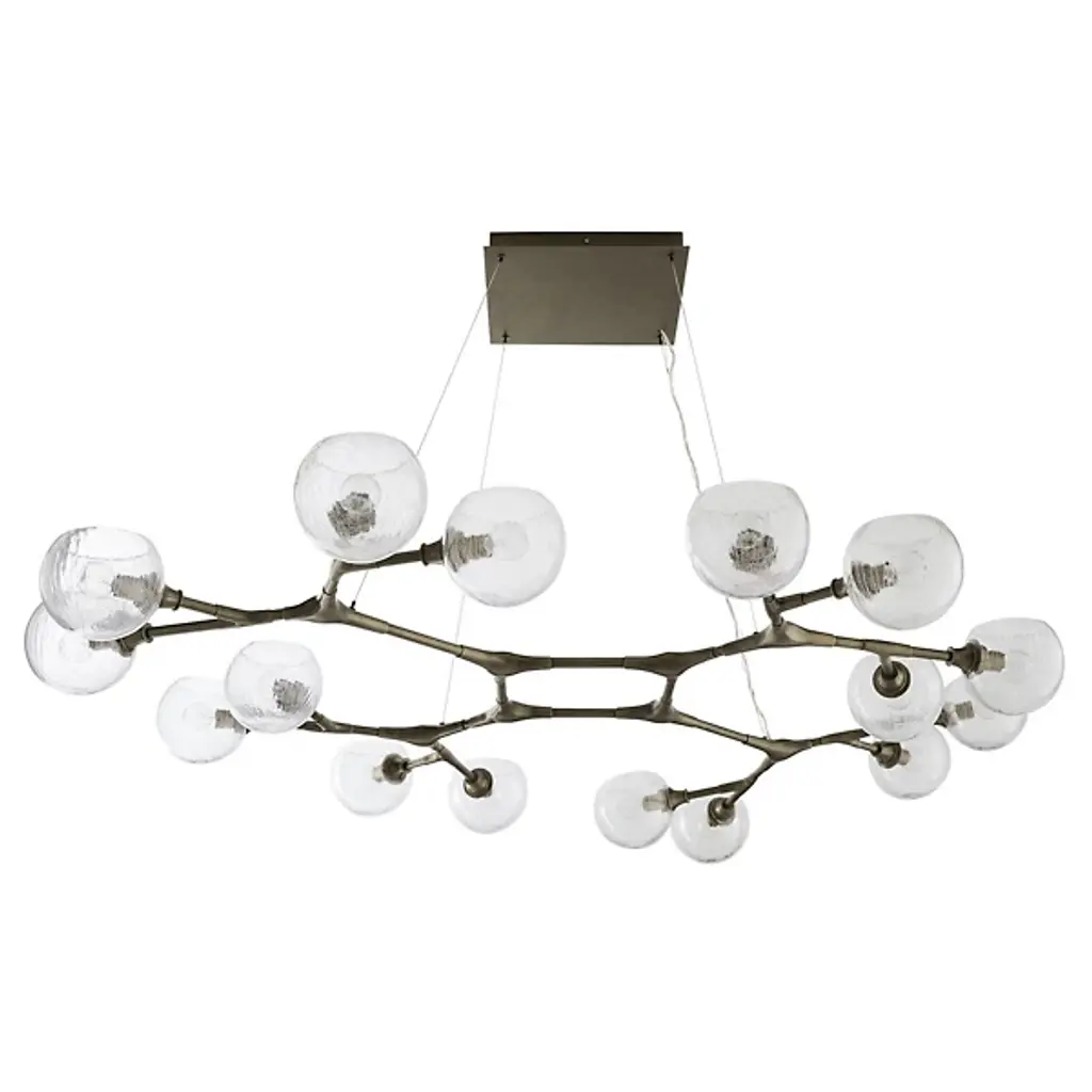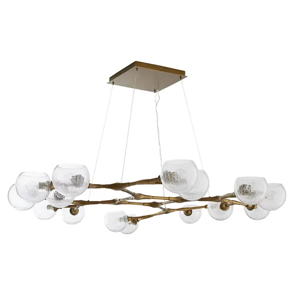 Like a floating sculpture. The Mahowald Fixed Chandelier by Arteriors is a modern design with whimsical nature-inspired influences. Steel pipe joints form branches while clear crackled glass globes evoke blossoms. With open transparent shades that suffuse brightness throughout an area, it's perfect for adding a layer of ambient lighting to living or dining spaces. This unique ceiling fixture is suspended from a platform mount with slender cables to achieve a breathtaking effect.