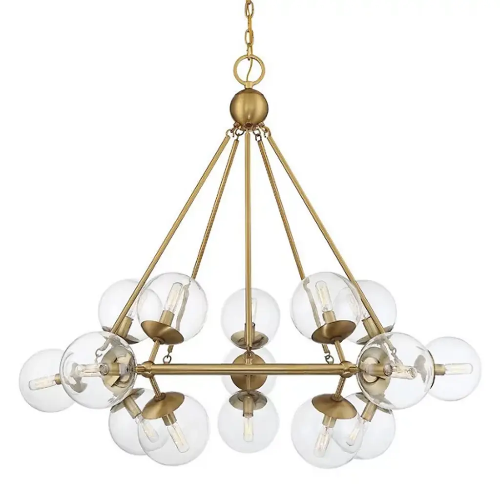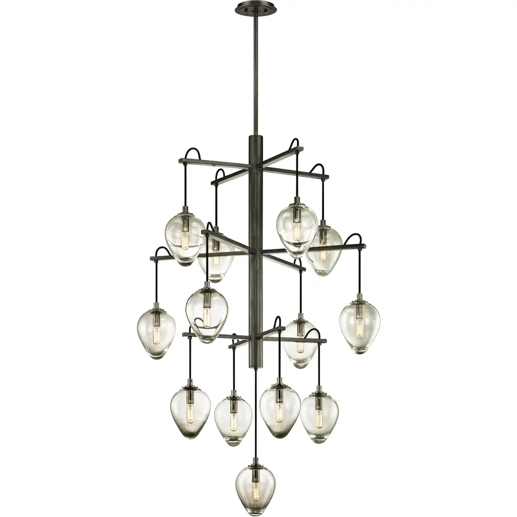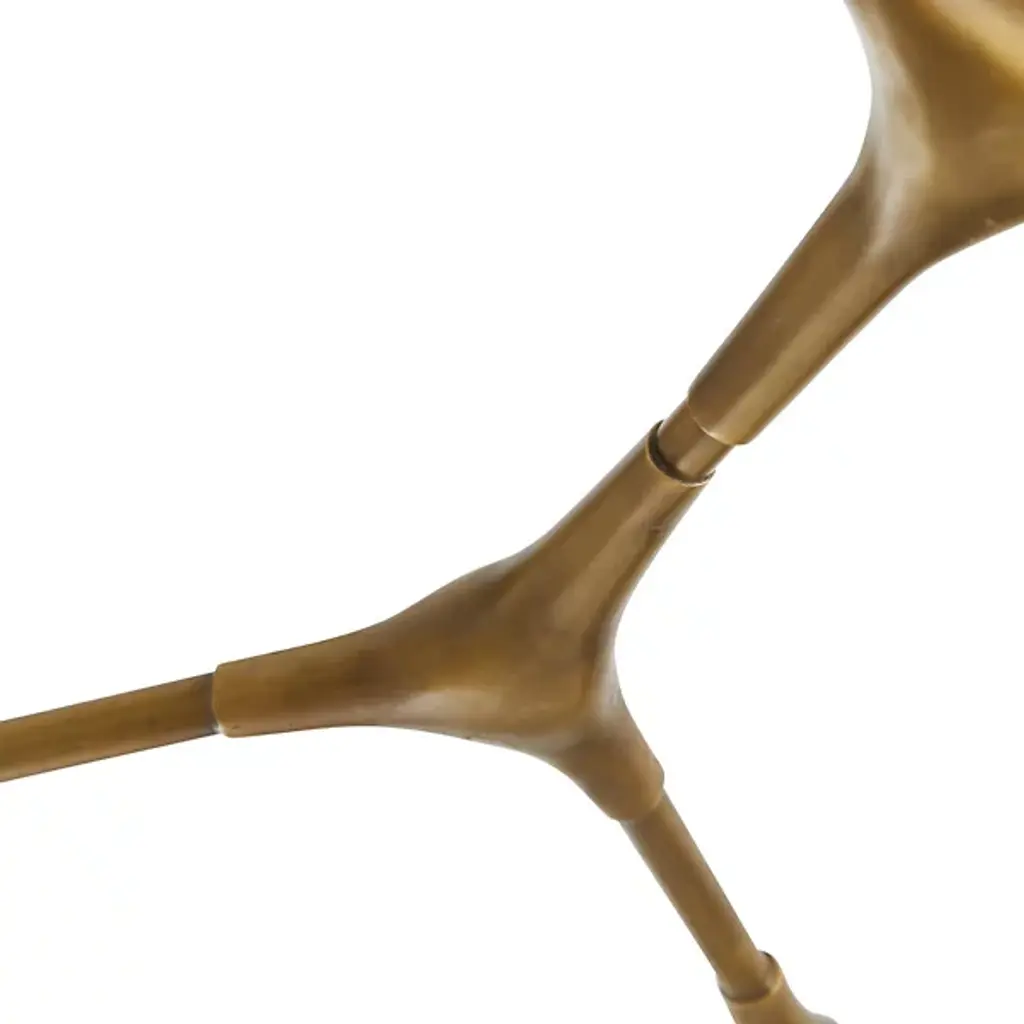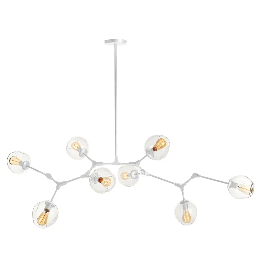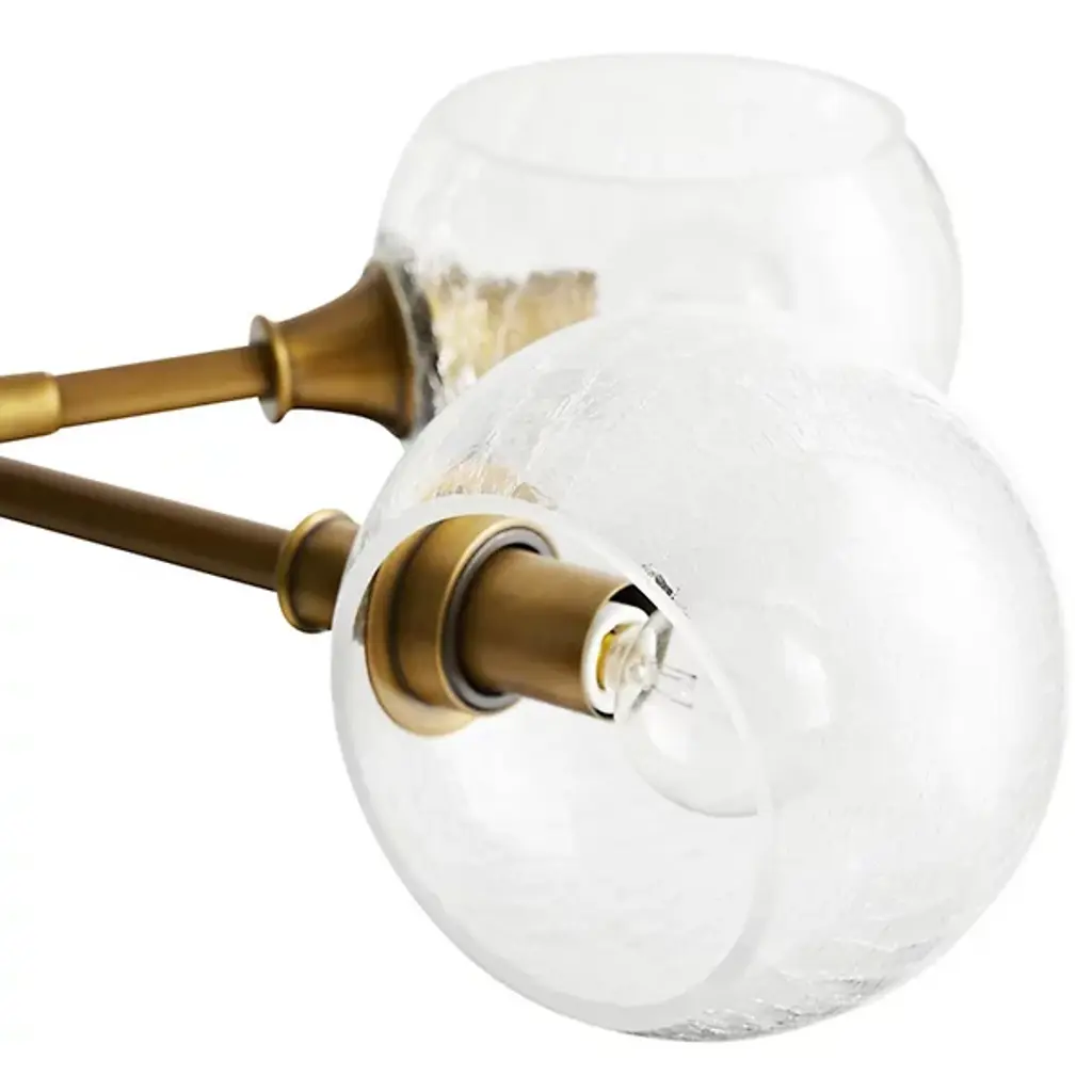 Like a floating sculpture. The Mahowald Fixed Chandelier by Arteriors is a modern design with whimsical nature-inspired influences. Steel pipe joints form branches while clear crackled glass globes evoke blossoms. With open transparent shades that suffuse brightness throughout an area, it's perfect for adding a layer of ambient lighting to living or dining spaces. This unique ceiling fixture is suspended from a platform mount with slender cables to achieve a breathtaking effect.