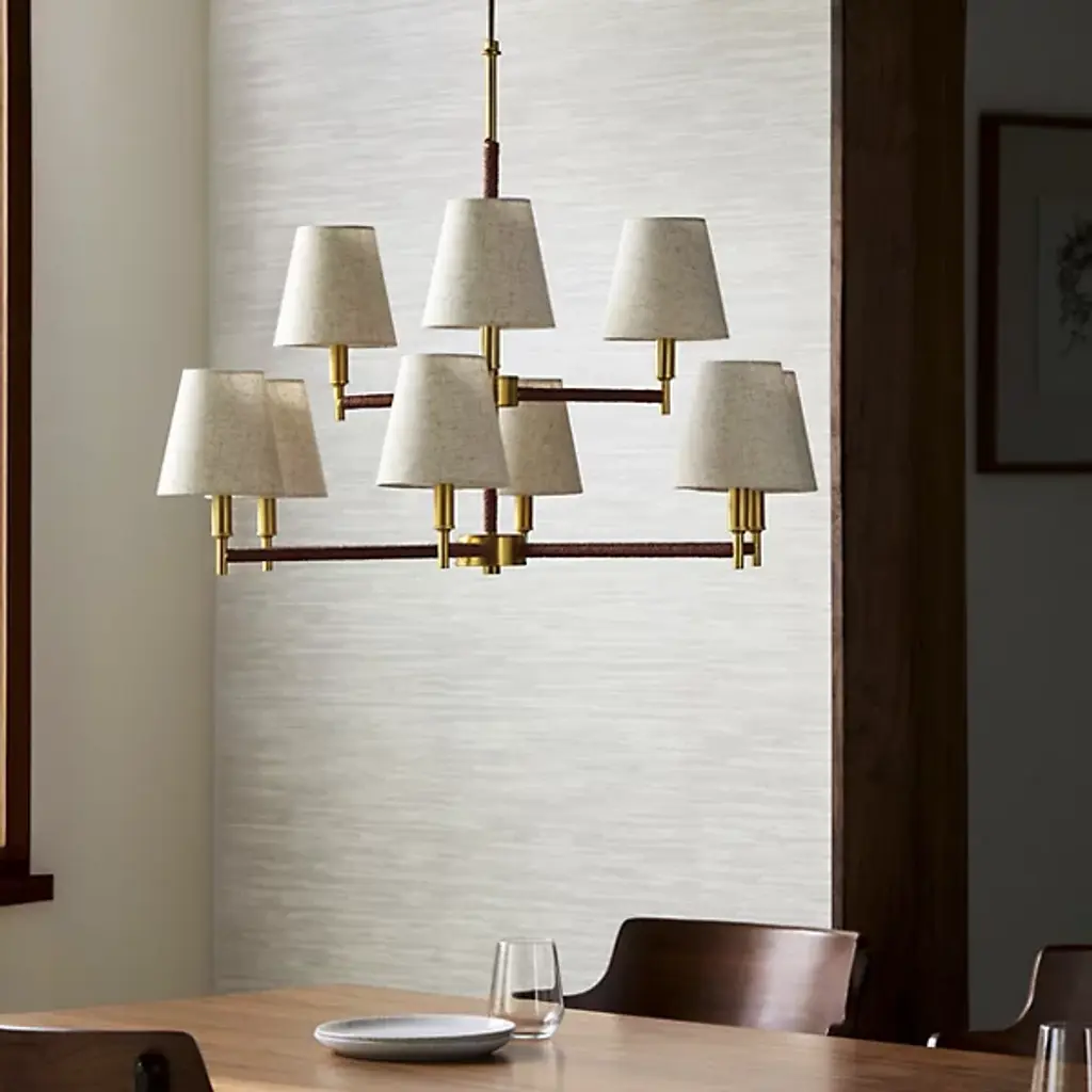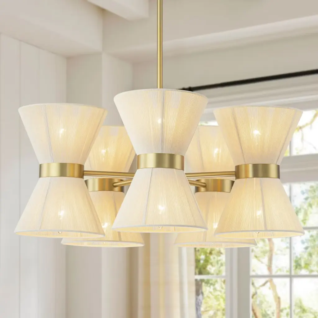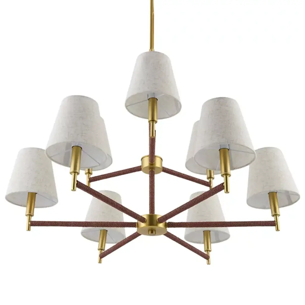 The Majen Chandelier from Surya merges mid-century design with contemporary function through its iron framework. Its multiple bell shades crafted from linen create a wash of ambient light across ceilings rather than focusing illumination downward. From open-concept living areas to intimate dining spaces, this fixture introduces architectural interest while maintaining design restraint. Its iron structure provides visual weight without excessive bulk—a characteristic hallmark of mid-century design that prioritized both form and practical application. This chandelier serves as a central design element that anchors surrounding furnishings.