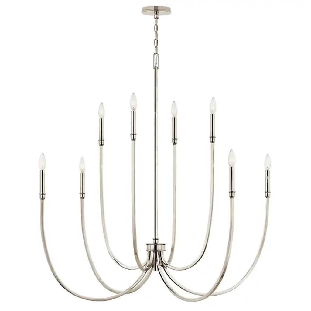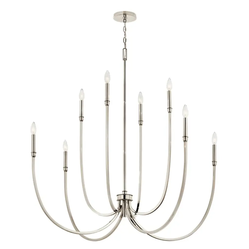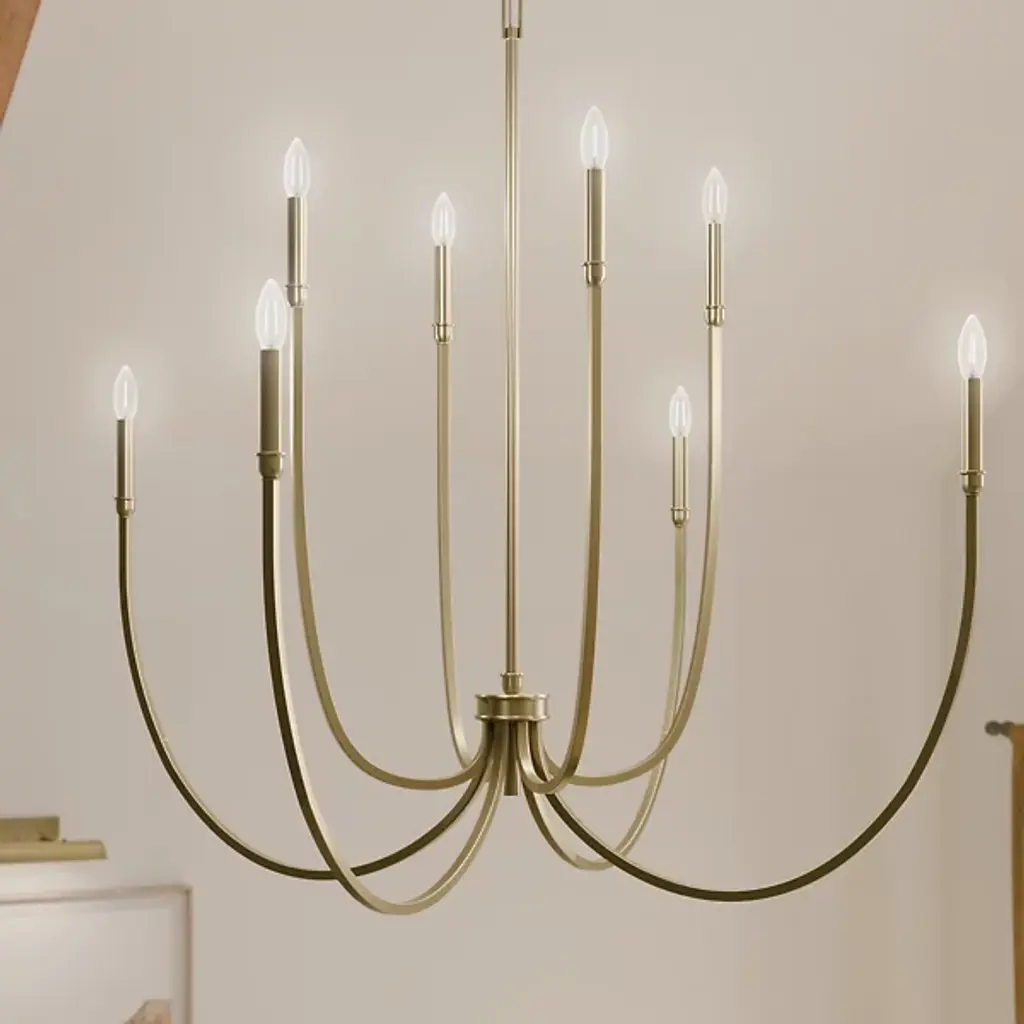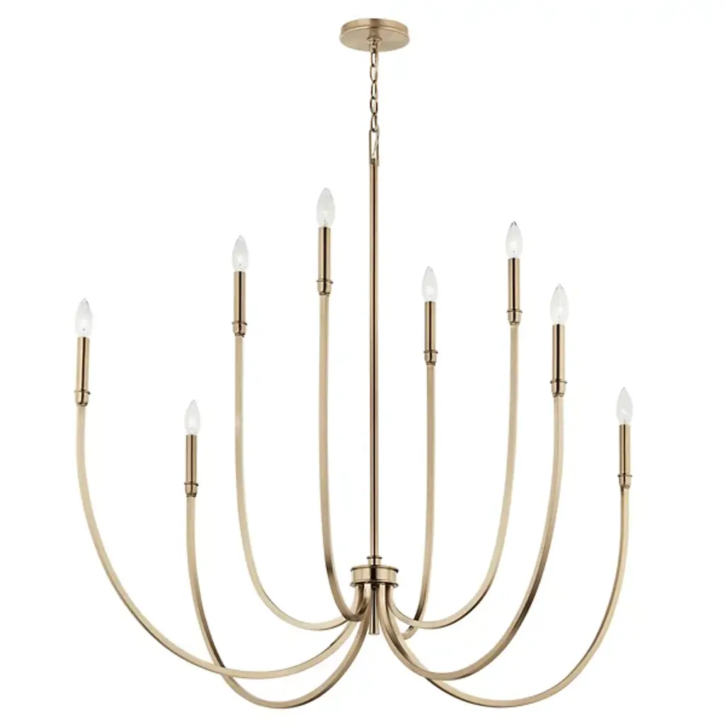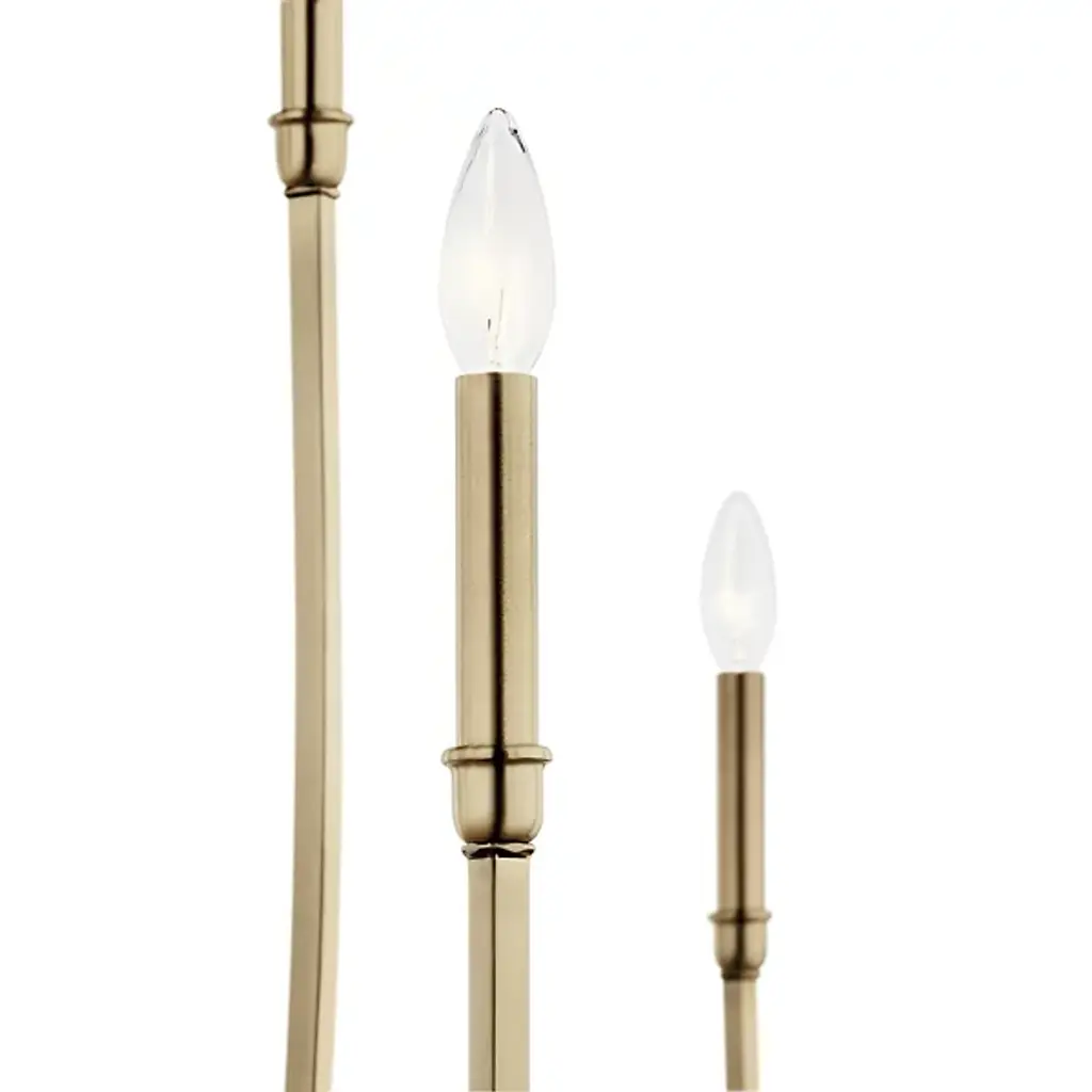 Inspired by the serene undulation of rippling water, the Malene Foyer Chandelier from Kichler epitomizes grace and elegance. Its gentle, sweeping arms and layered intricacies evoke nature's tranquil flow and captivating allure. With two candle sleeves provided, customize the aesthetic—choose white for a traditional contrast or champagne bronze for a contemporary touch. Delicate details on the sleeve holder add to its refined sophistication, imparting understated charm and allure to any space.