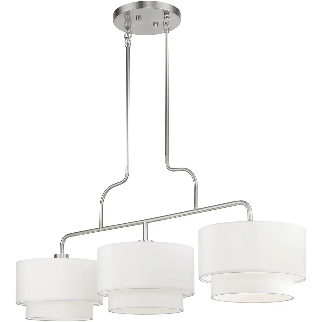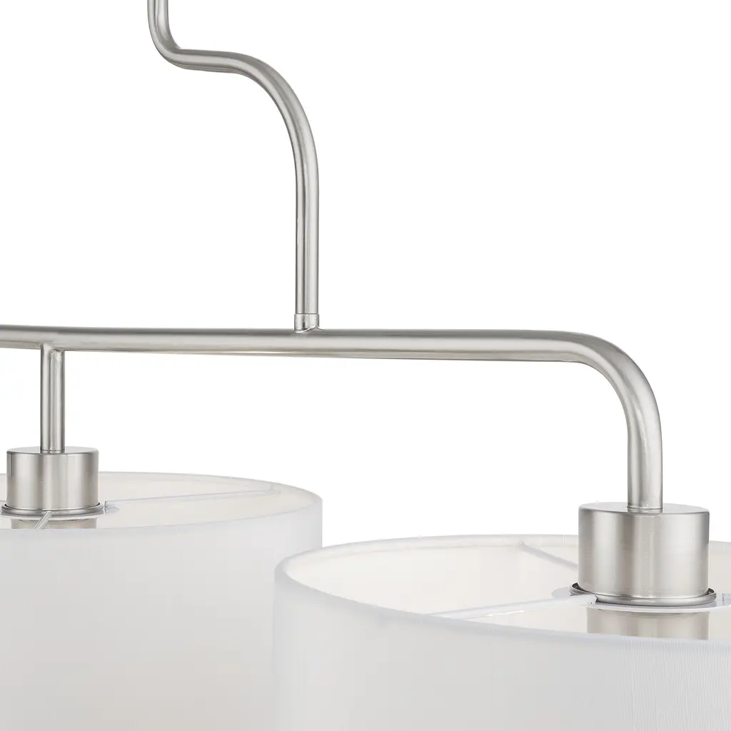 The Manorwood collection has a clean, crisp look and modern appeal. The hand-crafted off white colored fabric hardback double drum shades offer a diffused warm light complementing the brushed nickel finish on this sleek three light large linear chandelier