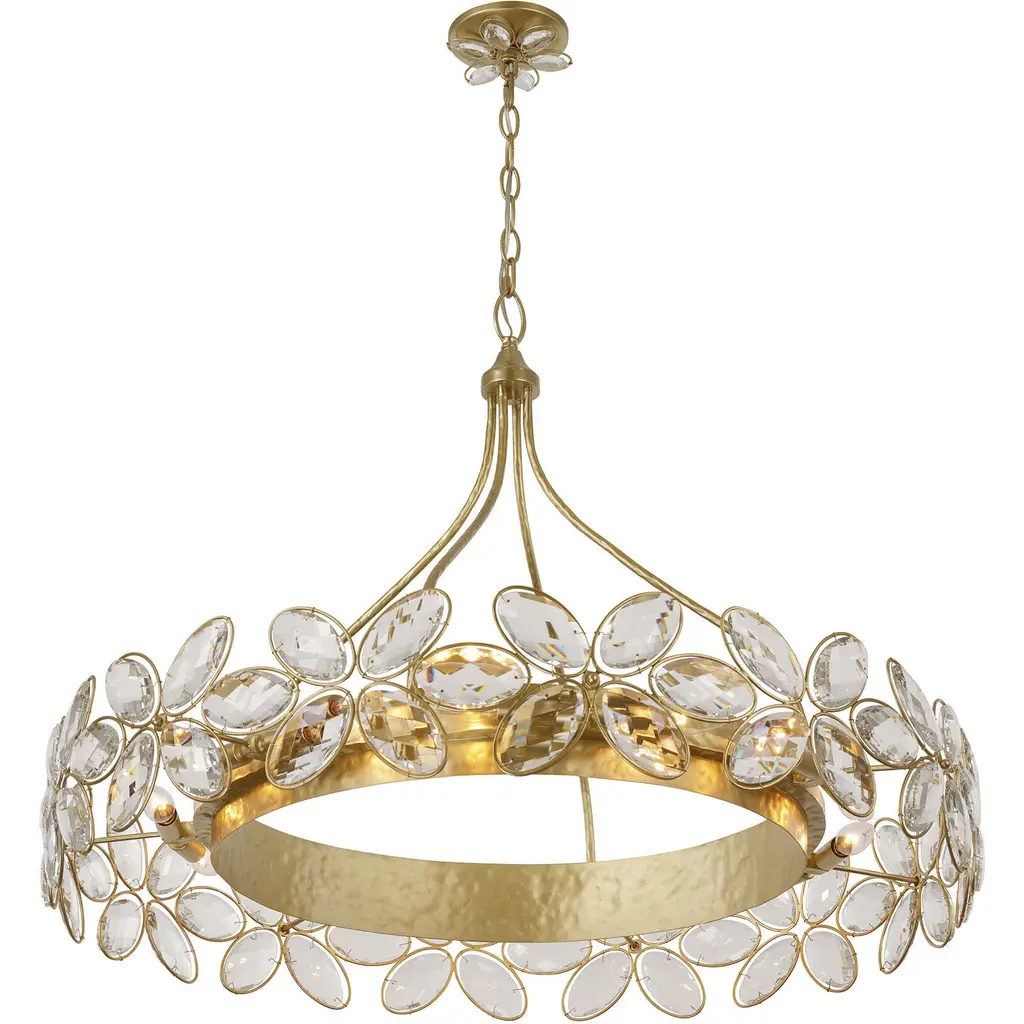 The Savoy House Marbella 14-light chandelier was designed by Breegan Jane, an award-winning interior designer and TV host. Breegan loves to travel to Spain and, accordingly, Marbella is named for a Spanish city that features a unique blend of different architectural styles thanks to being continuously inhabited for thousands of years. Marbella has an elegant design that recalls fashionable bangle bracelets, its hammered metal adorned with flowers crafted from faceted K9 crystal. Another crystal flower also blossoms from the ceiling canopy The hand-applied Gold Shimmer finish simply accentuates the beauty. Marbella is 28" in height and 36" in width. It uses fourteen candelabra size bulbs of up to 60 watts per bulb. Bulbs not included. Comes with 120" of chain.