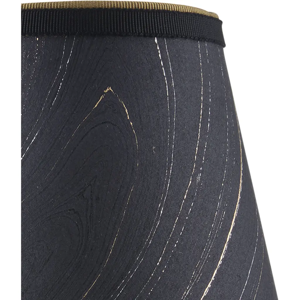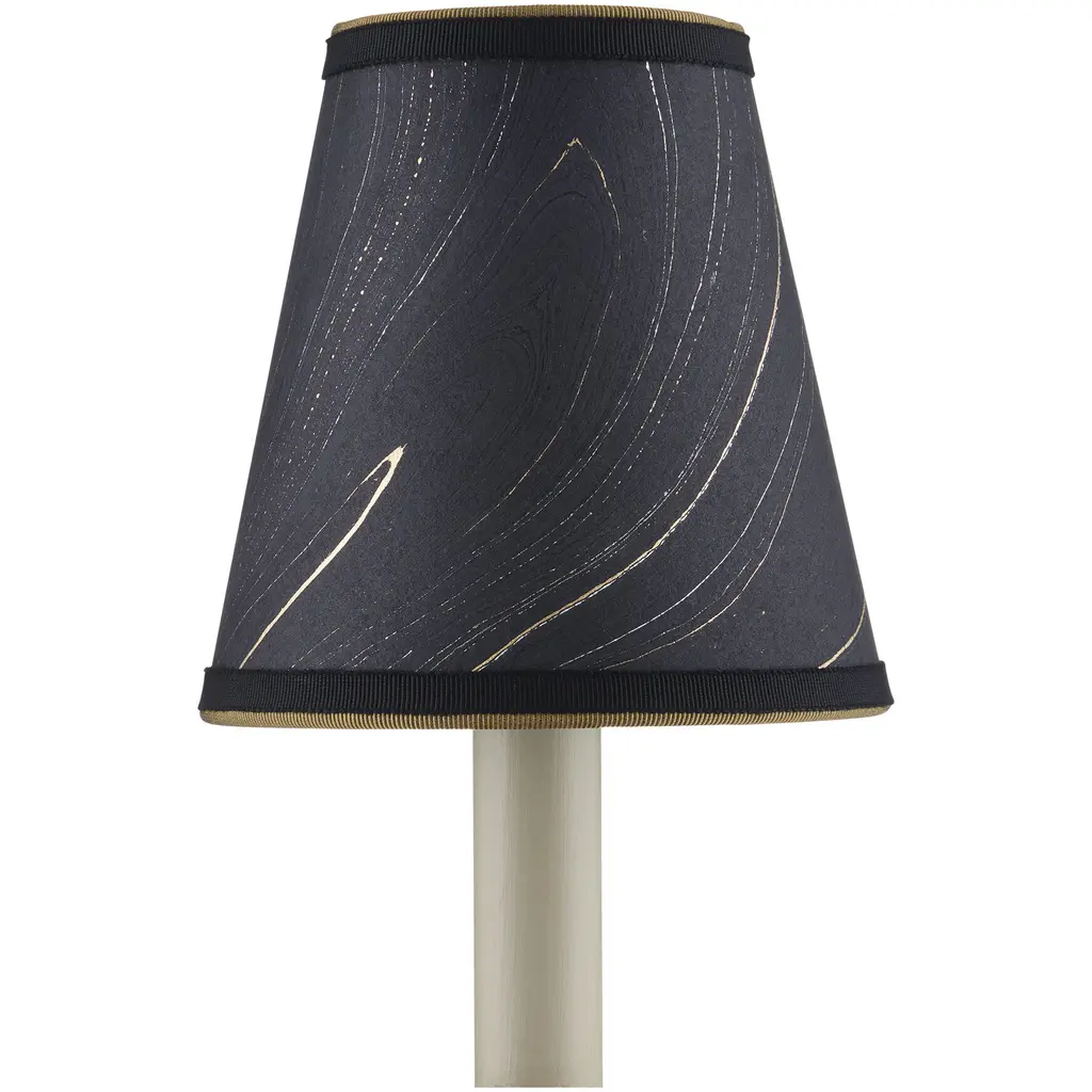 Petite shades are an easy way to bring added style to a space while also introducing color and texture, particularly when they are made from artisanal marbleized paper and ornamented with two layers of grosgrain ribbon in different hues. The saturation of the colors on the handmade tapered and cylindrical shades for chandeliers and wall sconces is achieved by a New England atelier. Patterns will vary because they are created during a very organic process that makes any surface treated to marbleizing so special. There are both vivid and pastel patterns in this collection, as you can see from this black, gold, and silver version of the tapered shade. Top Diameter: 3" Bottom Diameter: 5" Height: 5"