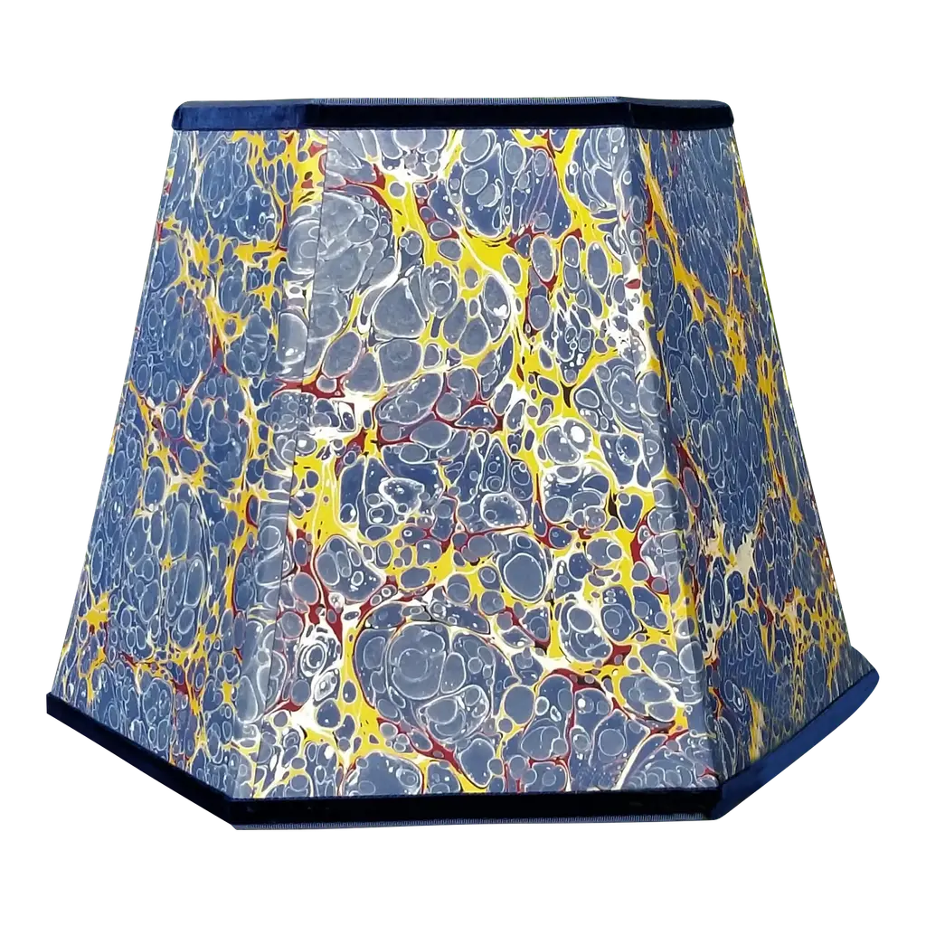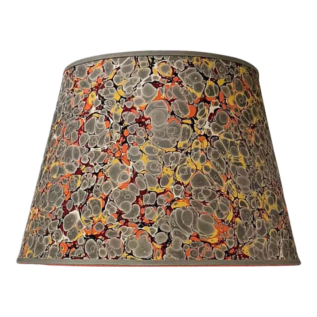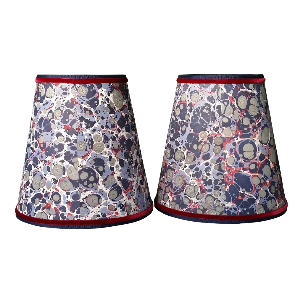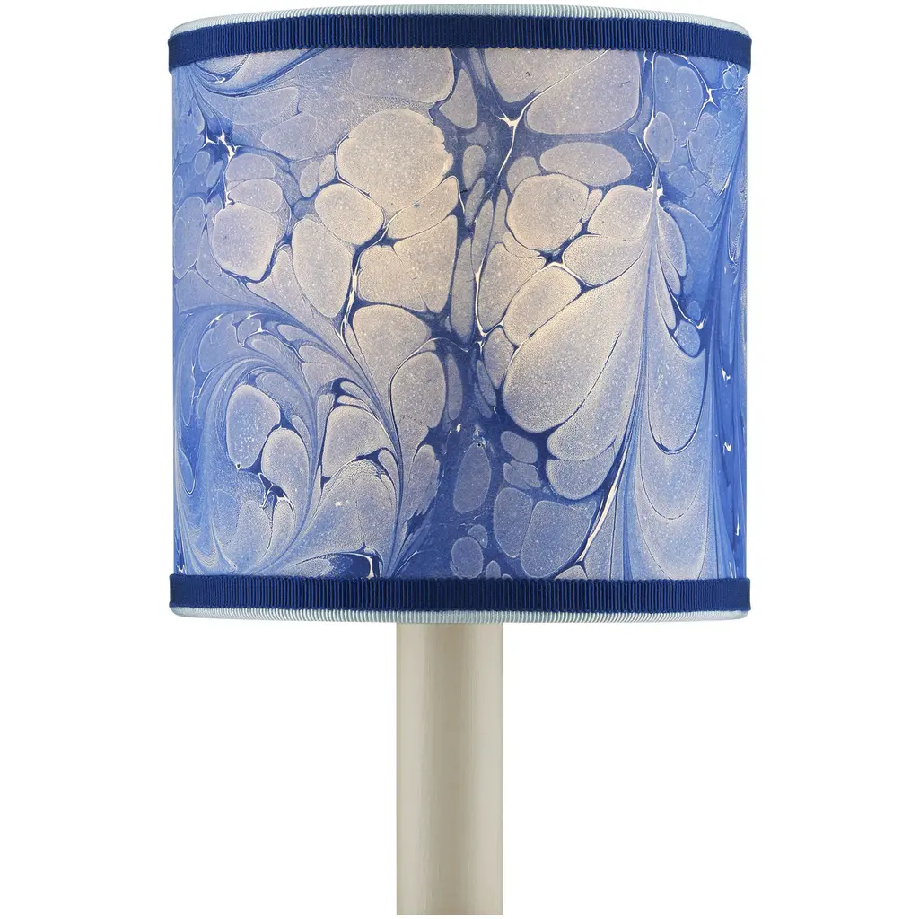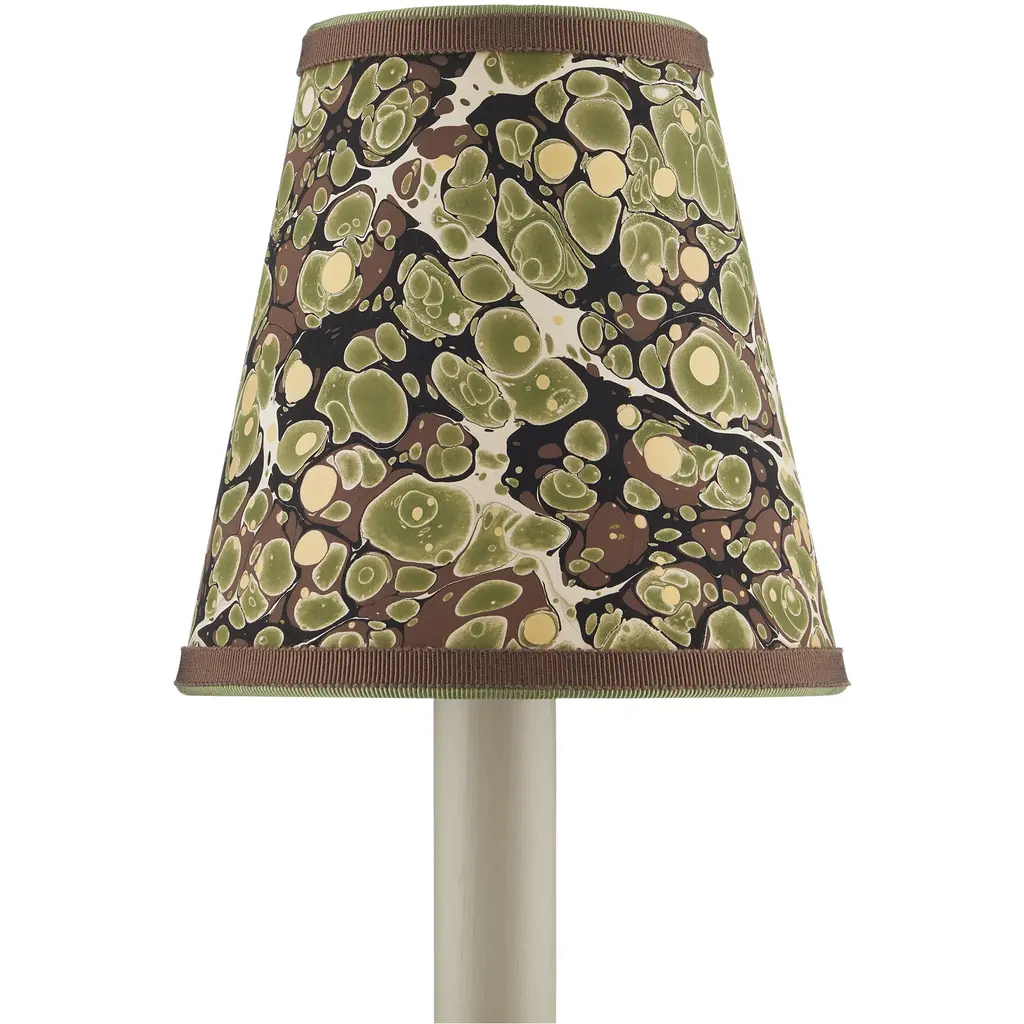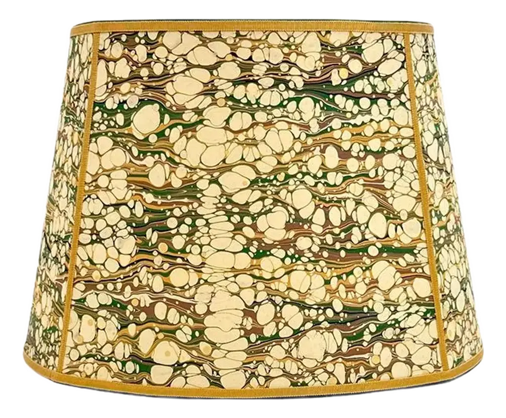 Petite shades are an easy way to bring added style to a space while also introducing color and texture, particularly when they are made from artisanal marbleized paper and ornamented with two layers of grosgrain ribbon in different hues. The saturation of the colors on the handmade tapered and cylindrical shades for chandeliers and wall sconces is achieved by a New England atelier. Patterns will vary because they are created during a very organic process that makes any surface treated to marbleizing so special. There are both vivid and pastel patterns in this collection, as you can see from this green, brown, gold version of the tapered shade. Top Diameter: 3" Bottom Diameter: 5" Height: 5"