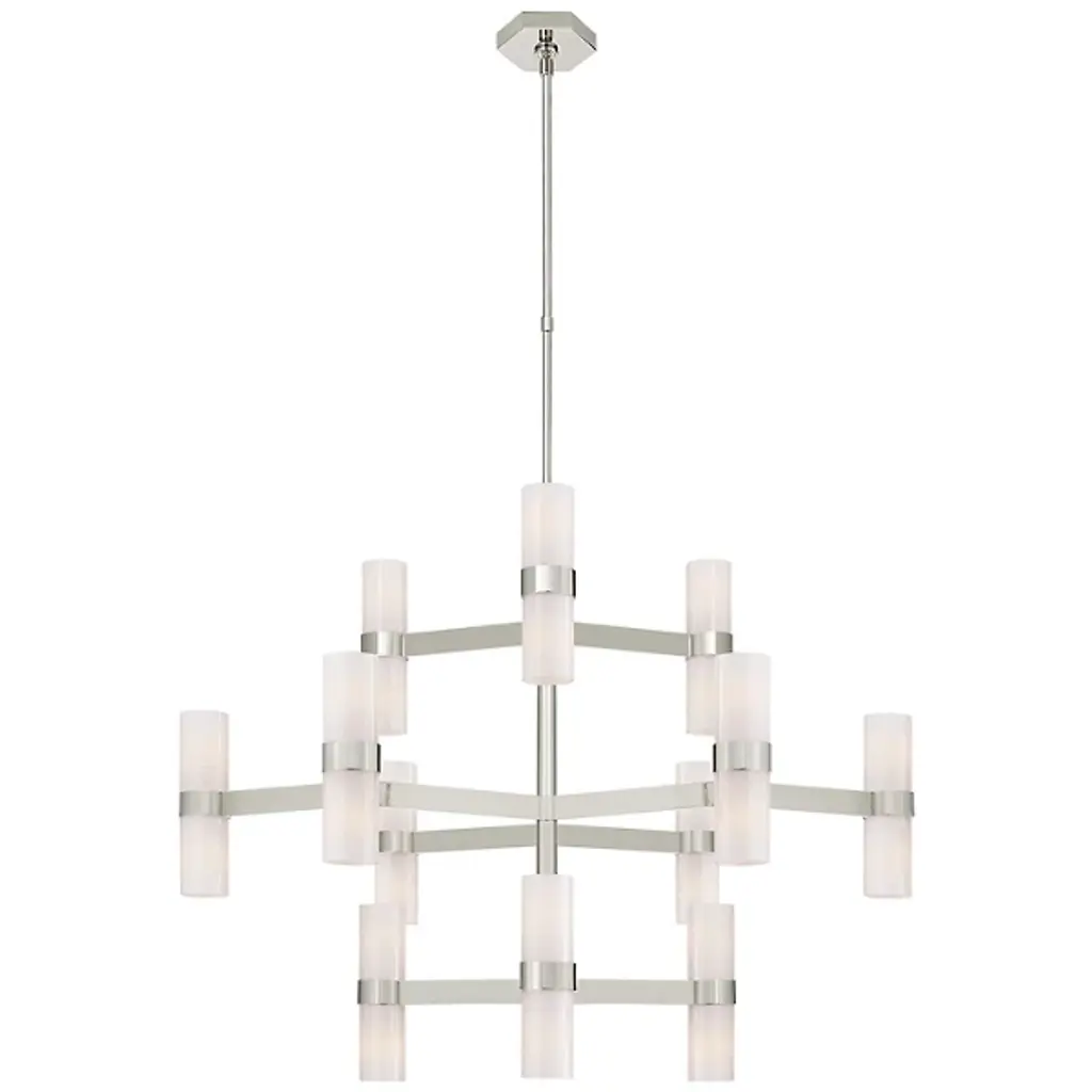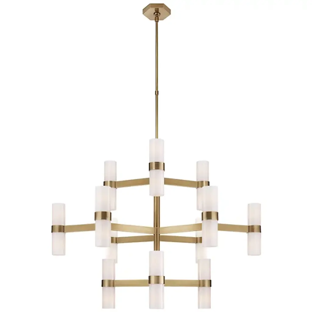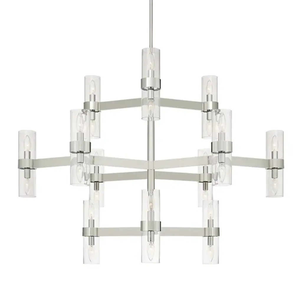 A mid-century modern take on a classic. The Margita 3-Tier Chandelier by Visual Comfort Signature, formerly known as Visual Comfort, is a fitting choice for both contemporary and transitional settings. This light fixture features an intricately designed metal frame with multiple metal bands stretching from a central stem. Each band clasps clear glass shades with incandescent lamps to illuminate the space with a warm ambiance. The chandelier comes with a hexagonal canopy that complements the overall look with its striking shape.