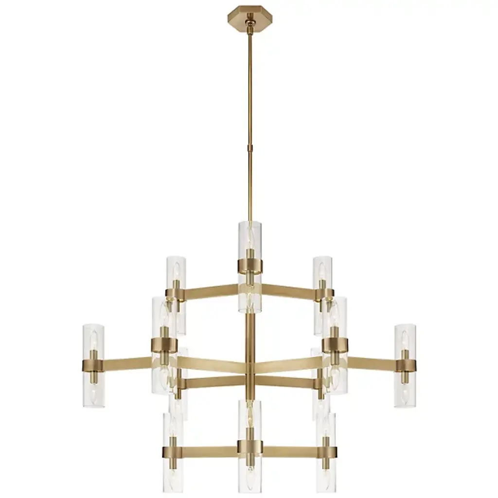 A mid-century modern take on a classic. The Margita 3-Tier Chandelier by Visual Comfort Signature, formerly known as Visual Comfort, is a fitting choice for both contemporary and transitional settings. This light fixture features an intricately designed metal frame with multiple metal bands stretching from a central stem. Each band clasps clear glass shades with incandescent lamps to illuminate the space with a warm ambiance. The chandelier comes with a hexagonal canopy that complements the overall look with its striking shape.
