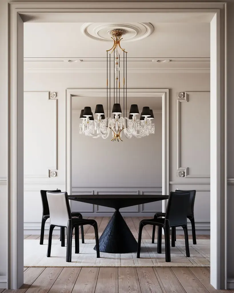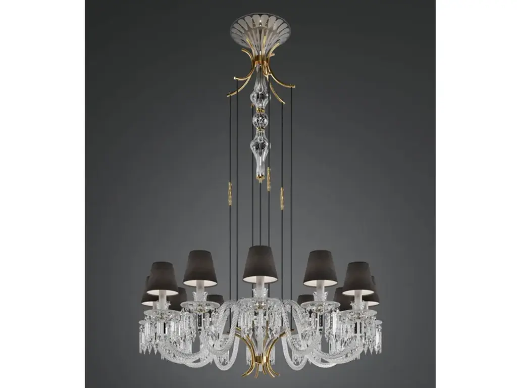 Margot is a suspension in crystal and artistic glass. Lampshades in anthracite fabric. Supporting structure in metal with matt black finish. Metallic decorative details with light gold finish with stones.Margot is a complete and perfect micro-architecture and takes inspiration from timeless classic design to interpret the most elegant contemporary trends. Rare as a pearl this chandelier is made of hand-carved crystal and glass. The decorative value of Margot is powerful, each element is skillfully combined to bring to life this iconic piece of great personality and decorative strength.Led bulbs: 12x6w - E14TRIAC