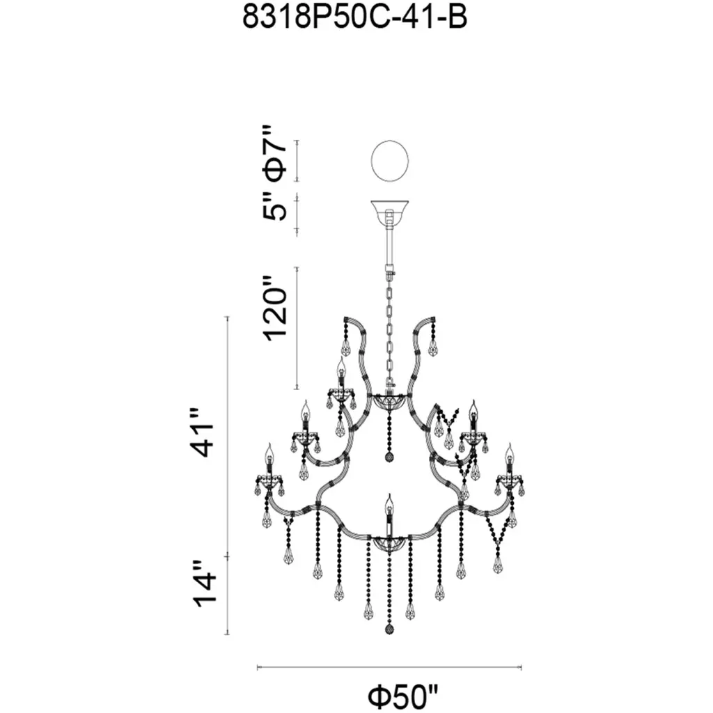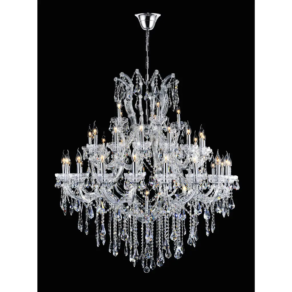 The Maria Theresa 41-Light Chandelier elevates any space with its graceful presence and chic elegance. This up chandelier features a magnificent 50-inch diameter design adorned with clear crystal embellishments that catch and reflect light beautifully, creating an opulent yet tasteful statement. The neatly curved candelabra arms and glossy chrome hardware work in harmony to create a refined look that brings both warmth and sophistication to your room. Ideal for making a lasting impression in dining rooms, foyers, or ballrooms, this exquisite light source combines timeless design with dazzling brilliance to transform your space into a showcase of refined style.