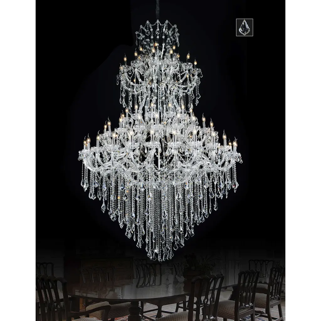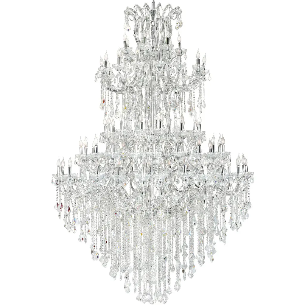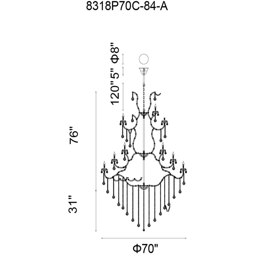The Maria Theresa 84-Light Chandelier is a masterclass in opulent design, featuring a multi-tiered structure with breathtaking scale and show-stopping appeal. This 70-inch up chandelier commands attention with its 84 bulbs and dazzling clear crystal adornments, creating a warm, inviting glow that elevates any grand space. The elegant candelabra-style arms and glossy chrome hardware work in harmony to deliver a look of refined sophistication without being overbearing. Perfect for ballrooms, event spaces, and palatial foyers, this chandelier balances majestic presence with timeless elegance, making it the centerpiece of any luxurious setting.