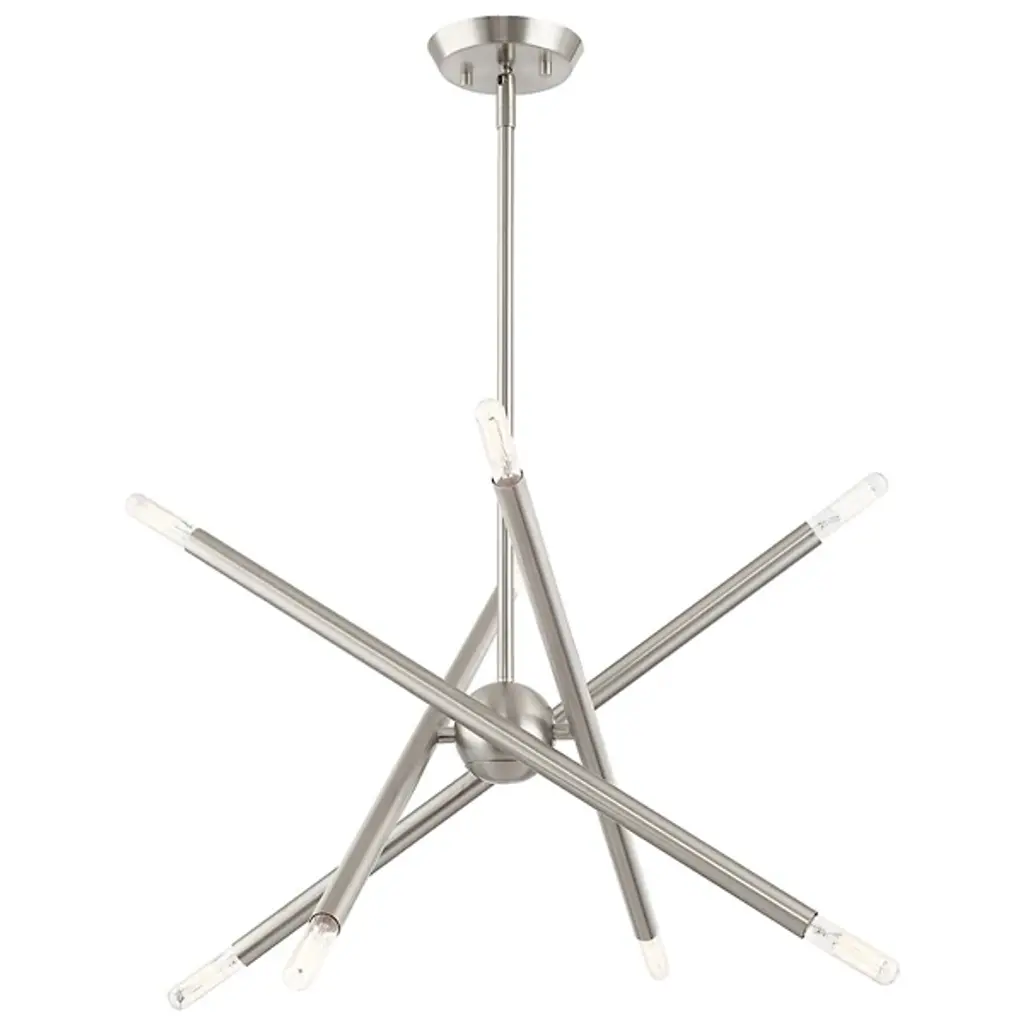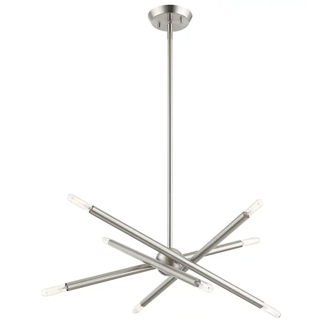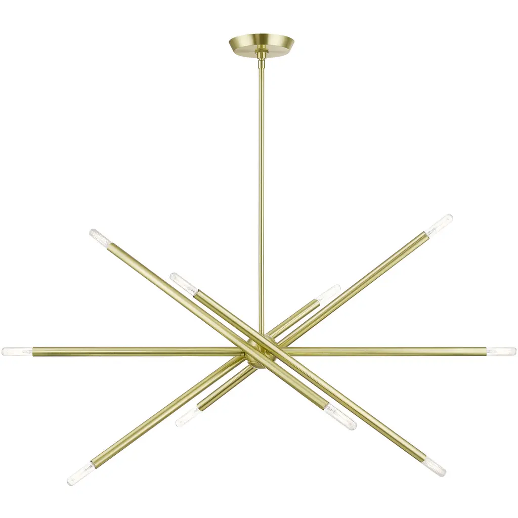 Enhance high ceilinged spaces with the retro-modern charm of the Mariann Chandelier from Alder & Ore. Retained by a beveled disc canopy, it extends a slender stem down to a smooth sphere-shaped hub below. This sphere supports a myriad of cylindrical branches that extend at different angles, while the end of each arm is capped by an open and damp-listed candelabra-style lamp that glitters off the surrounding metalwork with a warm wash of ambient light.