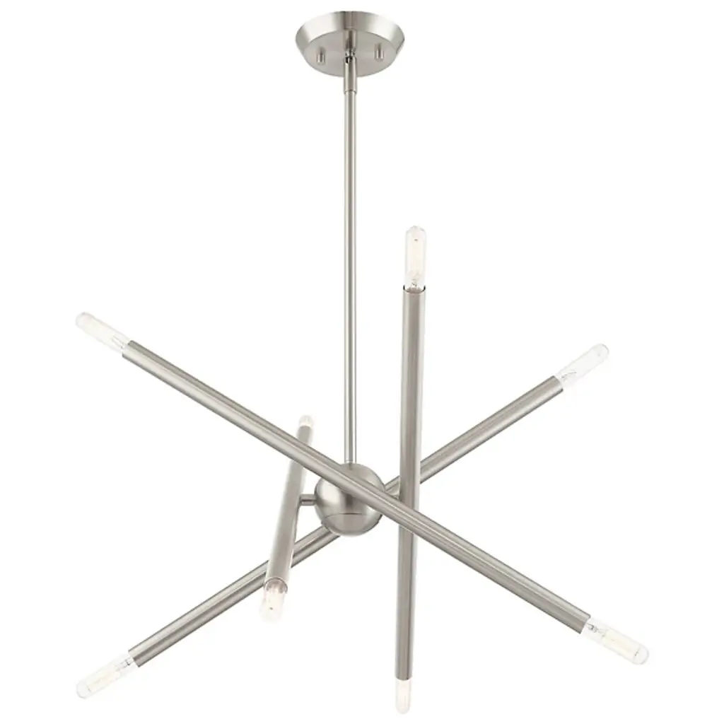 Enhance high ceilinged spaces with the retro-modern charm of the Mariann Chandelier from Alder & Ore. Retained by a beveled disc canopy, it extends a slender stem down to a smooth sphere-shaped hub below. This sphere supports a myriad of cylindrical branches that extend at different angles, while the end of each arm is capped by an open and damp-listed candelabra-style lamp that glitters off the surrounding metalwork with a warm wash of ambient light.