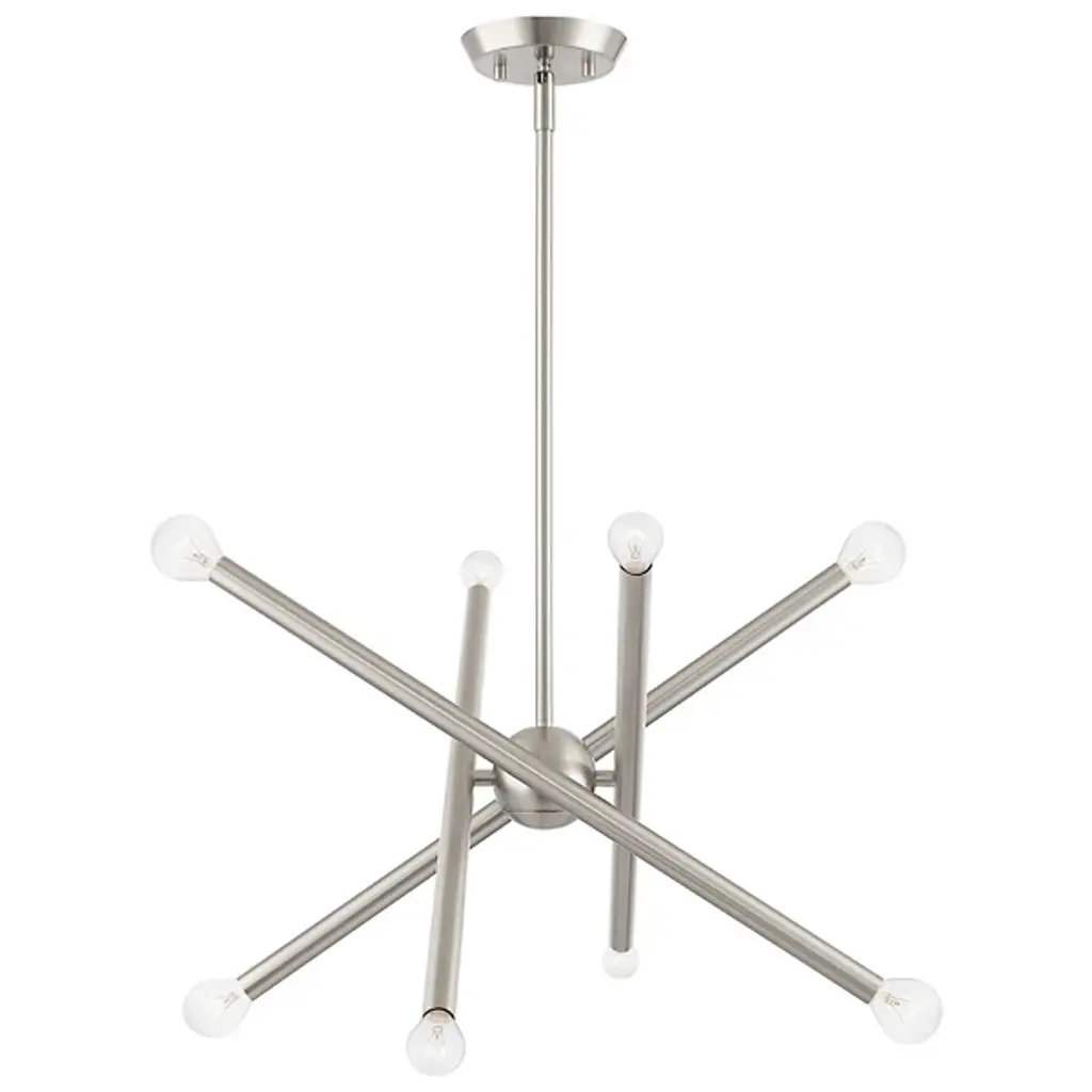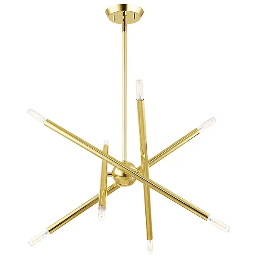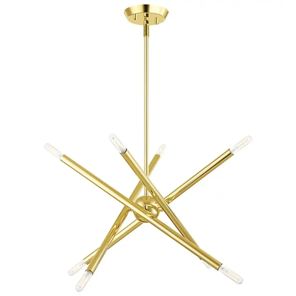 Enhance high ceilinged spaces with the retro-modern charm of the Mariann Chandelier from Alder & Ore. Retained by a beveled disc canopy, it extends a slender stem down to a smooth sphere-shaped hub below. This sphere supports a myriad of cylindrical branches that extend at different angles, while the end of each arm is capped by an open and damp-listed candelabra-style lamp that glitters off the surrounding metalwork with a warm wash of ambient light.