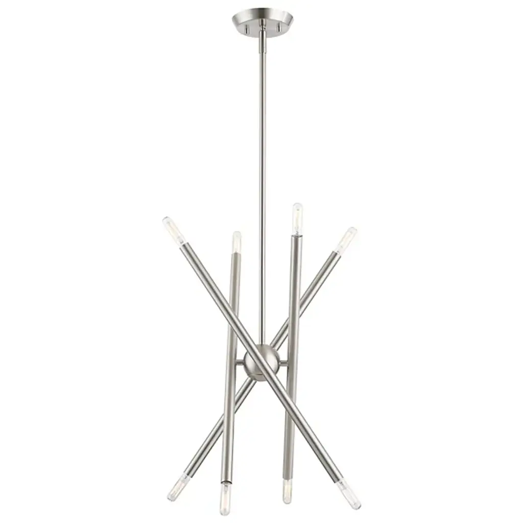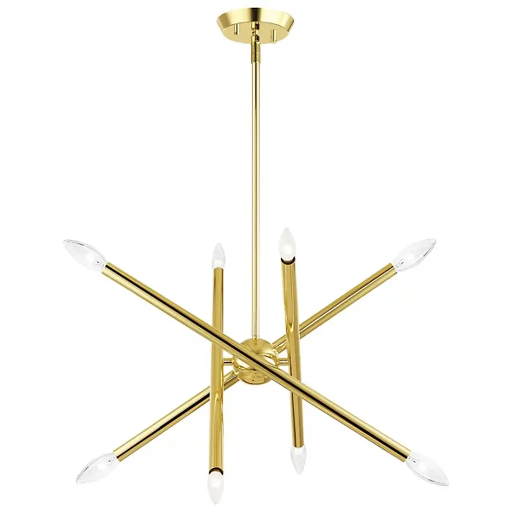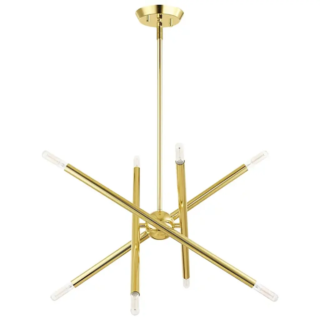Enhance high ceilinged spaces with the retro-modern charm of the Mariann Chandelier from Alder & Ore. Retained by a beveled disc canopy, it extends a slender stem down to a smooth sphere-shaped hub below. This sphere supports a myriad of cylindrical branches that extend at different angles, while the end of each arm is capped by an open and damp-listed candelabra-style lamp that glitters off the surrounding metalwork with a warm wash of ambient light.