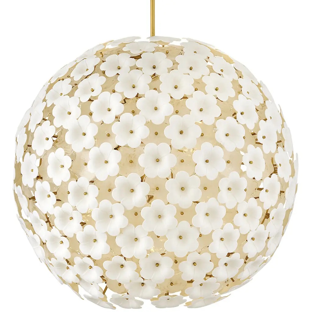 Decadently arranged in glamorous clusters, Mariannes wispy-patterned white glass and ceramic blossoms create an elegant organic silhouette enhanced by a luxurious glow. Intricate frames in our Deluxe Gold finish capture warm inviting illumination.