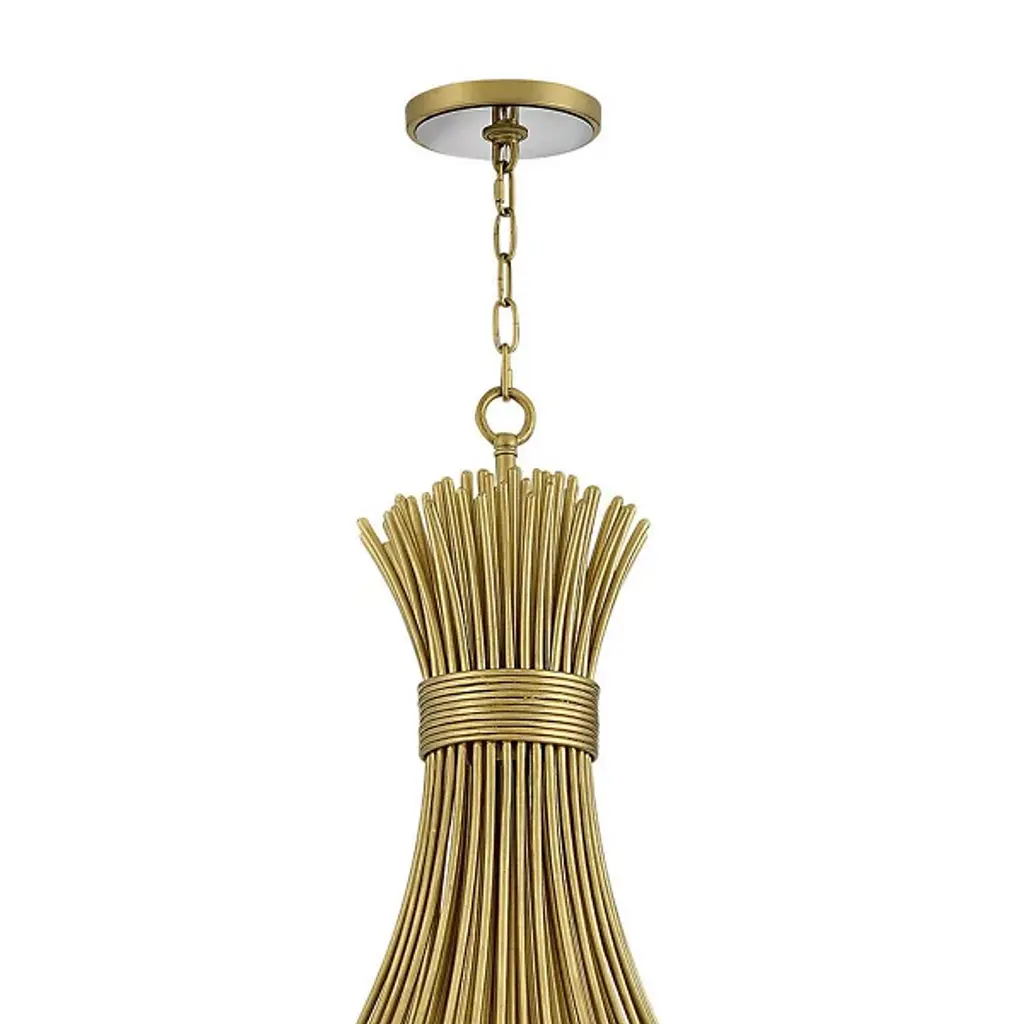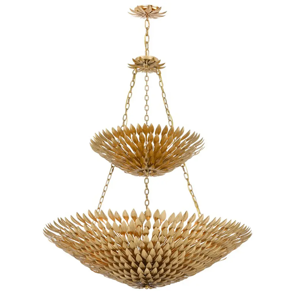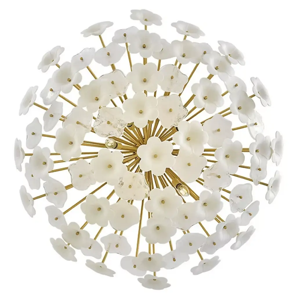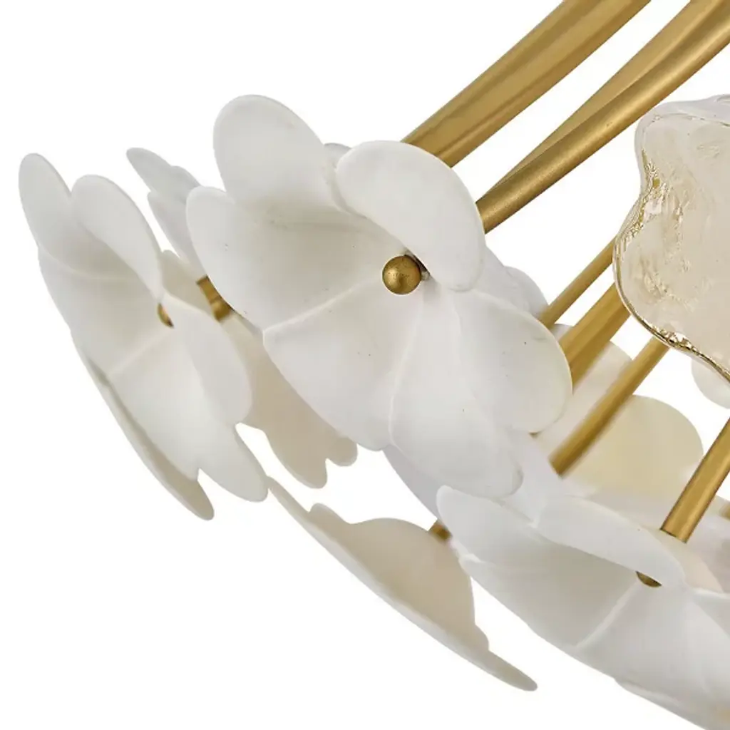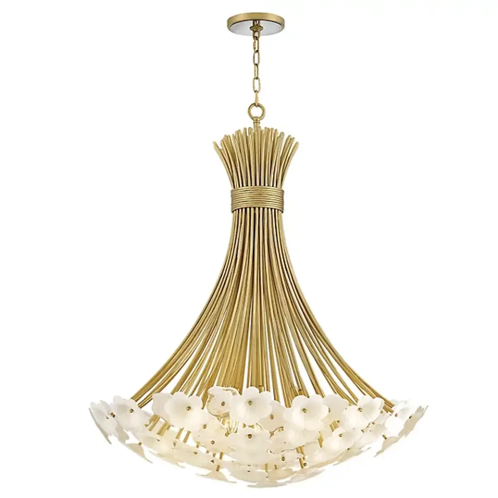 The Marianne Chandelier from Currey & Company features a carefully arranged cluster of white pressed glass and ceramic blossoms, forming a refined organic silhouette. Its intricate frame, finished in Deluxe Gold, enhances the fixture’s warm, ambient illumination. Designed to blend traditional and modern elements, it offers a sophisticated yet streamlined aesthetic. With its delicate textures and high-quality materials, this chandelier serves as both a decorative focal point and a functional lighting solution for various interior spaces.