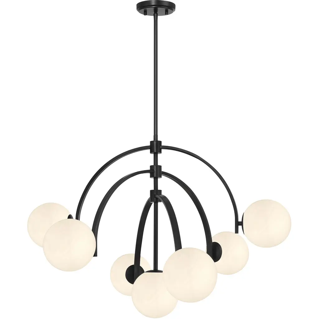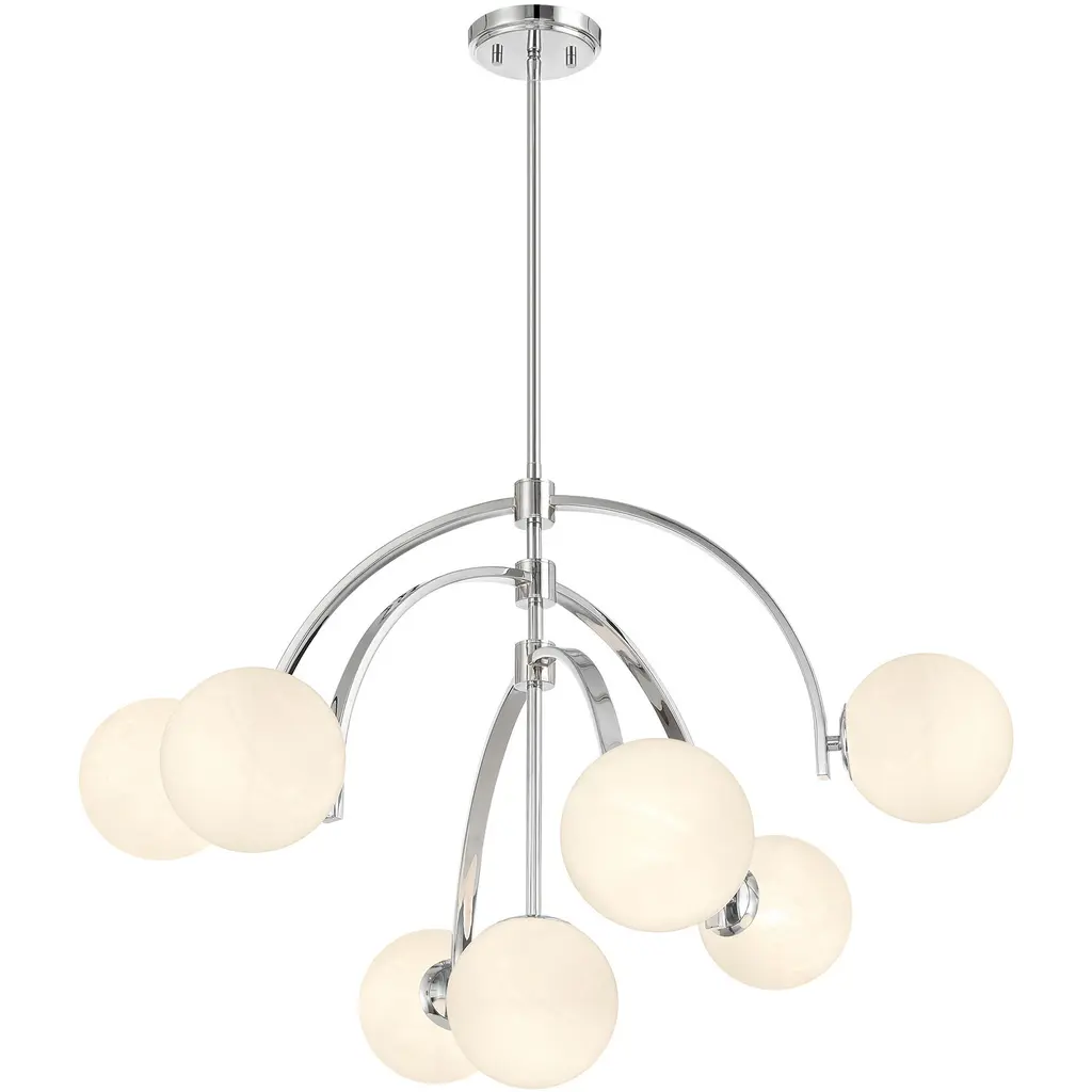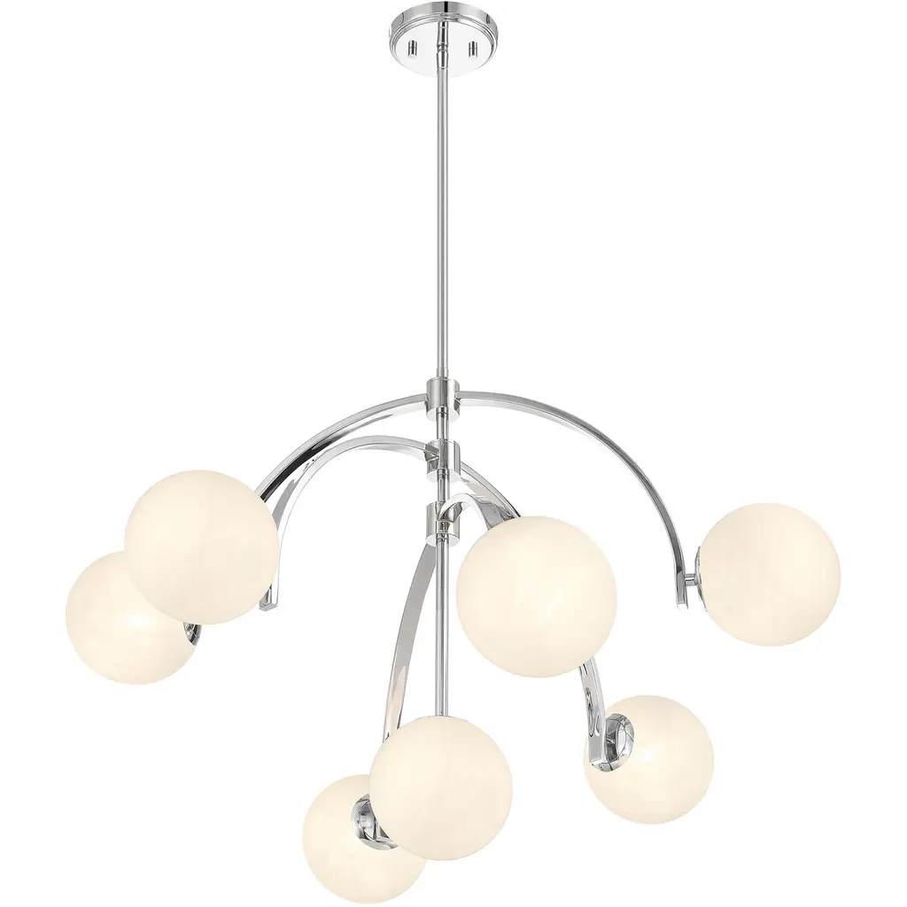 Create a lighting look all your own with the Savoy House Marias 7-light chandelier. It brings intriguing Art Deco inspired style with three adjustable arching arms that hold orbs of eye-catching strie glass. Move the arms around to change things up any time you want Chrome finish. Marias is 32" in width and has an adjustable height ranging from 22" to 76". Comes with four 12" downrods and one 6" downrod. Uses seven candelabra size bulbs of up to 60 watts per bulb. Bulbs not included.