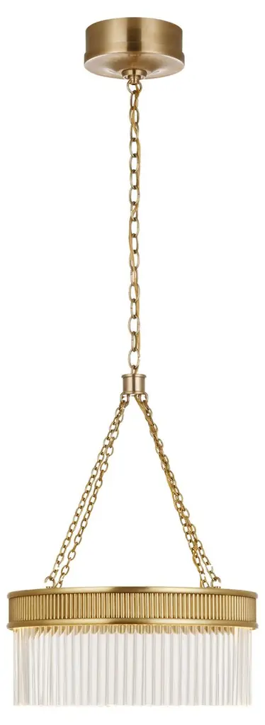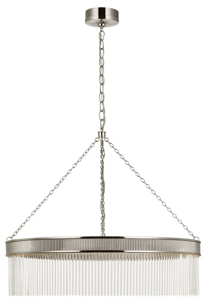 Menil Large Chandelier in Soft Brass with Crystal Rods Designer: Marie Flanigan Canopy: 6" Round Mounting: Chain Shade Detail: Crystal Rods Socket: Dedicated LED Wattage: 85w (6800lm) Safety Rating Location: Damp Note: Requires Assembly