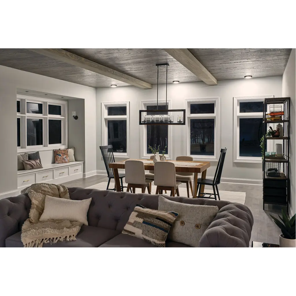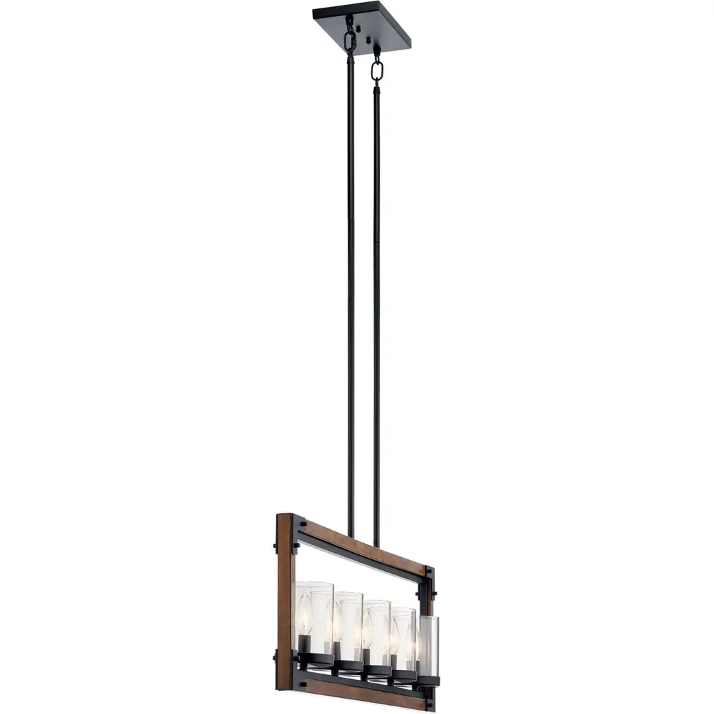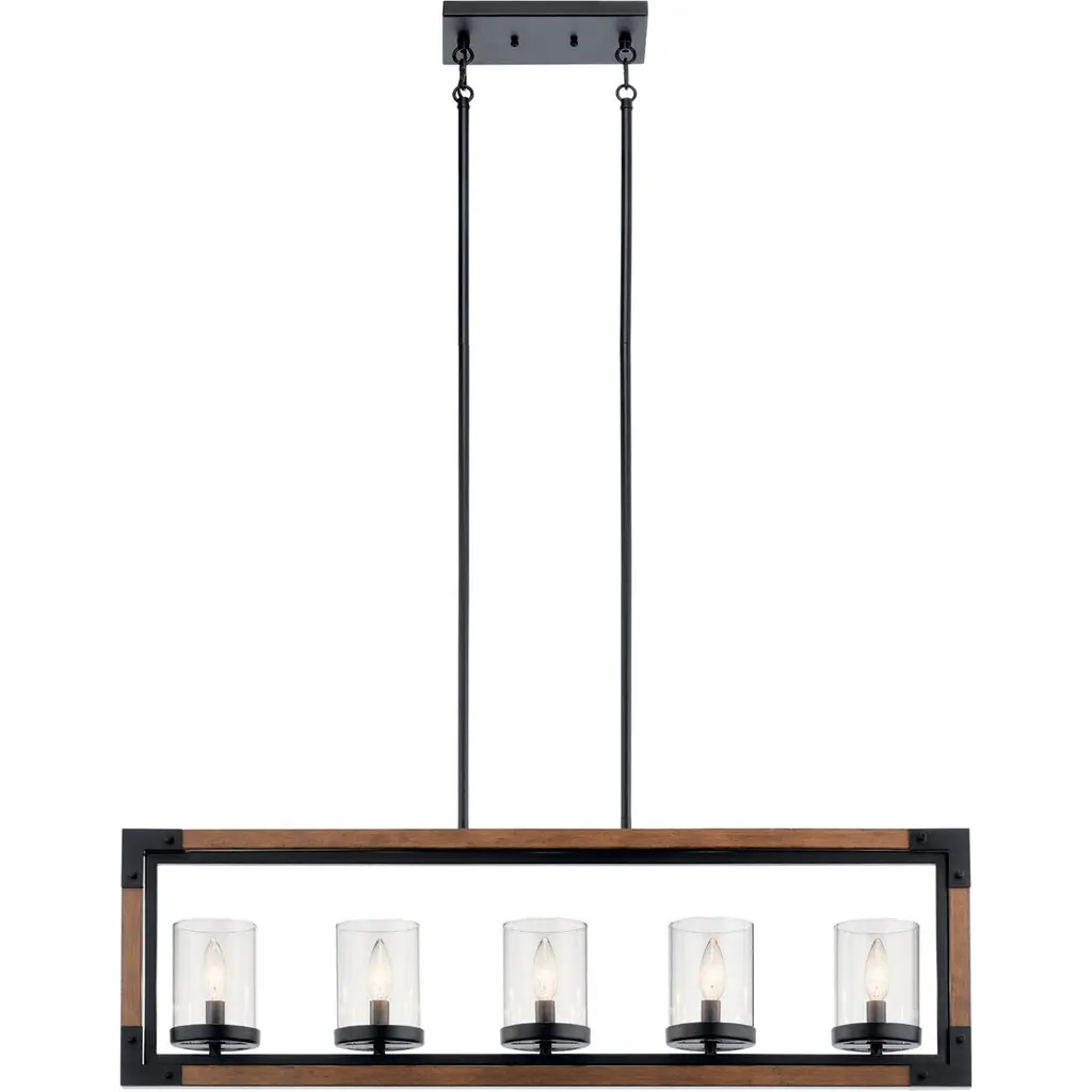 Warm and welcoming tones give the Marimount 5 light linear chandelier a vintage feel. The wood-look structure offers weathered style in a rich Auburn finish, framed in Black metal. Clear glass shades assure the light shines through.