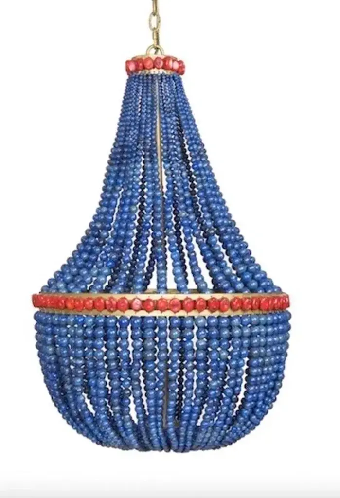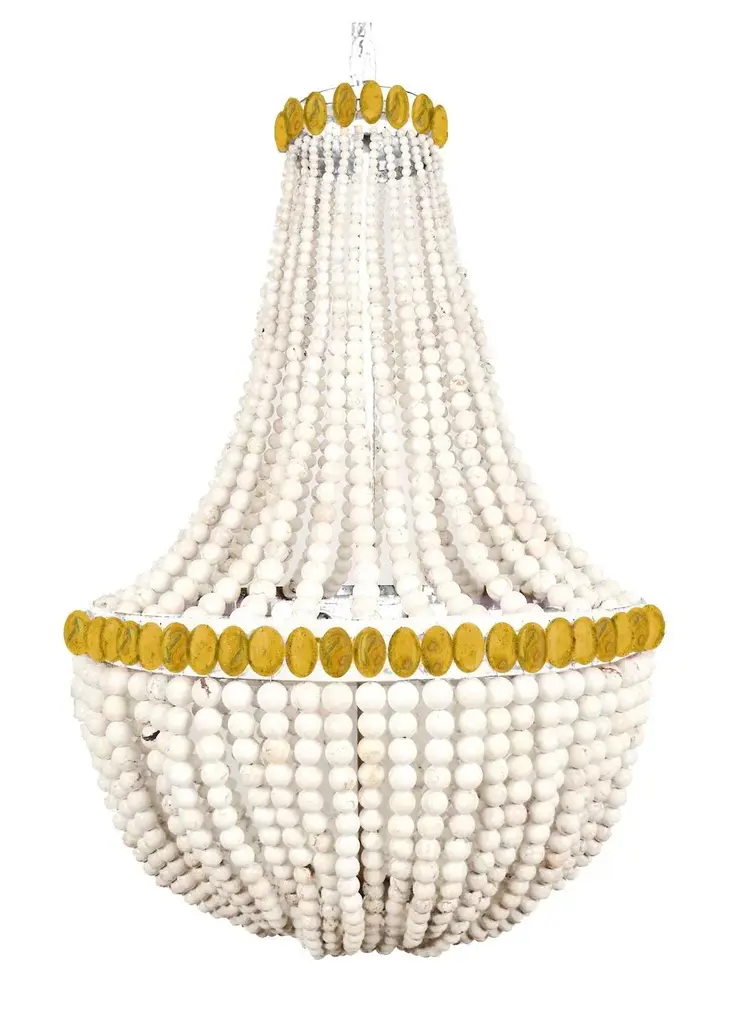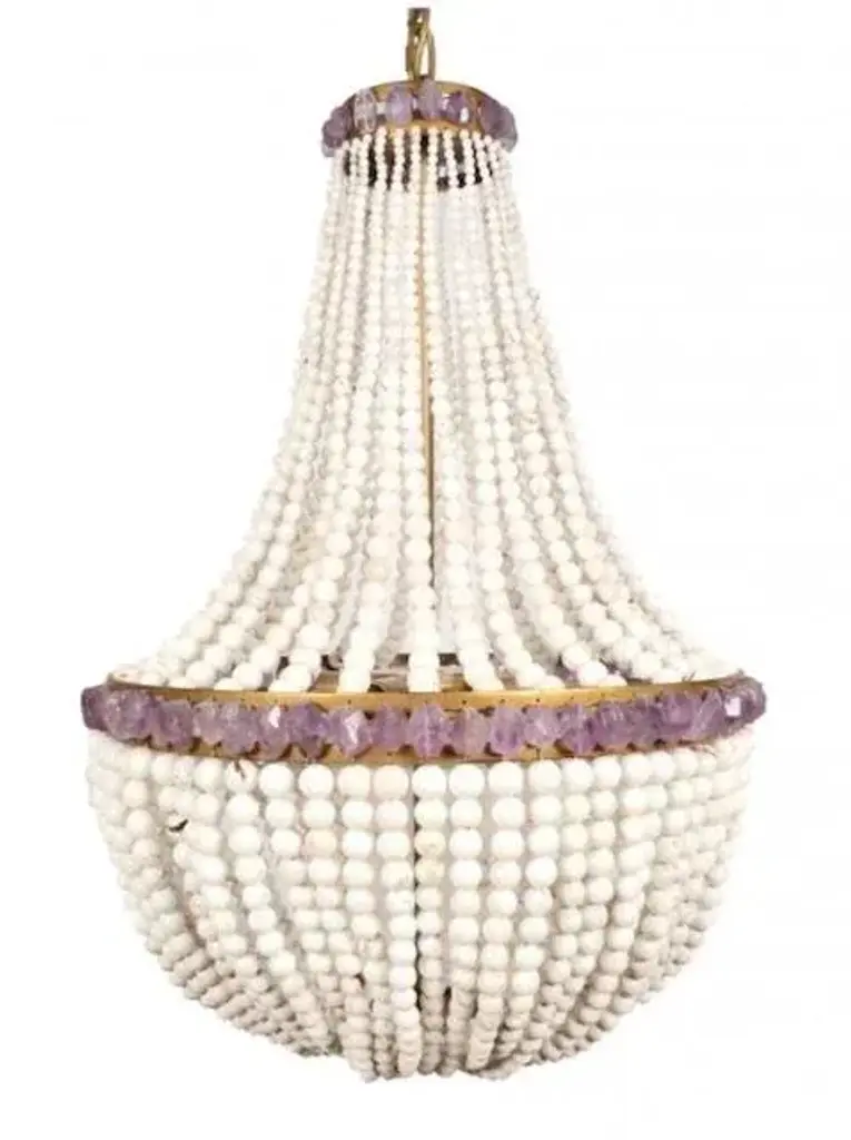One of the most sought after of the Marjorie Skouras Empire series, the Jany is made of a wrought iron frame and chain with a painted antique gold finish, and dressed with white turquoise stones, each one made to order, and rough-cut amethyst accent stones. A fabulous combination of color and texture. This is a one of a unique offering as we only have enough of the rough cut amethyst to make one more chandelier! VOLTAGE/LAMP : 120V / 4 porcelain sockets 60-watts bulbs max CHAIN : 36" standard chain length attached to round canopy