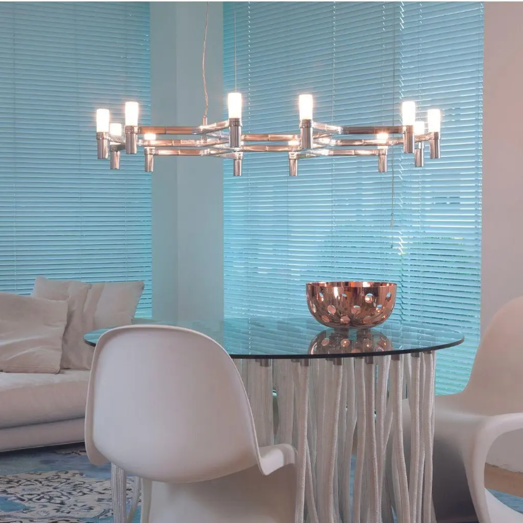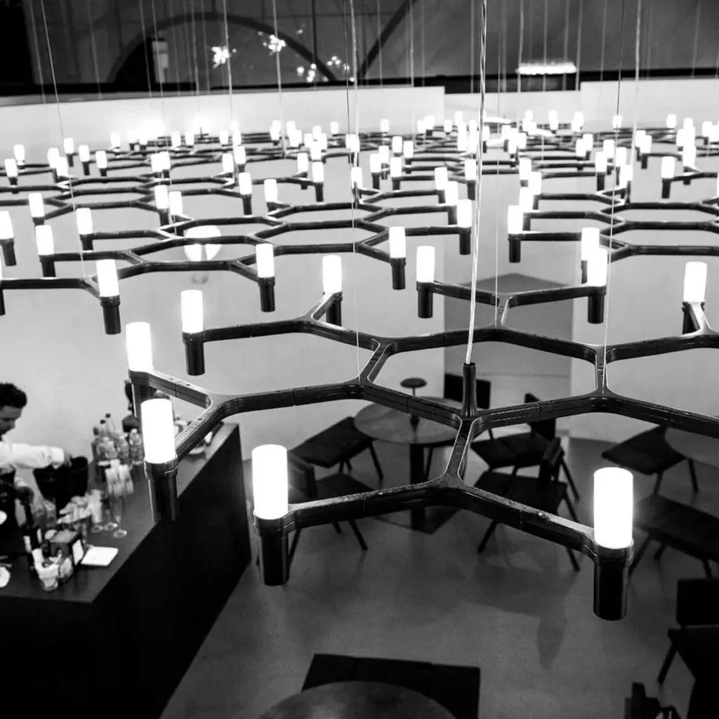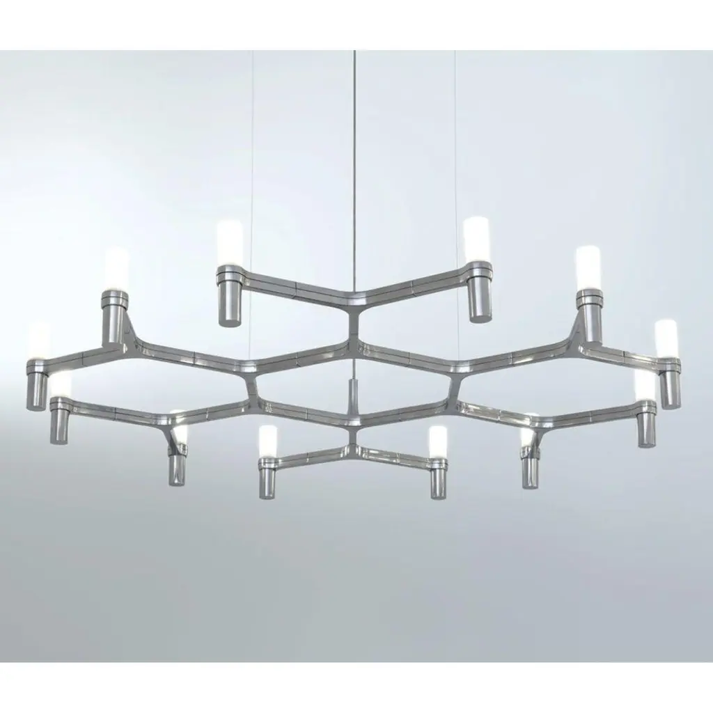 Markus Jehs, Jürgen Laub 'Crown Plana Minor' chandelier in plated black for NemoExpertly designed by Markus Jehs and Jürgen Laub this chandelier's form is inspired by the uniqueness & individuality of nature's snow crystal. Featuring modular lamps and die-casted aluminum structure with sandblasted glass diffusers, the resulting output is a widespread and warm light.Nemo was founded in 1993 by Franco Cassina and Carlo Forcolini in Meda, Italy. The company was established to recreate the lighting pieces that best represented the "Golden Age" of Italian lighting design of the 1960s and '70s, namely those created by the Italian modernist Franco Albini.Price per item. Available to order in unlimited quantities and in choice of six different finishes: hand polished aluminum, glossy gold plated, glossy black plated, matte white, matte black, or matte gold. This listing is for the lamp in plated black.In-stock lead-time 8-9 weeks. Out of stock can add an additional 8 weeks or more. Availability and lead time are subject to change without notice. Please inquire for current lead time prior to placing time-sensitive orders.Suspended by a transparent cable with a maximum length of 8.2'. Double switched and dimmable according to bulb. 12x 25W G9 bulbs included. This lamp is IP20 rated and UL listed.Made to order.All sales are final.