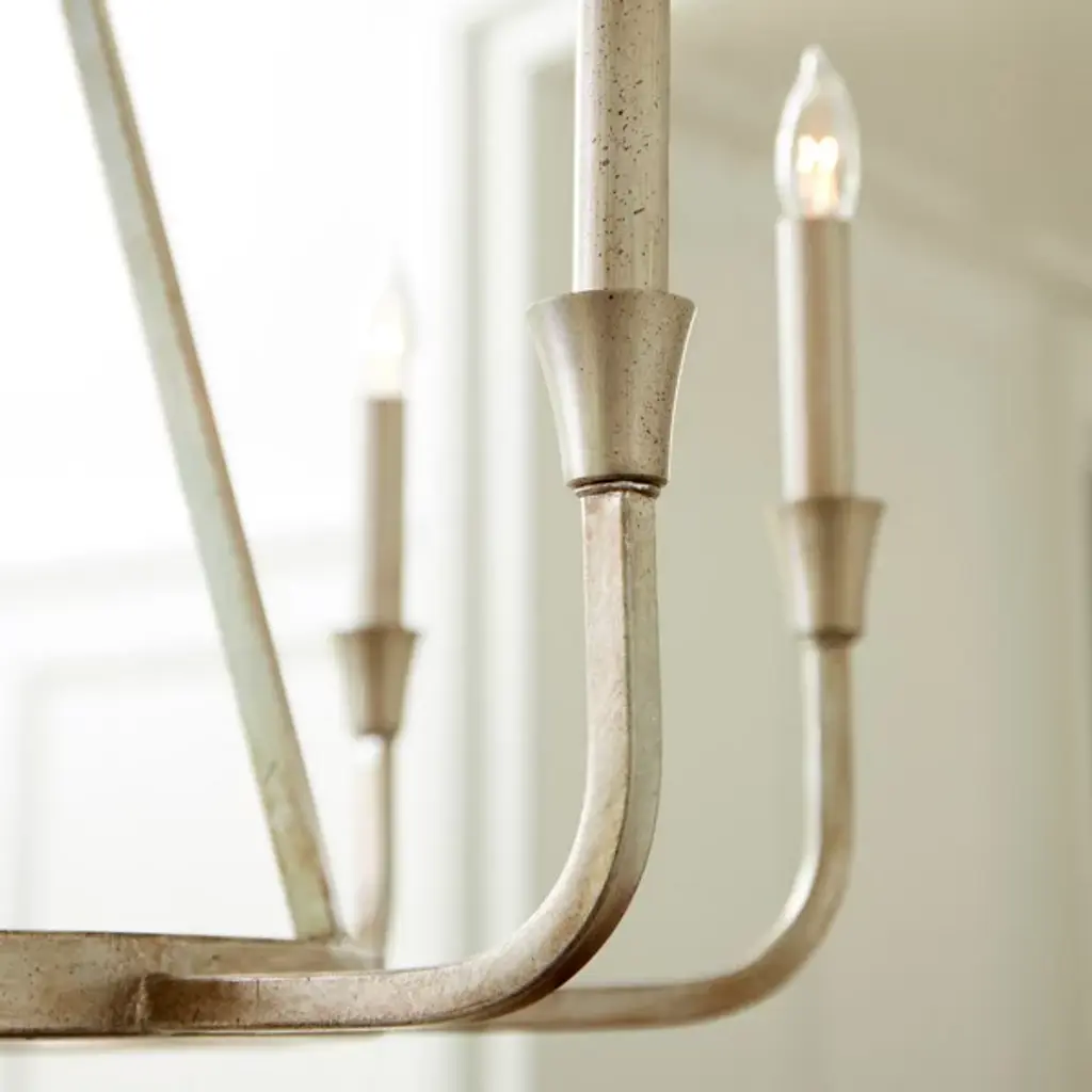 A graceful piece that stands out in the home. The Marquee Chandelier from Quorum International uses smooth metal to form an appealing silhouette. Hanging from the ceiling by a simple chainlink and downrod combination, this piece features several thin metal lines that gently curve. A ring base sprouts a set of arms that each lead to a candelabra-style bulb. The light from the bulbs is bright and even, creating a welcoming display throughout the room.