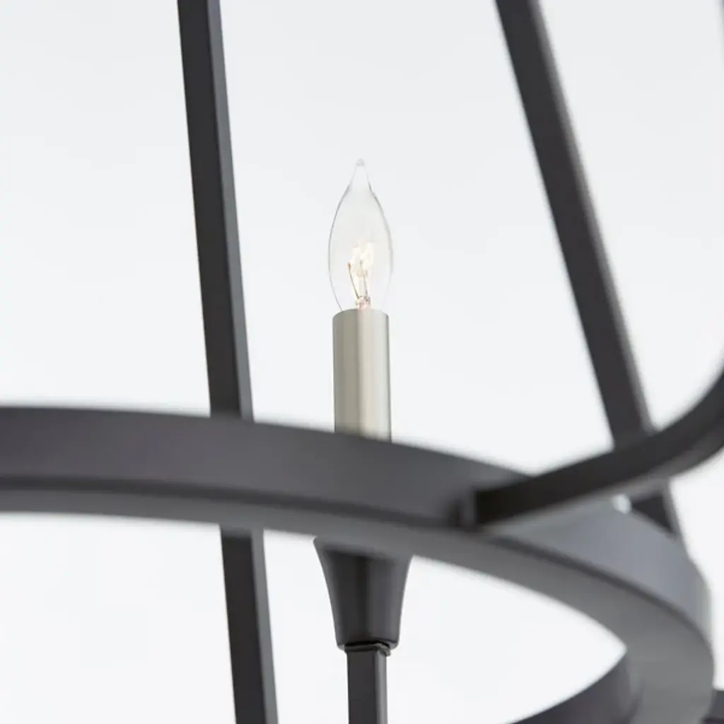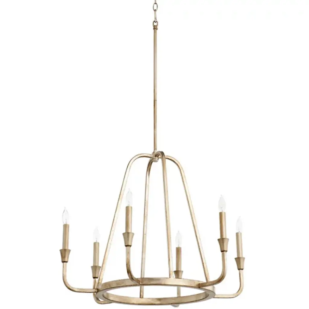 A graceful piece that stands out in the home. The Marquee Chandelier from Quorum International uses smooth metal to form an appealing silhouette. Hanging from the ceiling by a simple chainlink and downrod combination, this piece features several thin metal lines that gently curve. A ring base sprouts a set of arms that each lead to a candelabra-style bulb. The light from the bulbs is bright and even, creating a welcoming display throughout the room.