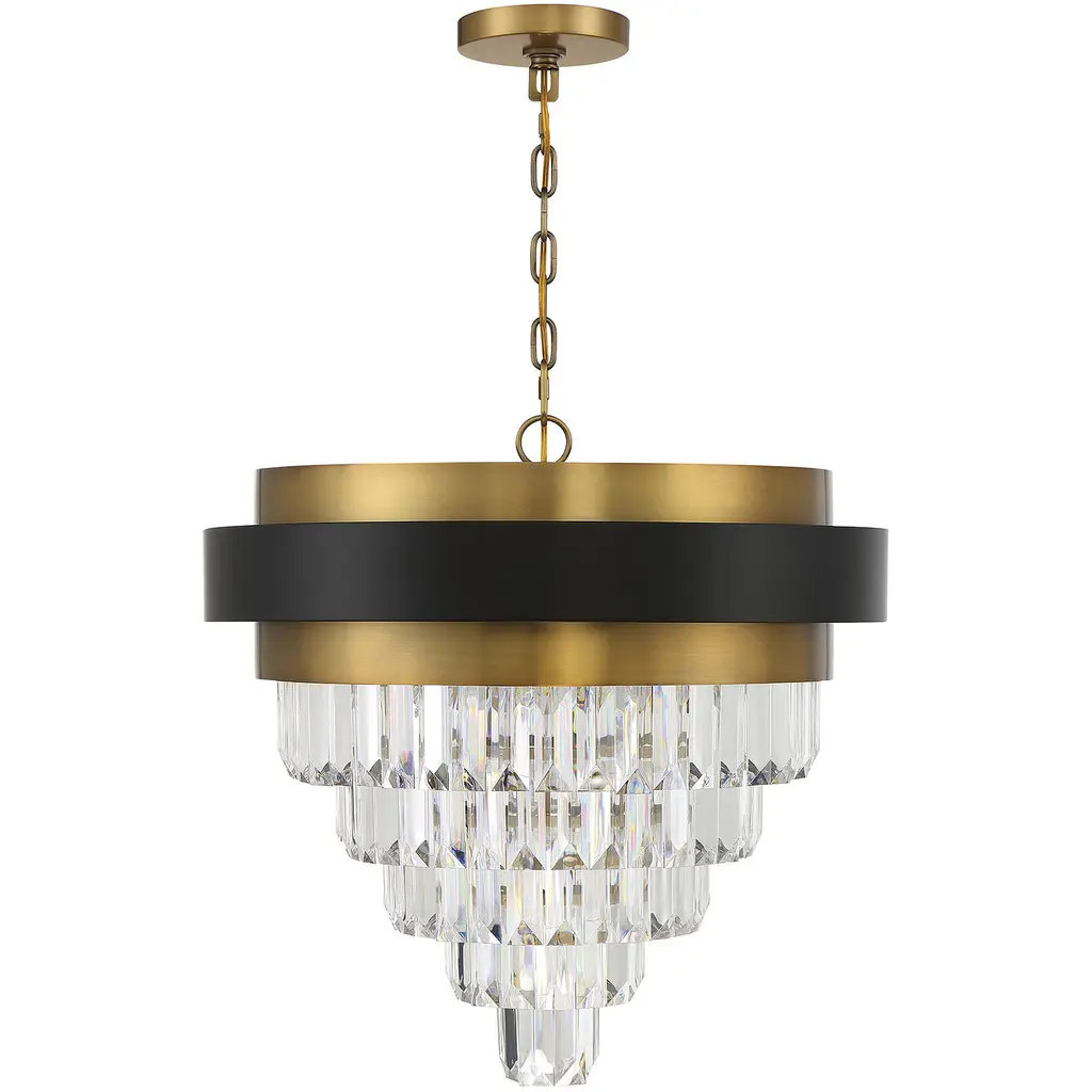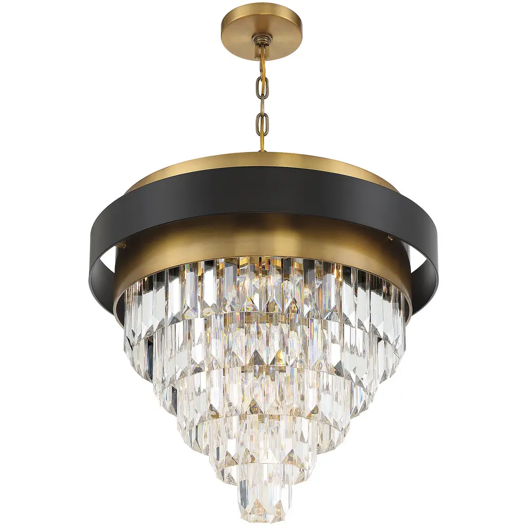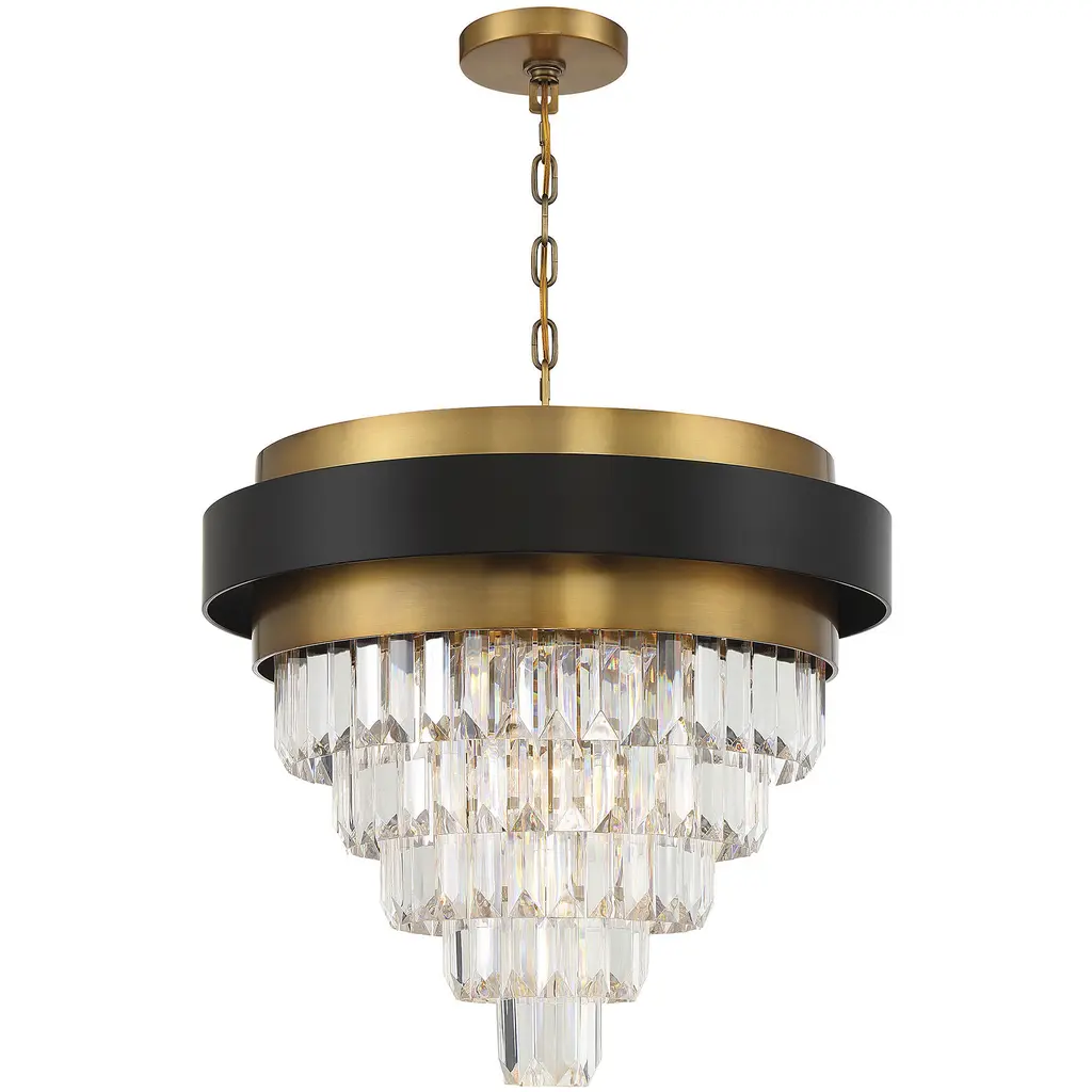 Tiers of shimmering faceted acrylic gems cascade down to create a gorgeous look in the Savoy House Marquise 4-light chandelier. At the top, its band of matte black and warm brass adds a dose of classic, timeless glamour. Marquise truly is fine jewelry for the home. This chandelier is 23" in height and 24" in width. Uses four standard size bulbs of up to 60 watts per bulb. Comes with 120" of chain and 144" of cord.