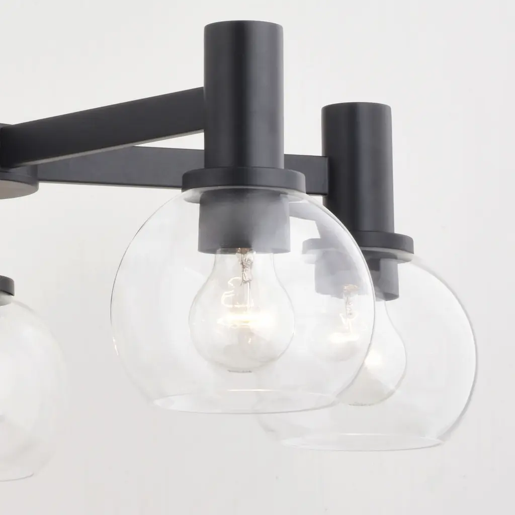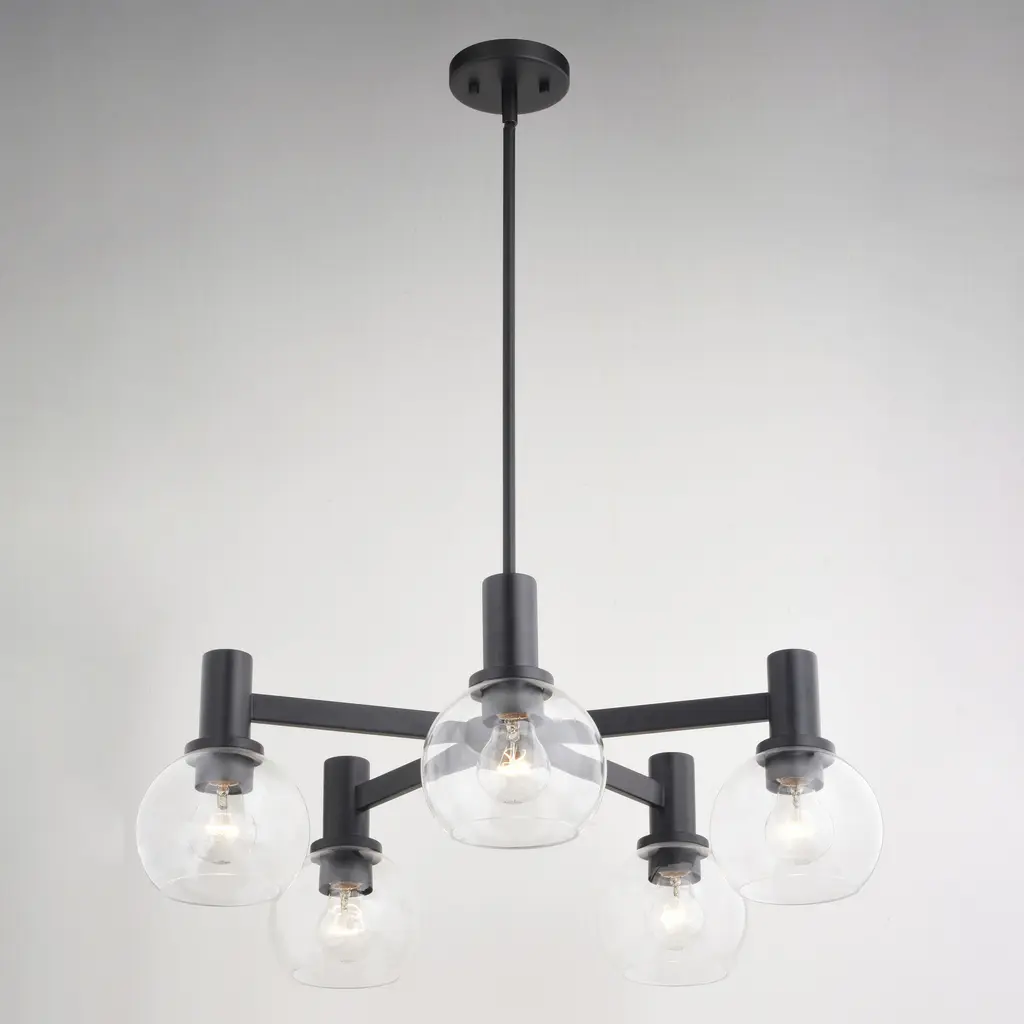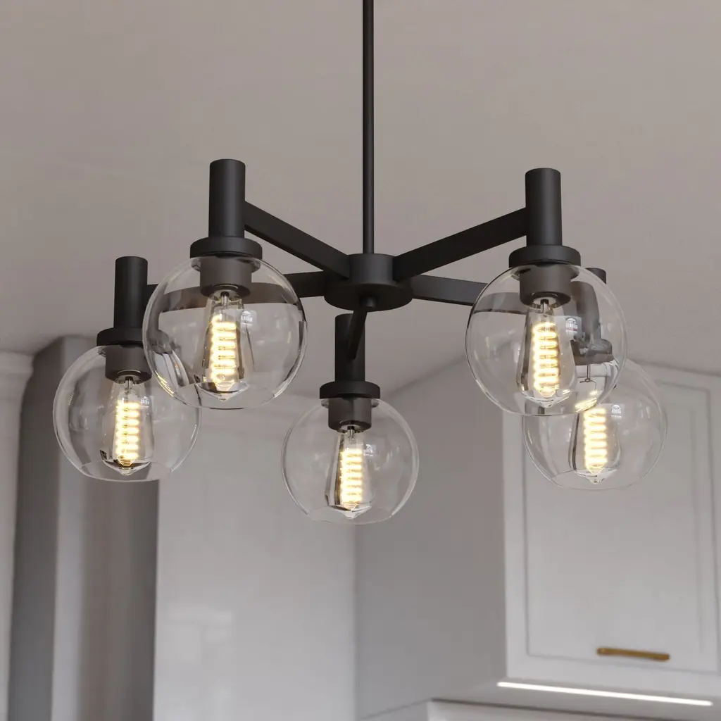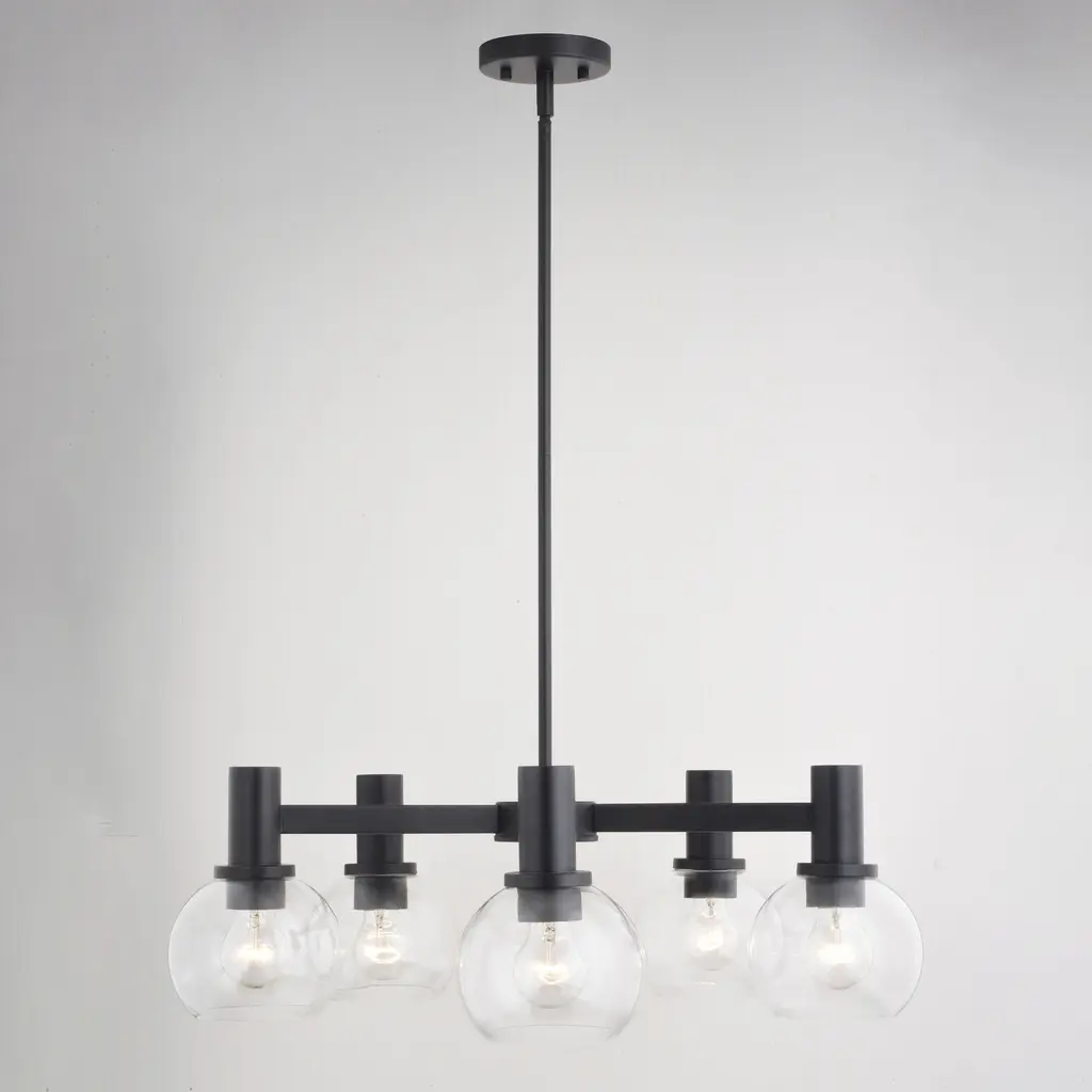 The Marshall collection is transitional style with a contemporary flair at a competitive price. Stately arms finished in matte black support clear glass globes for the perfect balance of dark versus light. Height is adjustable with the included down rods compatible with sloped ceilings. This chandelier light is ideal for dining areas, kitchens or any other living area where a little extra style is desired.