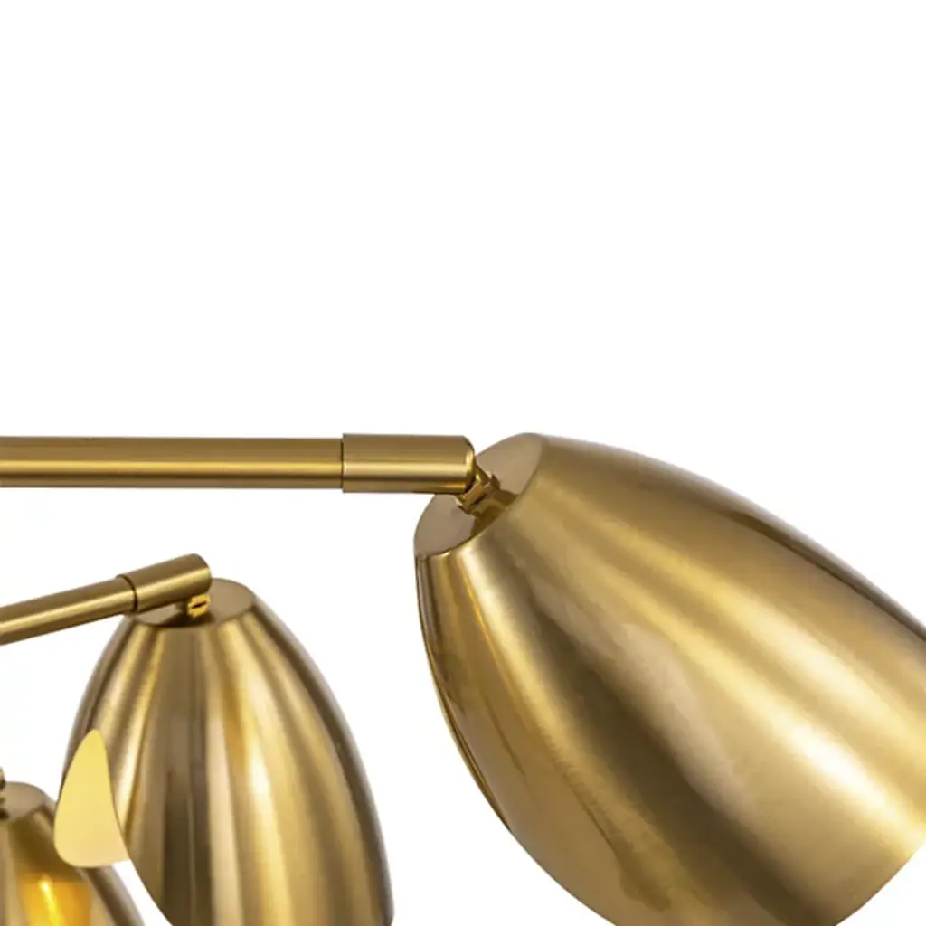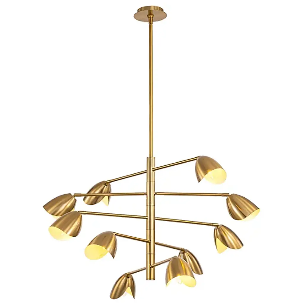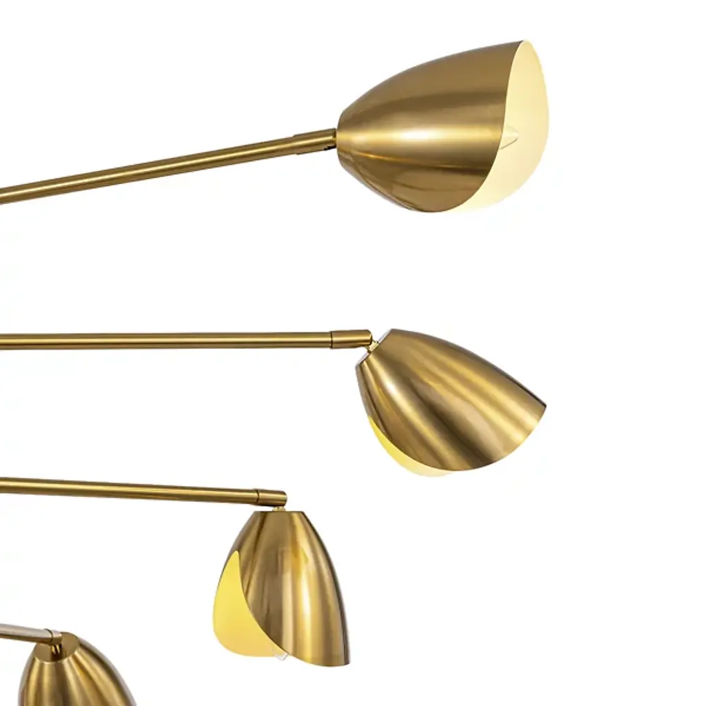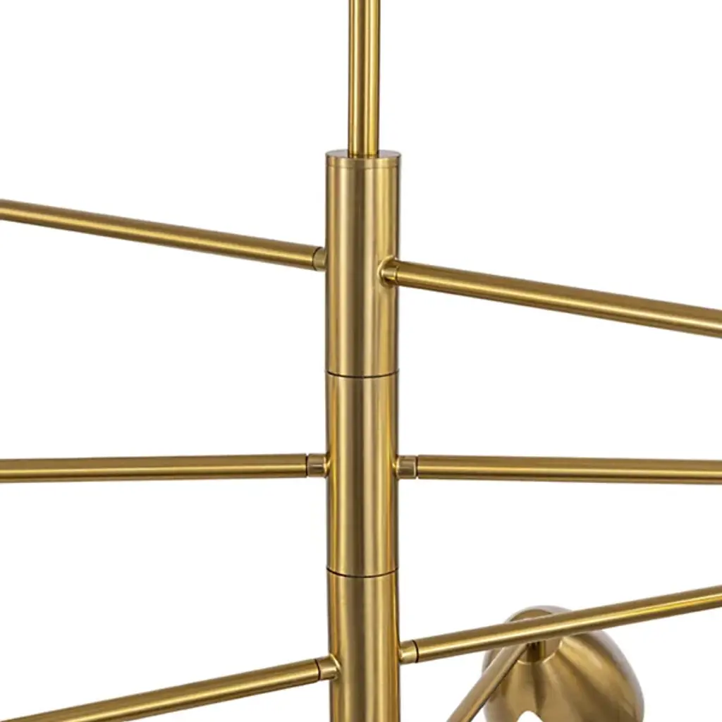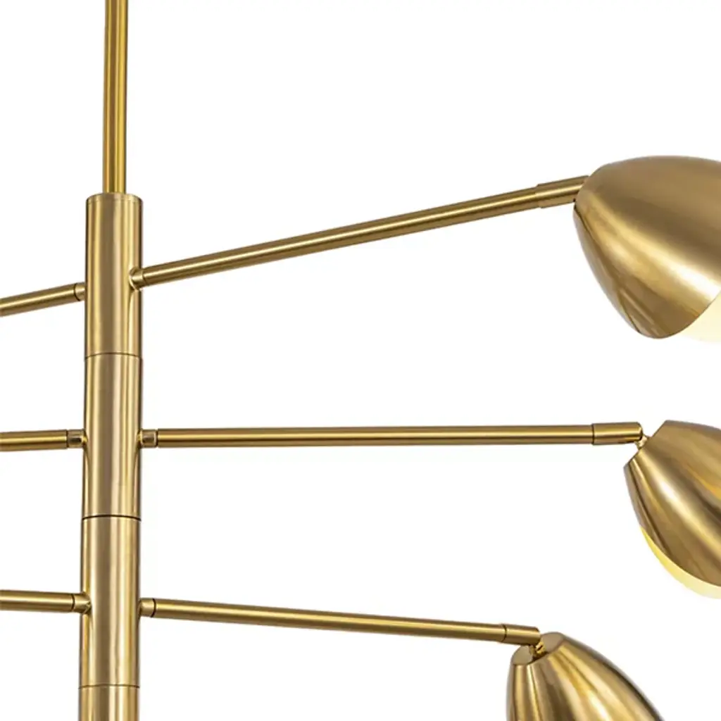 The Marshall Multi-Light Chandelier from Alder & Ore brings interiors a bold, artistic presence. A single column featuring adjustable arms and rotating scoop-style light heads allows for customized illumination while adding depth and dimension to any space. Each fixture is constructed from high-quality steel with a brushed brass finish, blending mid-century modern and contemporary influences. Its versatile design makes it an eye-catching addition to interiors, adding reflected radiance and direct downlight in equal measure.