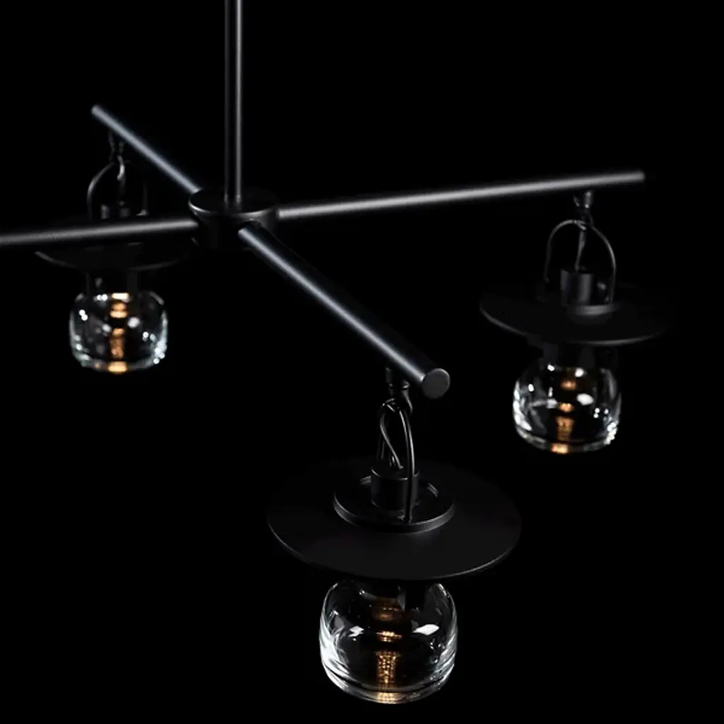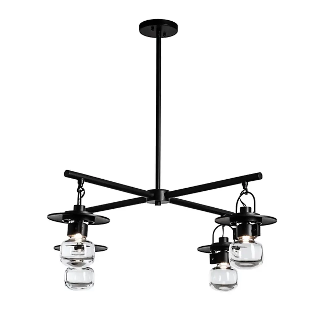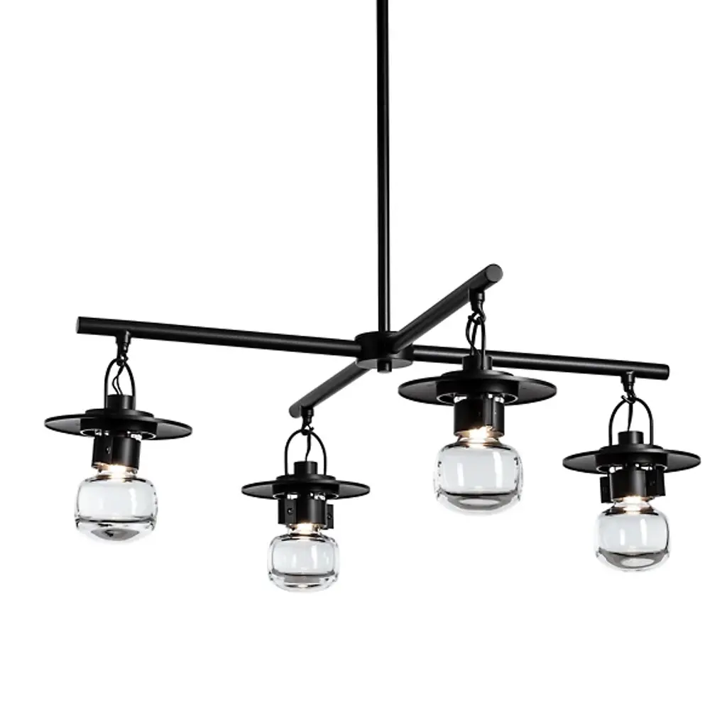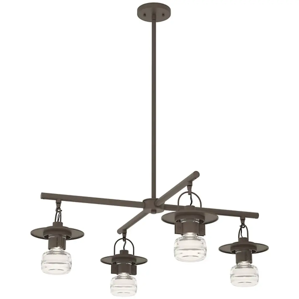 A classic style updated for the modern home. The Mason Outdoor Chandelier by Hubbardton Forge makes a bold addition to a chic patio or porch. Thick blown glass shades hang from the ends of robust metal arms, each topped with a wide metal brim resembling a lantern’s hood. Its light is contained inside the base of each glass shade, creating a dimensional effect when illuminated. Handcrafted from weather-resistant materials, this fixture is designed to make a lasting impression.