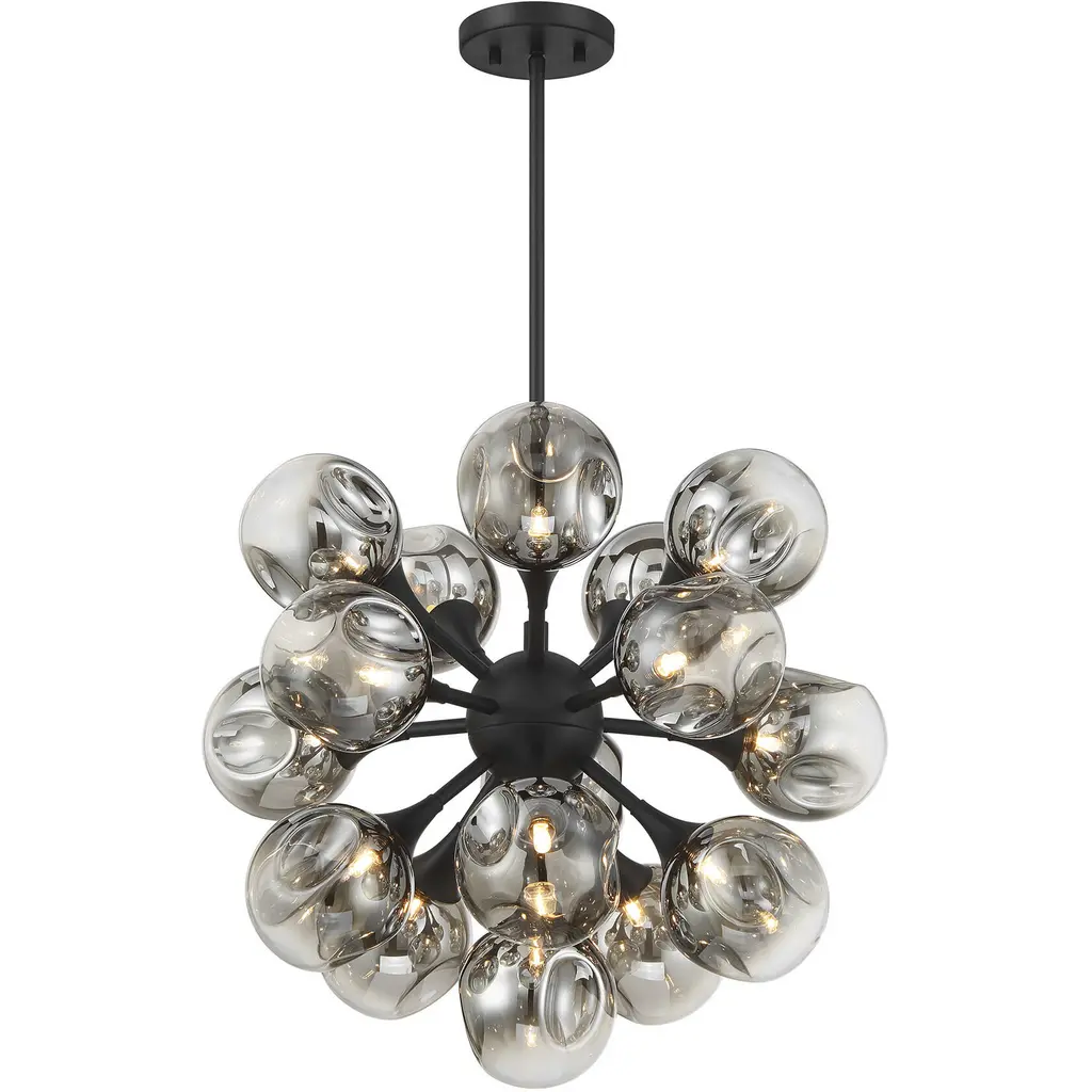 Heighten the drama of any room with the boldly beautiful Savoy House Matisse 16-light pendant. Its Sputnik style structure is studded with eye-catching dimpled shades of grey asymmetric plated glass and finished in Matte Black to create a spectacular look. Matisse is 22" in width and has an adjustable height ranging from 19.5" to 73.5". Uses sixteen G9 bulbs, which are not included. Comes with four 12" downrods and one 6" downrod.