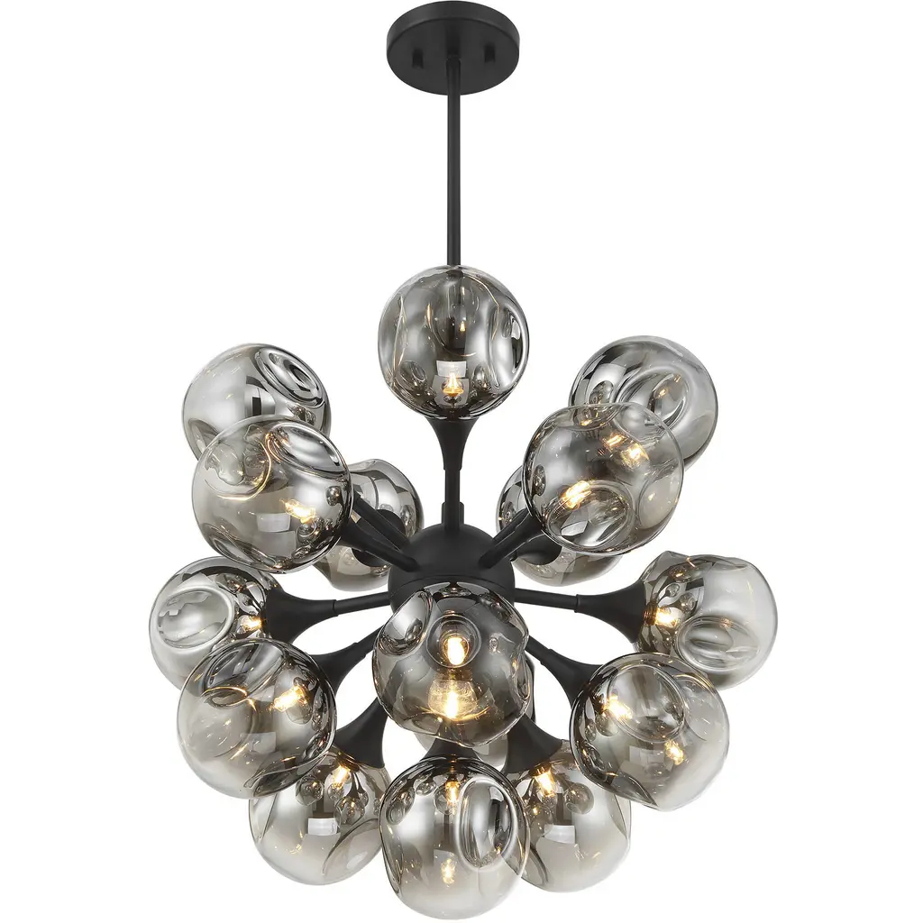 Heighten the drama of any room with the boldly beautiful Savoy House Matisse 16-light pendant. Its Sputnik style structure is studded with eye-catching dimpled shades of grey asymmetric plated glass and finished in Matte Black to create a spectacular look. Matisse is 22" in width and has an adjustable height ranging from 19.5" to 73.5". Uses sixteen G9 bulbs, which are not included. Comes with four 12" downrods and one 6" downrod.