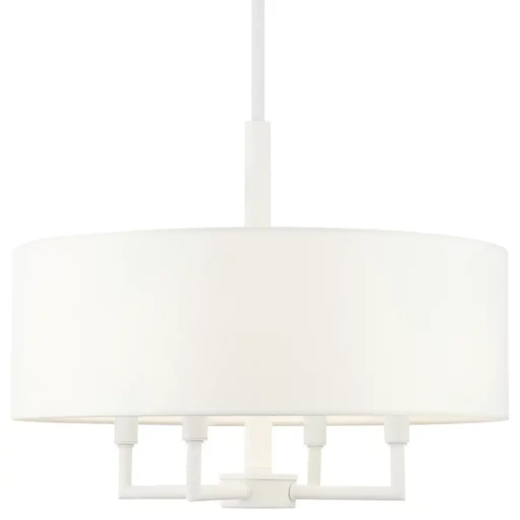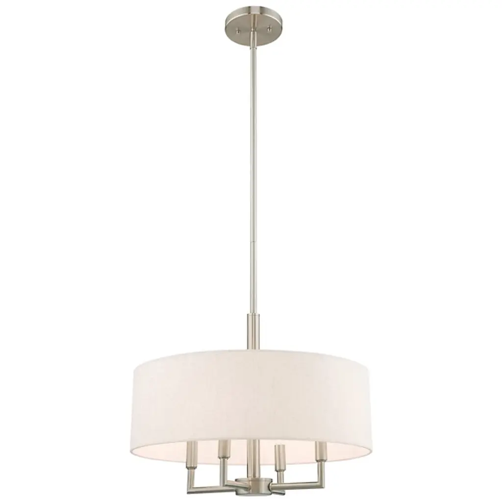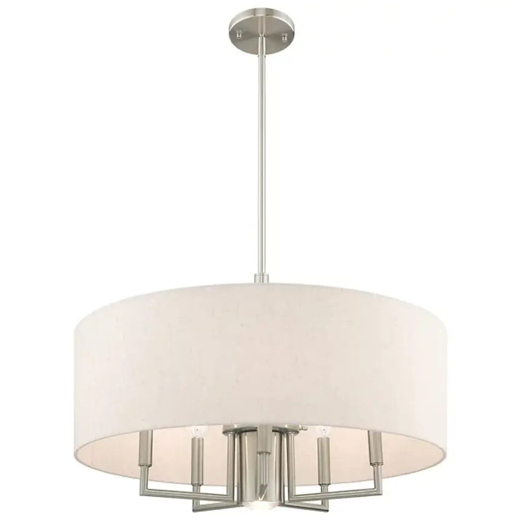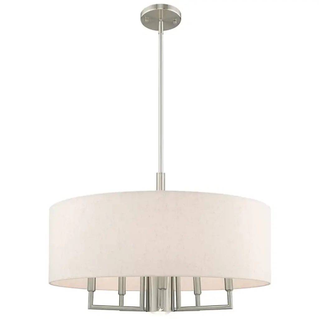 Expand your interiors with the bright light and sculptural design of the Maureen Chandelier from Alder & Ore. This artful, open design descends from a low-profile disc canopy along a telescoping steel rod that drops to a rounded hub below. This hub secures a series of up-angled arms that support damp-listed lamping, while a drum shade of hardback fabric extends down around them, capturing direct glare from the sides and softening it into a pleasing ambiance.