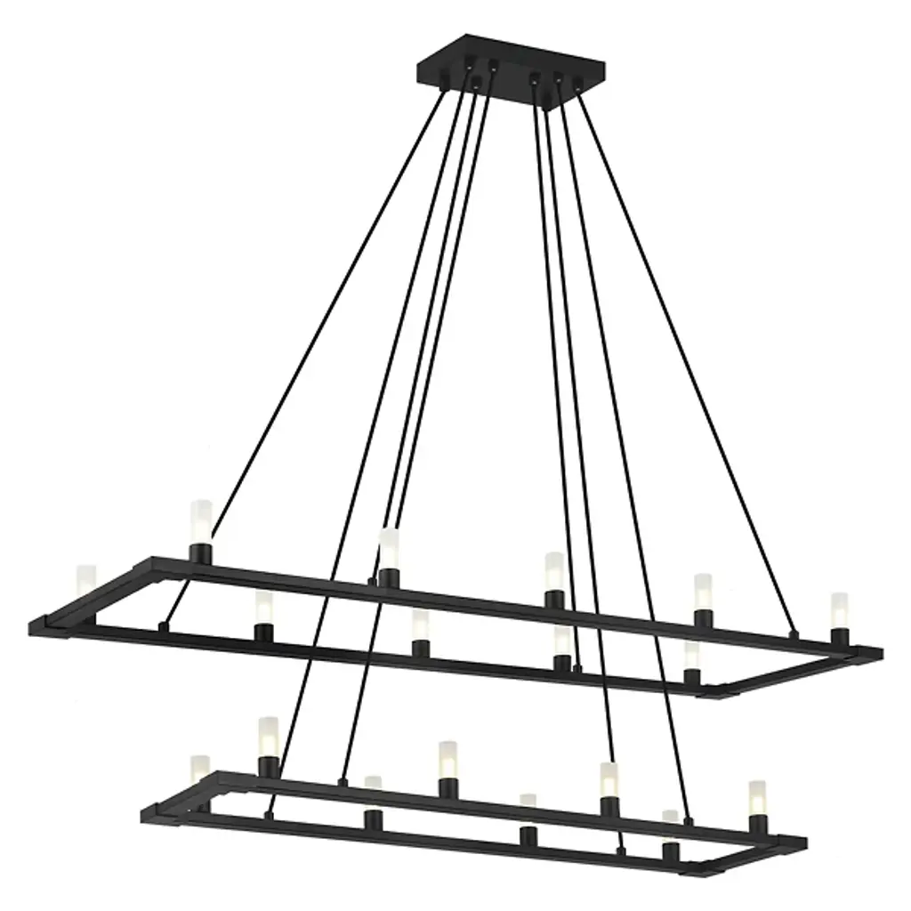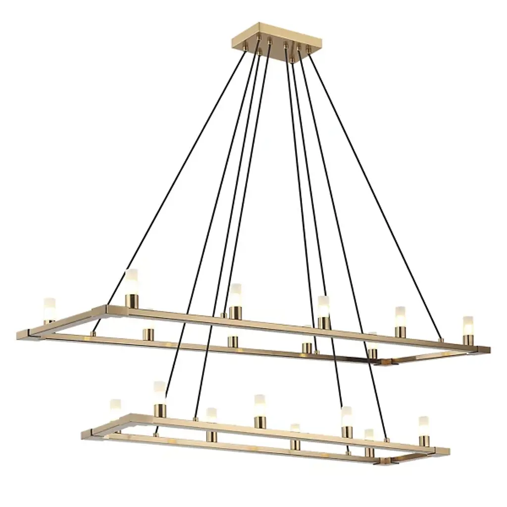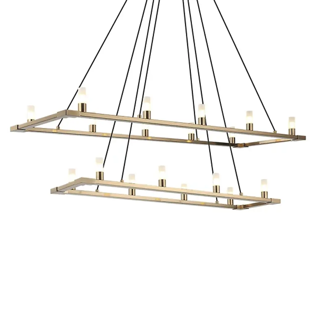 The Maurer Double Chandelier from Alder & Ore delivers the statement one's after in the living, kitchen, or dining space. Its pristine geometry fits right in with the modern or contemporary setting. The piece hangs dramatically with fine cords that create a radiating silhouette. The tiered rectangular frames below impress with sharp angles and a bold finish. Short cylindrical lamp holders on top pair with opal glass shades to suggest a candle-like display. While on, the bright shades enrich the space with warmth as a spacious glow.