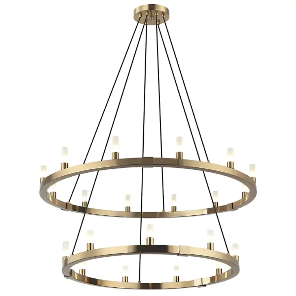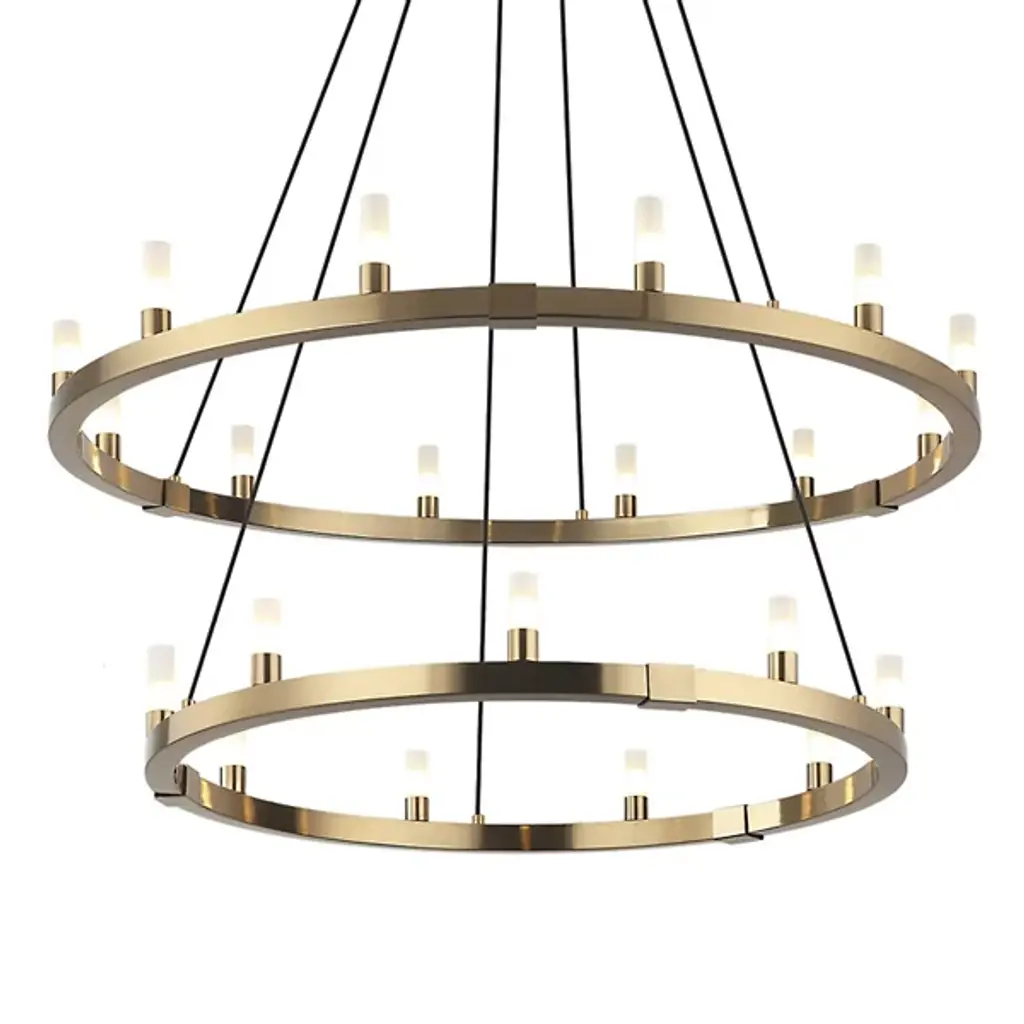 The Maurer Round Double Chandelier from Alder & Ore delivers an atmosphere and refined style. It delights with a clean silhouette from top to bottom that’s great in the foyer or over a dining table. Its cascading ring metal frame rounds out for an airy feel. Short cylindrical lamp holders and glass shades top the frame to create a candle-like display. The shades wow with rich golden hues as they send out an enveloping glow.