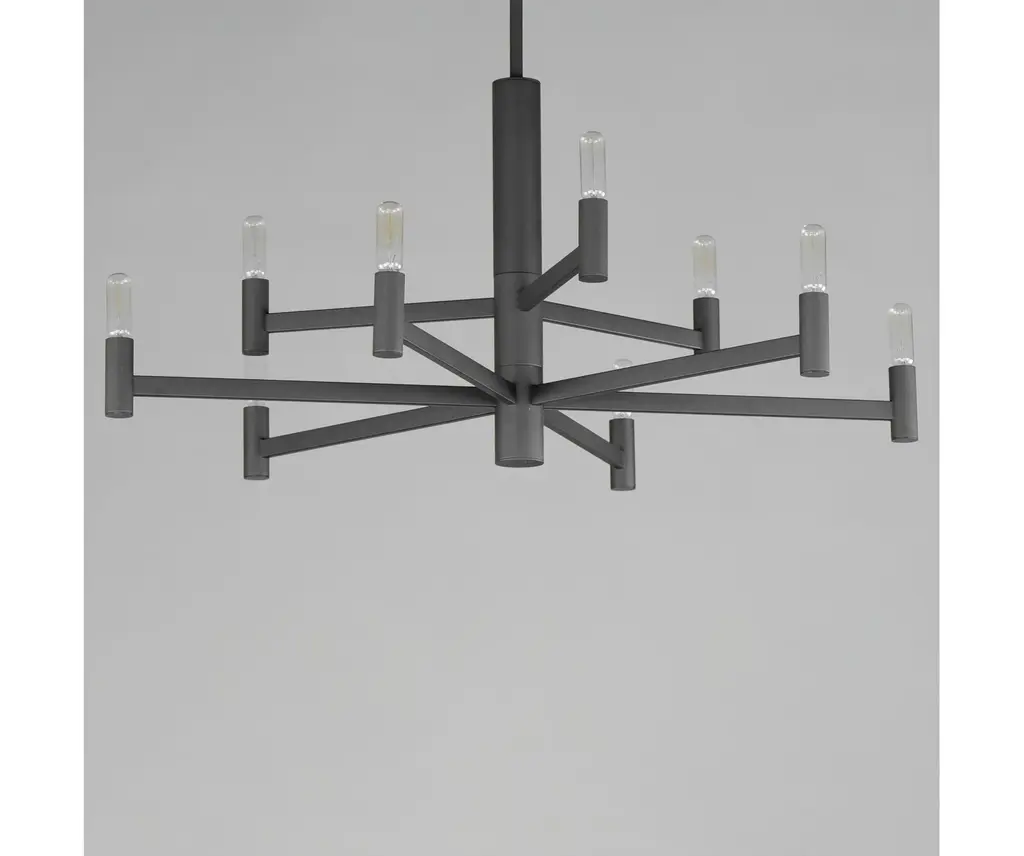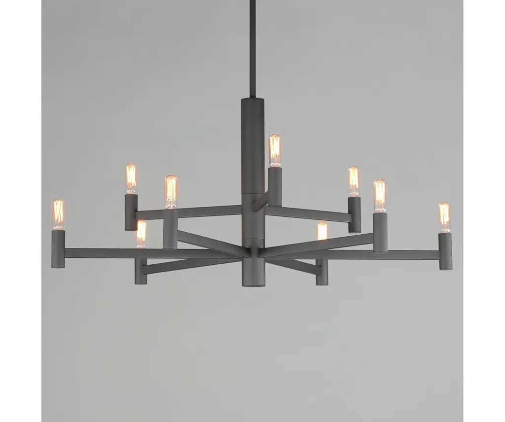 Features: Constructed from aluminum, glass, and steel Can be installed on vaulted ceilings Requires (9) candelabra (E12) 40 watt bulbs (not included) Capable of being dimmed Rated for installation in dry locations Title 20 compliant Covered by Maxim's 2 year limited manufacturer warranty Dimensions: Height: 15-1/2" Minimum Height: 17-1/2" Maximum Height: 60" Width: 33-1/2" Depth: 33-1/2" Product Weight: 7.7 lbs Wire Length: 120" Canopy Height: 1/2" Canopy Width: 4-3/4" Canopy Depth: 4-3/4" Electrical Specifications: Max Wattage: 360 watts Number of Bulbs: 9 Watts Per Bulb: 40 watts Bulb Base: Candelabra (E12) Voltage: 120 volts Bulbs Included: No