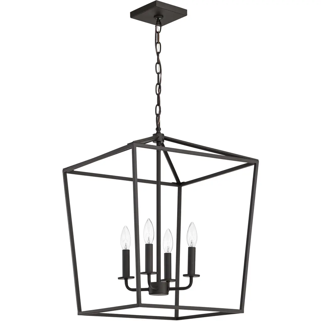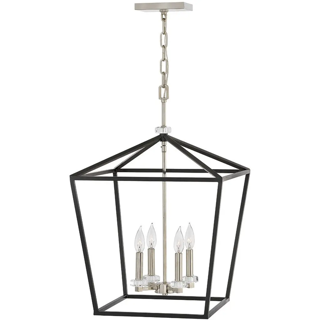 Open air frames finished in Black with Polished Nickel accents makes a simplistic yet dramatic statement for any interior design. Larger scale pieces fill up space without breaking the budget. Canopy Included: Yes Canopy Diameter: 5.00 Chain Length: 36.00 Material: Steel, Finish Color: Textured Black/Polished Nickel, Width: 12", Height: 18", Length: 12", Hanging Method: Chain, Chain Length: 36", Lamping Type: Incandescent, Number Of Bulbs: 4, Wattage: 240 Watts, Dimmable: No, Moisture Rating: Dry Rated