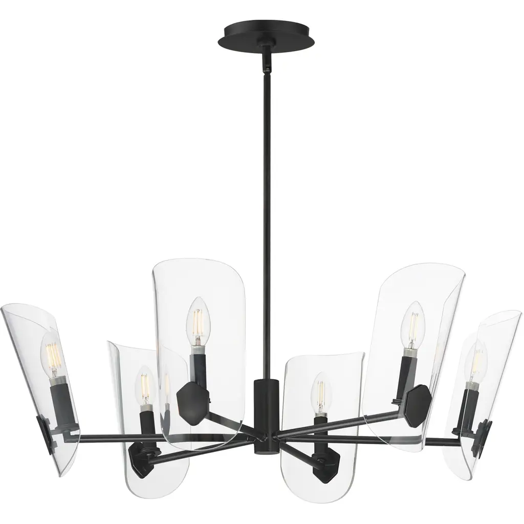 A Coat of Arms in curved Clear glass shades bevel cut and shaped to resemble traditional shields radiates off slender tubular arms. The streamlined design takes on a transitional approach with imaginative details that carries through to the concept for the wall sconce. Available 2 sizes of chandelier and a single light wall sconce in either Matte Black or Natural Aged Brass.